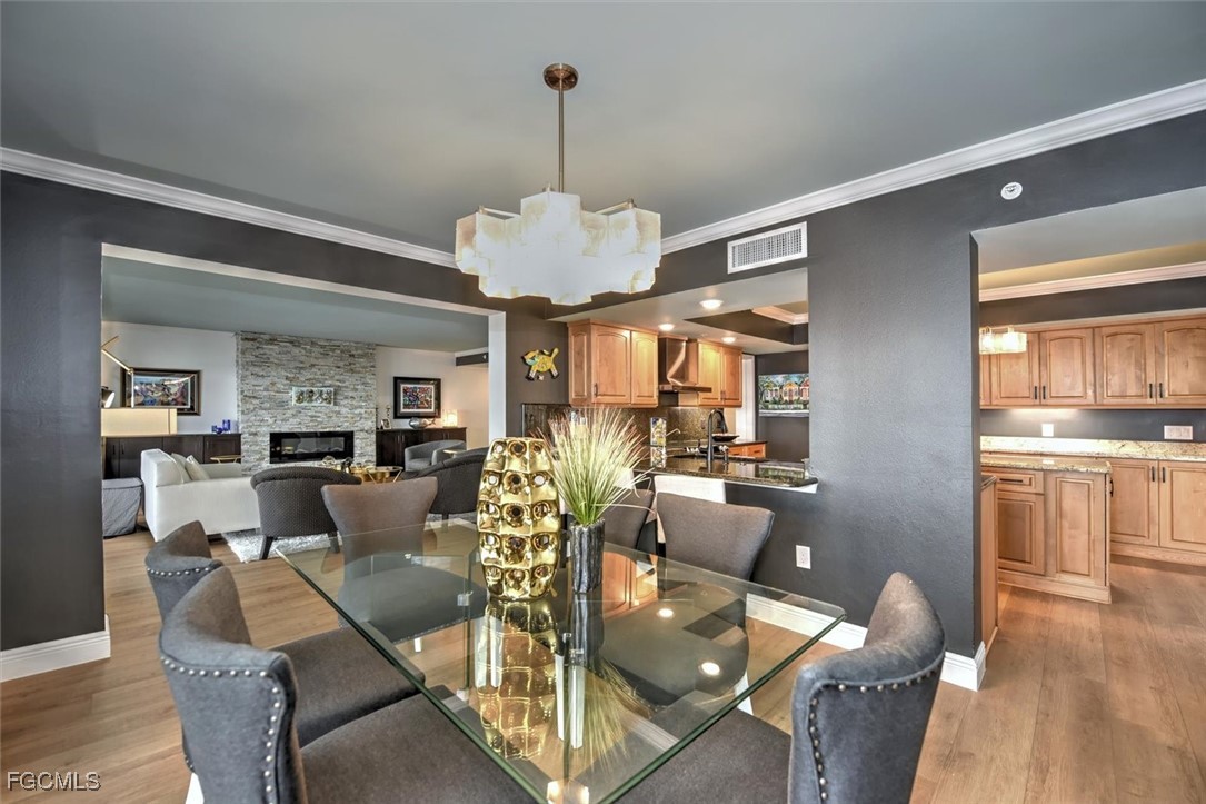 Known as the Great Dame of the River POINTE ROYALE is an upscale 24/7 guard gated community located on the banks of the Caloosahatchee River that boasts the BEST water views in all of Downtown Fort Myers! This property offers over 2000+ SF of luxury waterfront living. Upon entry into the unit, your eyes will immediately be drawn by the expansive water views and over 600+ SF of outdoor living space to enjoy. The unit has been renovated starting with wide plank flooring, crown molding and hurricane impact glass! The Living Room is perfect for entertaining with a floor to ceiling textured limestone fireplace. Enjoy more stunning water views from the gourmet kitchen equipped with custom cabinetry, granite counters, one-piece backsplash. The ensuite bathroom features high end fixtures and finishes including Italian Porcelain Tile, dual vanities with LED backlit mirrors, and tons of storage! NEWER mechanics throughout the unit give you peace of mind! This unit does not lack for custom-built storage. **For the BOATING ENTHUSIAST**...enjoy the opportunity to dock your boat outside the Condo. WALKING DISTANCE to the Downtown area for plenty of Restaurants, Shopping, Arts!