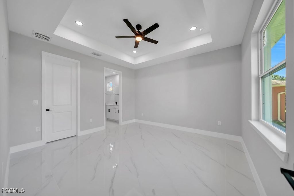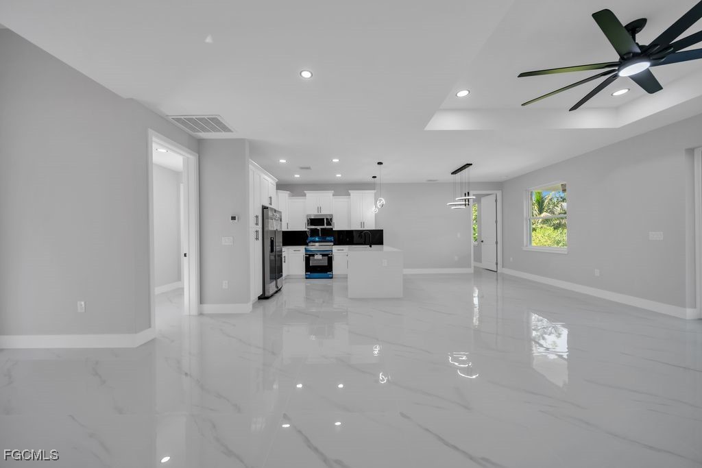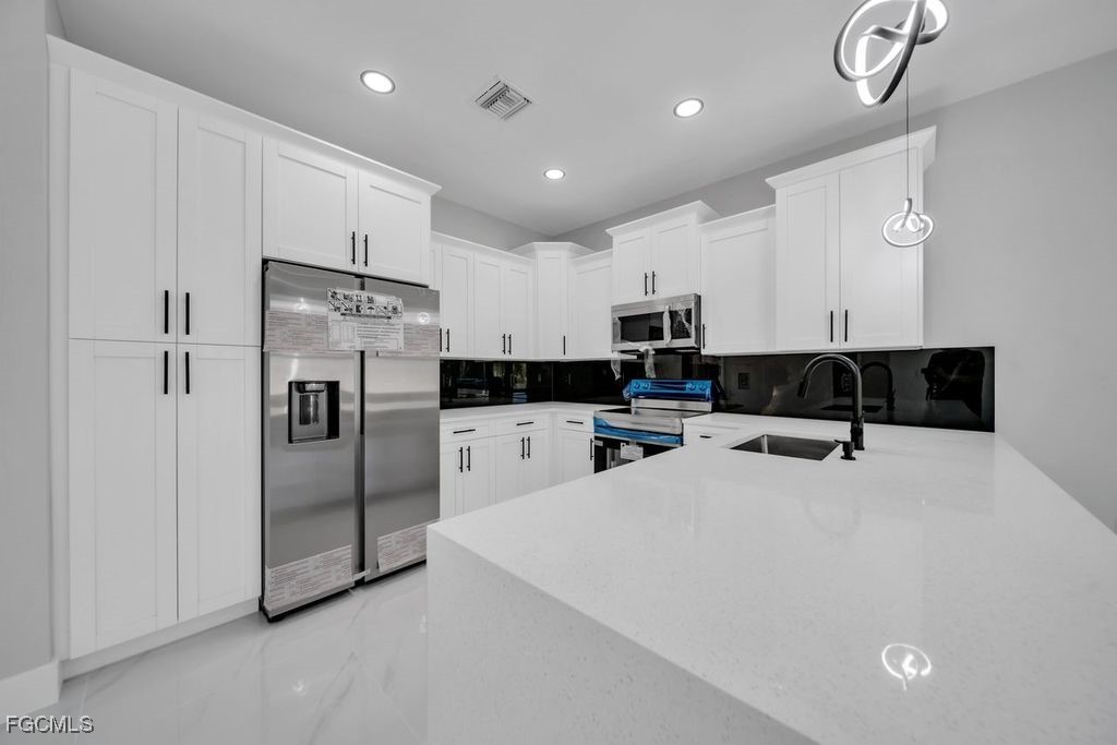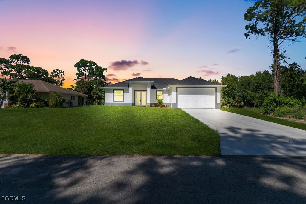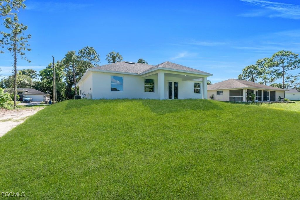 Welcome to an exceptional new construction residence in the heart of Lehigh Acres, where contemporary luxury meets thoughtful design. This impeccably crafted home presents an enticing blend of sophistication and practical living spaces, offering three bedrooms and two well-appointed bathrooms. Step through the elegant double-door entry into a home that exemplifies modern Florida living. The great room design creates an impressive sense of openness, seamlessly connecting living spaces and establishing an ideal environment for both entertaining and daily life. The heart of this home is its beautifully conceived kitchen, featuring a traditional eat-in design enhanced by a generous island that doubles as a casual dining space. Culinary enthusiasts will appreciate the complete suite of new stainless steel appliances, including a refrigerator, dishwasher, microwave, and range. The kitchen's sophisticated aesthetic is elevated by premium quartz countertops, which extend into the bathrooms, maintaining a cohesive design throughout. The primary bedroom suite stands as a private retreat, boasting a spacious walk-in closet and an elegant bathroom with dual sinks. Two additional bedrooms offer comfortable accommodations for family members or guests, while the second full bathroom ensures convenience for all. Throughout the residence, premium porcelain tile flooring creates a seamless flow, reflecting light and contributing to the home's bright, airy atmosphere. All windows feature stylish zebra blinds, adding a touch of modern elegance while offering versatile light control. Safety and durability were paramount in the design, with impact windows and doors providing peace of mind during Florida's seasonal weather. The covered lanai extends the living space outdoors, offering a serene setting for morning coffee or evening relaxation. Professional landscaping enhances the front yard, creating immediate curb appeal and a welcoming approach to your new home. This residence's location proves equally impressive, positioned just blocks from Lee Boulevard and offering swift access to Fort Myers. The neighborhood boasts exceptional educational opportunities, with schools and a public library nearby. Daily conveniences are equally accessible, with shopping and dining options within easy reach. Notably, this property sits outside designated flood zones, offering additional peace of mind. This new construction represents more than just a house; it's an opportunity to embrace a lifestyle where comfort meets convenience, where modern amenities blend seamlessly with practical living, and where every detail has been carefully considered to create an exceptional living experience. Don't let this remarkable opportunity pass you by - schedule your private showing today and step into your future home.