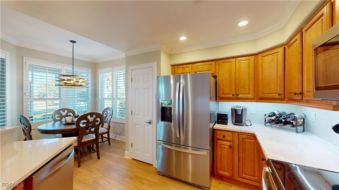 Welcome to Lexington Country Club's "Nottingham" carriage home with a one car garage. This property has been completely remodeled and is in pristine condition. New porcelain tile planks throughout except for 2 of the 3 bedrooms where there is carpet. New kitchen cabinets, countertop, all appliances, and lighting. New bathroom cabinets, countertops, shower, and lighting. Hurricane impact windows throughout. Electric shutters in the lanai. Plantation shutters throughout. Crown molding. All doors have been replaced along with the door trim and baseboard. New AC in 2024. New water heater in 2023. Enjoy looking at the view of the 11th and 12th holes and pond from the large lanai. New screen door in the lanai with no-seeum screens. The Lexington community offers all the features of an active lifestyle with the 18-hole championship golf course, 12 lighted tennis courts with designated pickleball courts, 6 heated swimming pools, a fitness center with onsite group classes, lending library, tiki bar/restaurant, beach area, clubhouse restaurant, 3 bocce courts; onsite coffee shop. You will be wowed by the beautifully maintained grounds and appreciate the onsite 24 hr security. The community also offers special events like Music Monday at the Island Club, Bingo at the Clubhouse and an abundance of clubs to join depending on your interests. Offered mostly furnished so you can move right in and start enjoying the fabulous Lexington lifestyle! Just minutes from the beaches, RSW Airport, shopping, dining, and hospitals. Don’t forget to look at the virtual tour--either play it or click to walk-through each room.