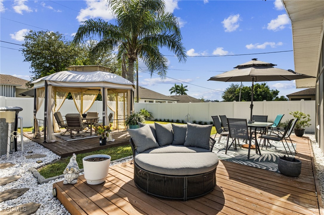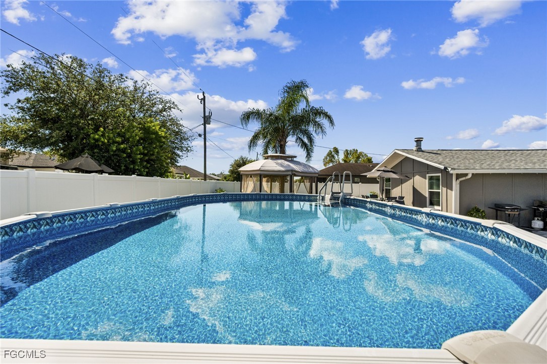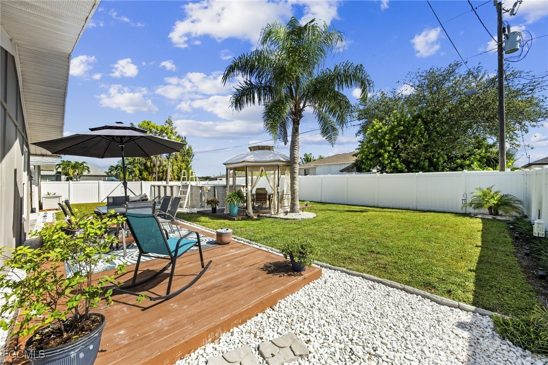 The backyard offers complete privacy with a full fence enclosing the entire space. This cozy, quaint outdoor oasis features plenty of seating, making it perfect for relaxing or entertaining. Enjoy evenings under the charming gazebo, whether you dress it up with string lights or keep it simple. The spacious deck provides additional seating, ideal for hosting gatherings. Add a firepit for extra ambiance, and unwind in your above-ground pool, the perfect finishing touch for this private retreat.