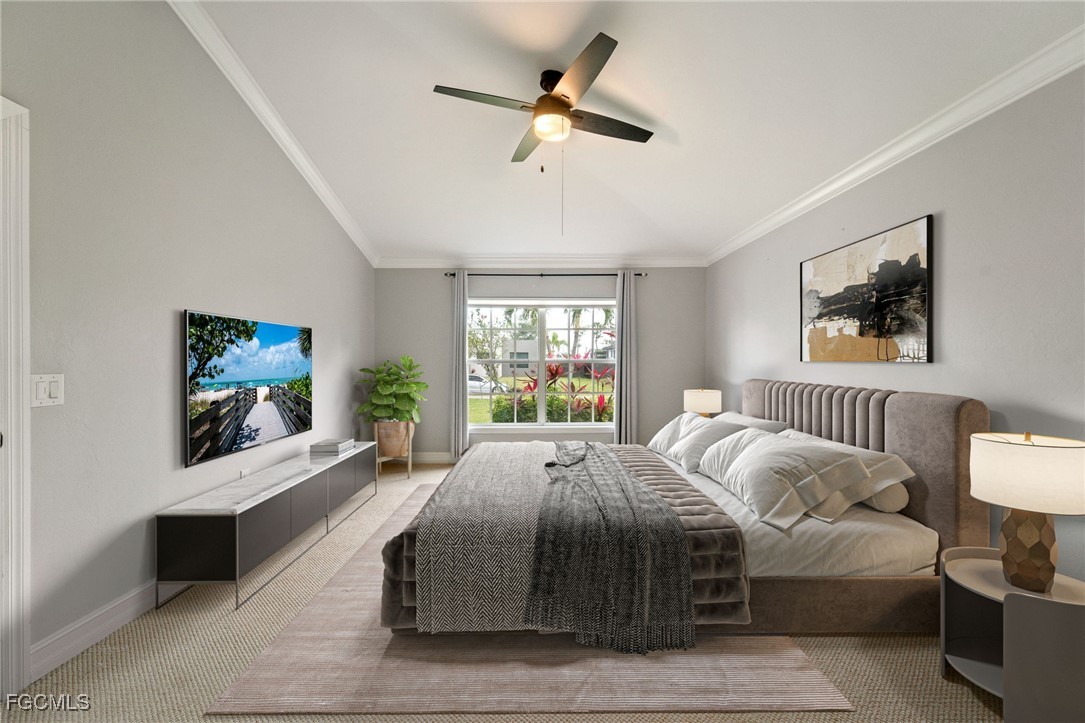 The large master bedroom has crown molding, dual closets, and a spa-inspired bathroom showcasing a glass-enclosed tiled shower and a separate soaking tub. Large tile flooring runs throughout the main living areas, as well as 5-inch baseboards offering style, durability, and easy maintenance.