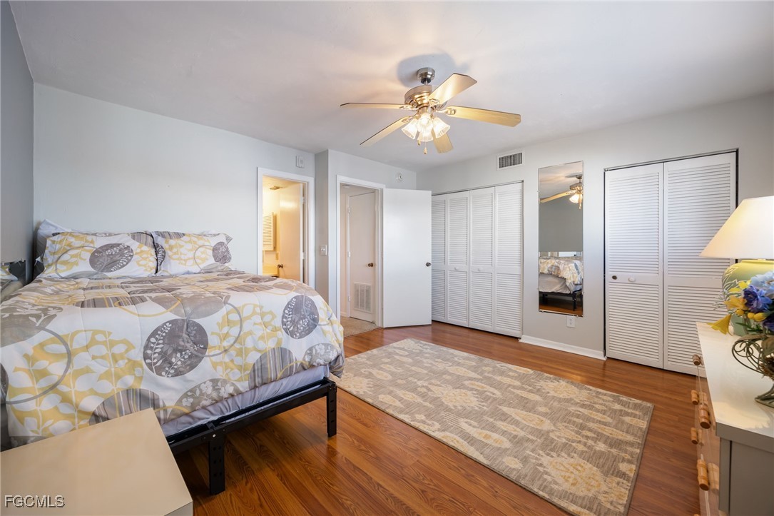 The light-filled interior features diagonal tile flooring, a stylish kitchen with granite countertops, mosaic backsplash, and sliders opening to a screened lanai overlooking peaceful canal waters. Upstairs, two spacious en-suite bedrooms offer laminate wood floors, with one featuring its own private screened lanai, ideal for relaxing and enjoying the evening breeze.