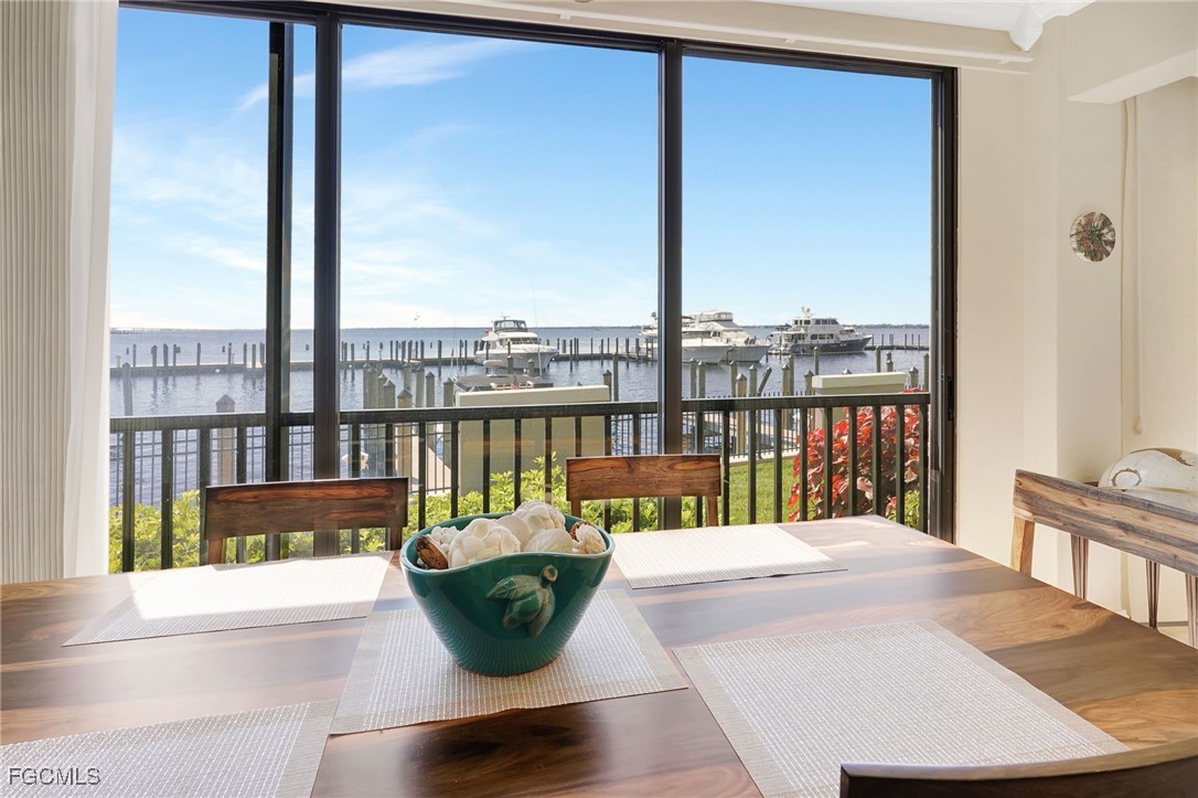 Welcome to Pointe Royale! This condo boasts additional square footage that enhances both comfort and versatility, offering expanded living and entertaining space rarely found. Step inside to discover elegant travertine flooring flowing seamlessly throughout the home, setting a tone of timeless sophistication. The expansive kitchen is a true standout, offering abundant cabinet and pantry storage—perfect for both everyday living and entertaining. Custom built-in closets and thoughtfully designed storage solutions maximize functionality without sacrificing style. And with balconies at nearly every turn, natural light and fresh air are always within reach, creating a breezy, open feel that complements the waterfront lifestyle. Wait until you see this view- The panoramic views of the Caloosahatchee River and Pincher's Marina create a serene, ever-changing backdrop that will make your jaw drop. Whether you're sipping morning coffee or hosting sunset gatherings, the waterfront scenery is simply breathtaking. Speaking of breathtaking, wait until you see the sunsets..