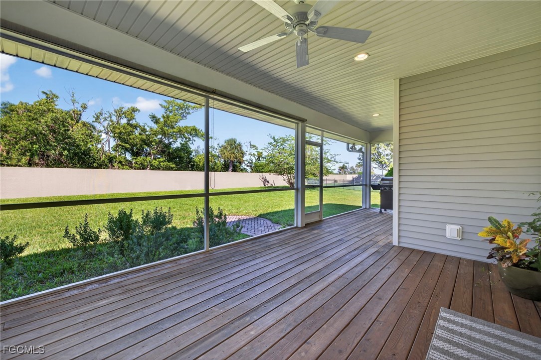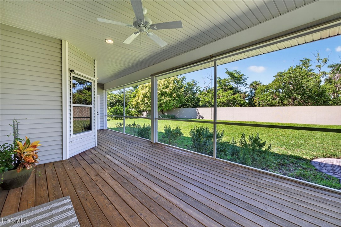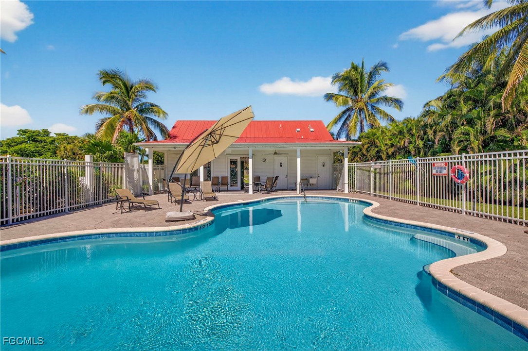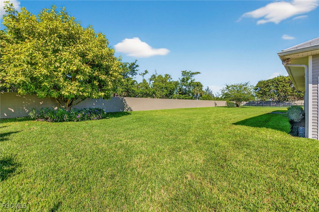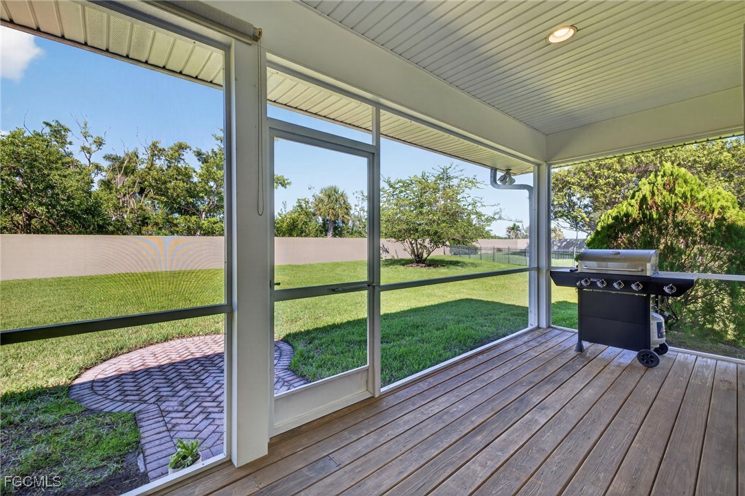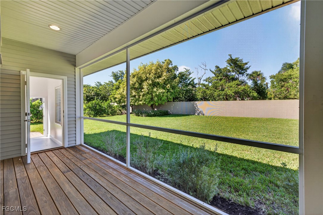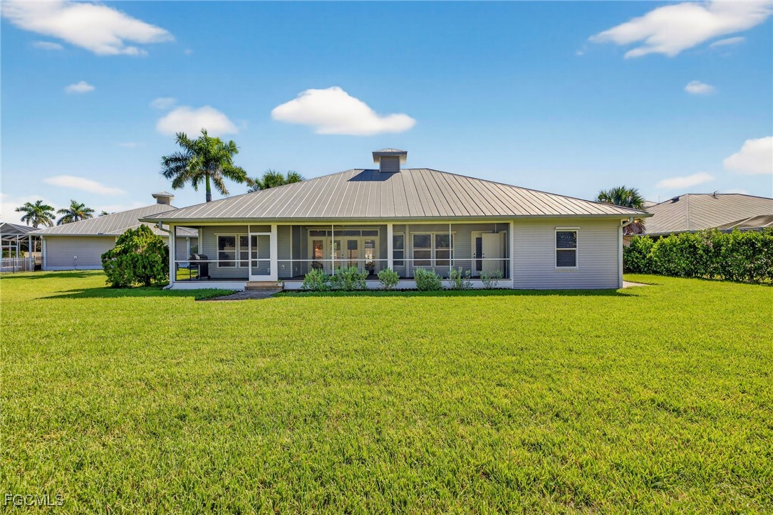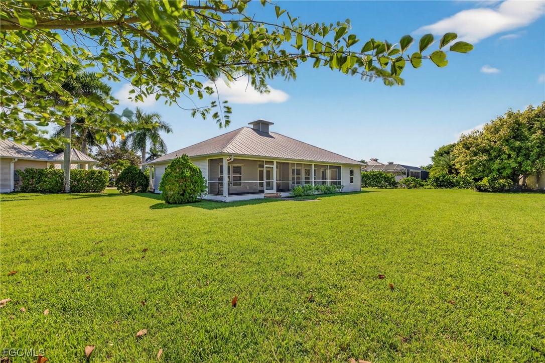 The Caloosa Creek community, with easy access to Gulf beaches, features charming Olde Florida-style homes, with a friendly and relaxed atmosphere. Amenities include a well-appointed clubhouse with a heated pool, tennis/pickleball courts, playground and sidewalks throughout. This well-maintained home, situated on one of the largest lots .64 acres in the back corner of the community, offers a quiet and private space. The expansive backyard offers room for your dream pool and additional living space. This Daniel Wayne designed home has an open front porch as well as a screen enclosed back porch that runs the length of the house. Tile floors throughout, French doors, tray ceilings, and electric fireplace in great room. This 3 bedroom and 2.5 bath, split floor plan is perfect for family and entertaining. The primary suite offers a large walk-in closet as well as a tray ceiling. The primary bath has a walk-in glass shower, soaking tub and double sinks. The guest rooms have a Jack and Jill bath with double sinks. There is a formal dining room, breakfast nook, breakfast bar, kitchen with stainless steel appliances, pantry and a built-in desk. The extended paver driveway leads to a sideload two-car garage with plenty of room for guest parking. In addition, there is a workshop with a window for natural light, all under roof/trusses. All windows have been wired for an alarm system, the metal roof has all new stainless-steel screws, 4 exterior hose spigots, irrigation system and well, 6 extra waterproof exterior electrical outlets, and hurricane shutters for all windows and doors. This home sits at 9 ft. above sea level and did not have any interior flooding or insurance claims due to prior hurricanes. Caloosa Creek is a highly desirable and convenient location near Sanibel/Captiva Islands with upscale shopping and fine dining.