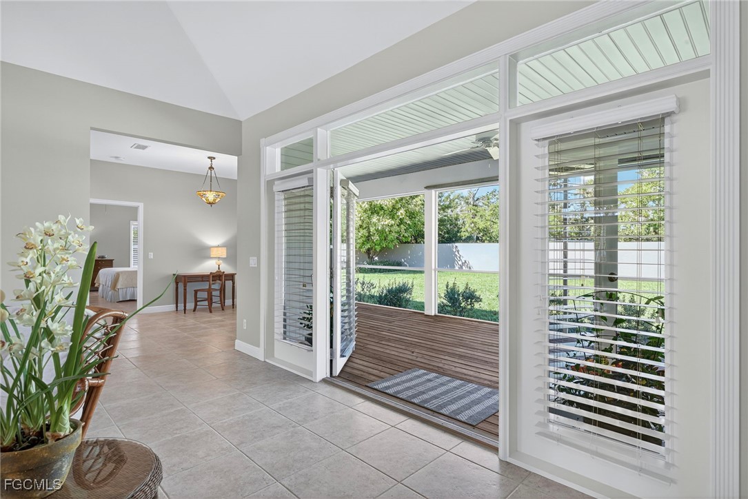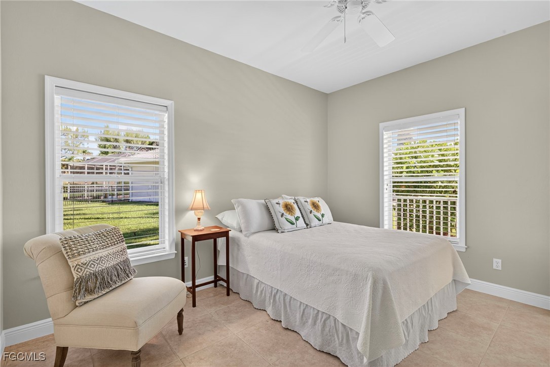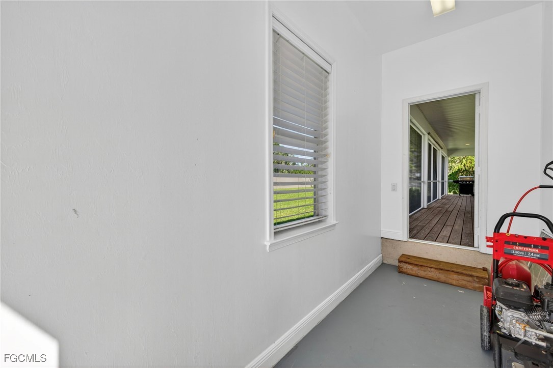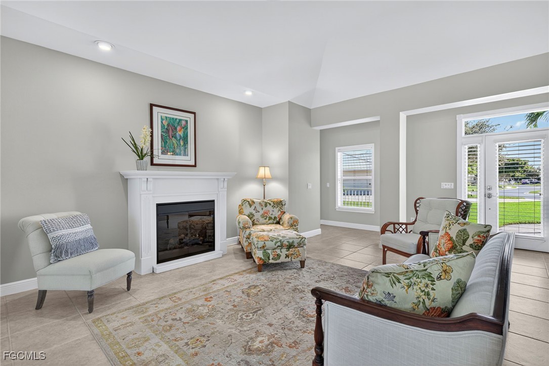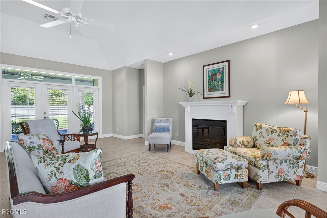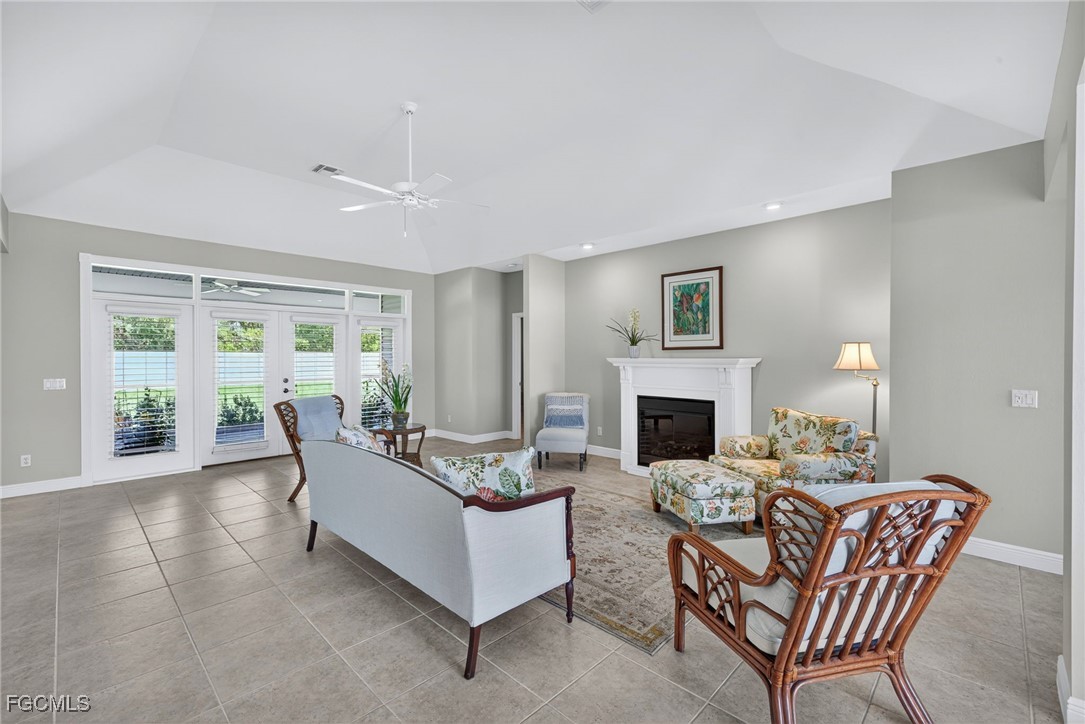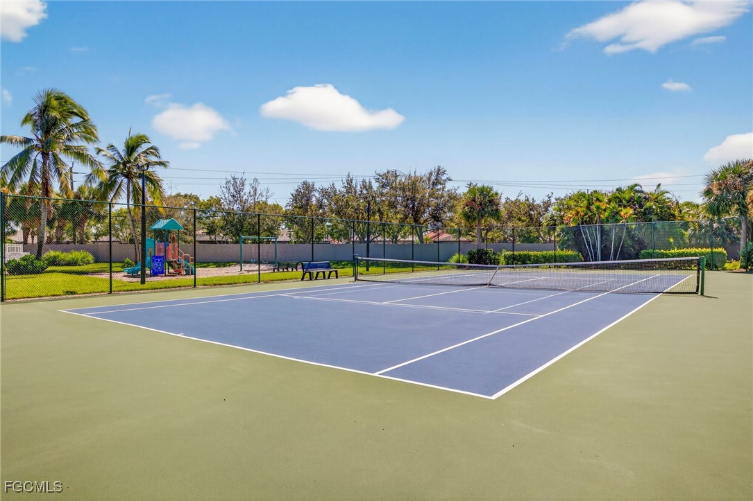 The Caloosa Creek community, with easy access to Gulf beaches, features charming Olde Florida-style homes, with a friendly and relaxed atmosphere. Amenities include a well-appointed clubhouse with a heated pool, tennis/pickleball courts, playground and sidewalks throughout. This well-maintained home, situated on one of the largest lots .64 acres in the back corner of the community, offers a quiet and private space. The expansive backyard offers room for your dream pool and additional living space. This Daniel Wayne designed home has an open front porch as well as a screen enclosed back porch that runs the length of the house. Tile floors throughout, French doors, tray ceilings, and electric fireplace in great room. This 3 bedroom and 2.5 bath, split floor plan is perfect for family and entertaining. The primary suite offers a large walk-in closet as well as a tray ceiling. The primary bath has a walk-in glass shower, soaking tub and double sinks. The guest rooms have a Jack and Jill bath with double sinks. There is a formal dining room, breakfast nook, breakfast bar, kitchen with stainless steel appliances, pantry and a built-in desk. The extended paver driveway leads to a sideload two-car garage with plenty of room for guest parking. In addition, there is a workshop with a window for natural light, all under roof/trusses. All windows have been wired for an alarm system, the metal roof has all new stainless-steel screws, 4 exterior hose spigots, irrigation system and well, 6 extra waterproof exterior electrical outlets, and hurricane shutters for all windows and doors. This home sits at 9 ft. above sea level and did not have any interior flooding or insurance claims due to prior hurricanes. Caloosa Creek is a highly desirable and convenient location near Sanibel/Captiva Islands with upscale shopping and fine dining.
