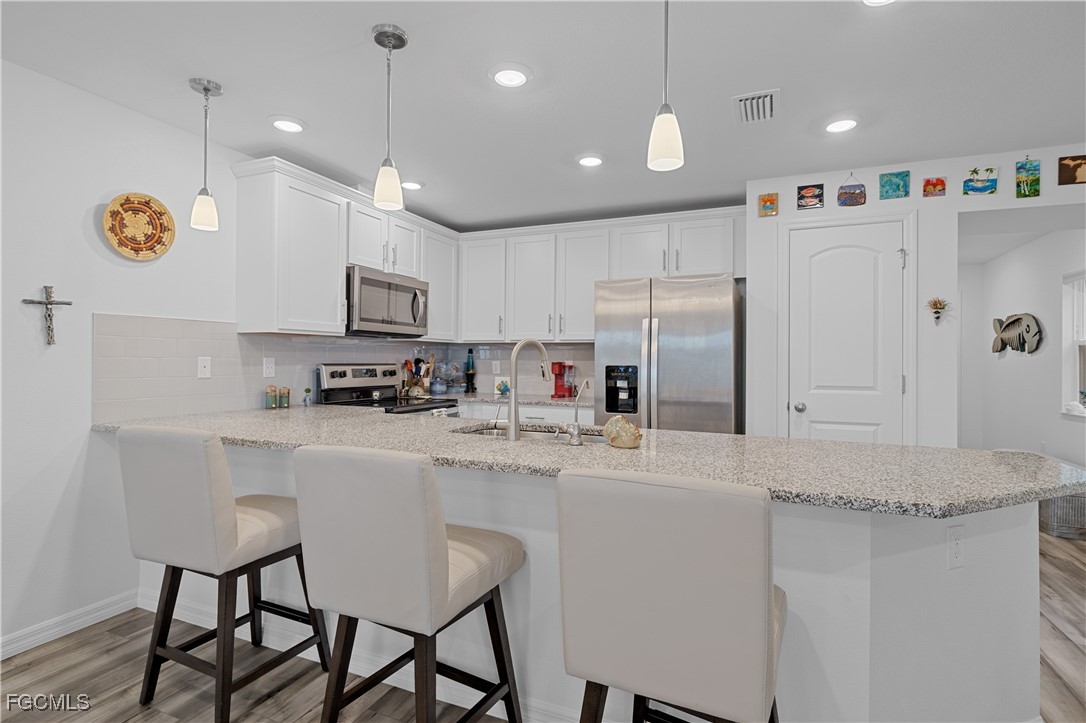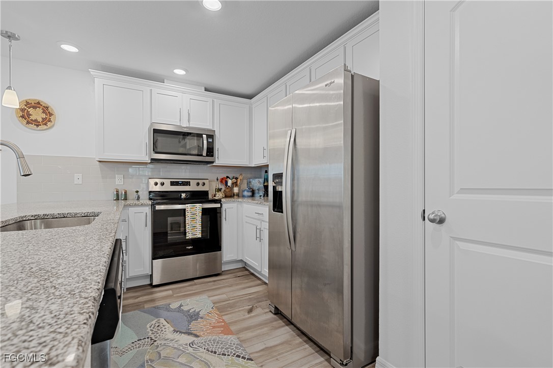 Experience the perfect blend of modern style and peaceful living with this beautiful lakefront townhome in the gated community of Bayshore Commons. Built in 2023, this 3-bedroom, 2.5-bath home offers a bright, inviting atmosphere and a layout designed for both comfort and convenience. The stunning kitchen features crisp white cabinetry, granite countertops, pendant-lit breakfast bar, stainless steel appliances, and a pantry—opening seamlessly to the spacious great room, ideal for everyday living and entertaining. Upstairs, you’ll find a generous master suite with an oversized walk-in closet and a beautifully appointed master bath featuring double sinks and walk in shower. Two comfortable guest bedrooms share a stylish full bath, while the conveniently located second-floor laundry makes chores a breeze. A powder bath is thoughtfully placed on the first floor for guests. Step out to your private screened lanai, complete with vinyl windows and its own air-conditioning system—creating a tranquil year-round retreat to relax and enjoy the peaceful lake views. For added peace of mind, the home also includes accordion shutters.