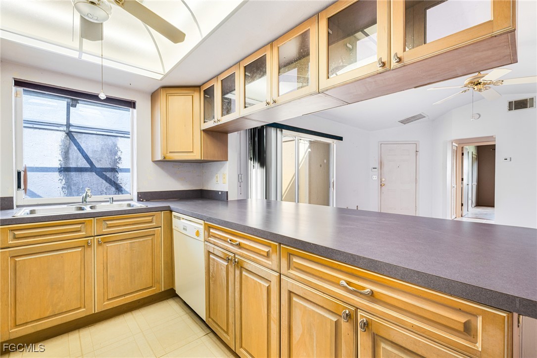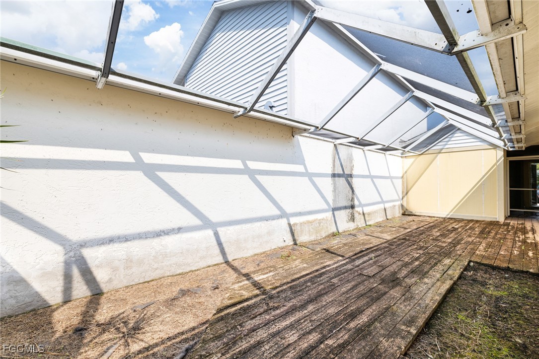 Spacious 2-bedroom, 2-bath end-unit villa in the desirable Cypress Keep community, offering privacy, convenience, and value. This single-story residence features an attached garage, a private courtyard-style entry with storage, and a screened lanai that extends the living space outdoors. The open great room design includes cathedral ceilings and double sliders leading to an expansive 40x13 screened patio, fully enclosed by a privacy wall for secluded outdoor enjoyment. Both bedrooms feature cathedral ceilings, and the split-bedroom layout enhances privacy. The kitchen offers raised-panel cabinetry, a pantry, a pass-through window to the patio, and an adjacent laundry nook for added convenience. Hurricane shutters provide peace of mind and protection during storm season.