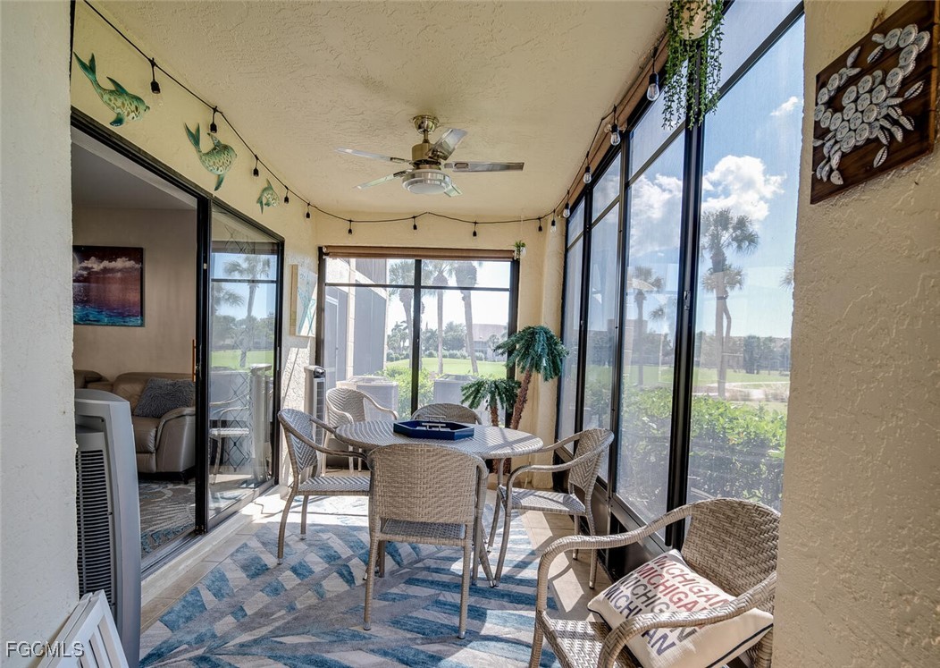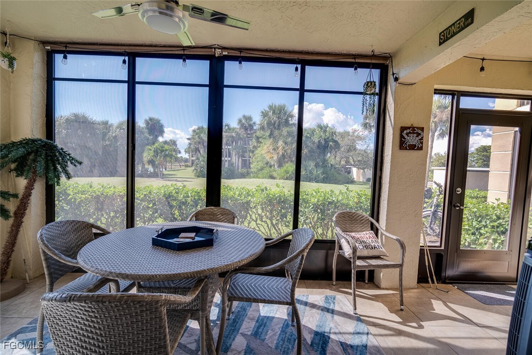Welcome to Kelly Greens Golf & Country Club — where resort-style living meets everyday comfort. This first-floor 2-bedroom, 2-bath home pairs golf course and lake views with an unbeatable location just minutes from Sanibel Island and Fort Myers Beach. Turnkey and move-in ready, it’s designed for effortless living. The open layout is *enhanced by custom raised ceilings,* creating a bright, airy feel that flows into a screened, tiled lanai — the perfect spot for morning coffee or sunset views over the fairway. The kitchen blends style and function with stainless steel appliances, generous cabinetry, and a breakfast bar ideal for casual dining or entertaining. The primary suite offers a peaceful retreat with a spacious walk-in closet, en-suite bath, and tranquil views. A comfortable guest room adds flexibility for visitors or a home office, while conveniences like covered parking and exterior storage make everyday living easy. Life at Kelly Greens means access to a newly renovated 18-hole championship golf course, tennis and pickleball courts, a heated pool and spa, fitness center, and two on-site restaurants — from relaxed bites at The Grille Room to refined dining at The Osprey. Whether you’re seeking a seasonal escape or a year-round residence, this home delivers that signature Florida balance — laid-back luxury with a side of sunshine.