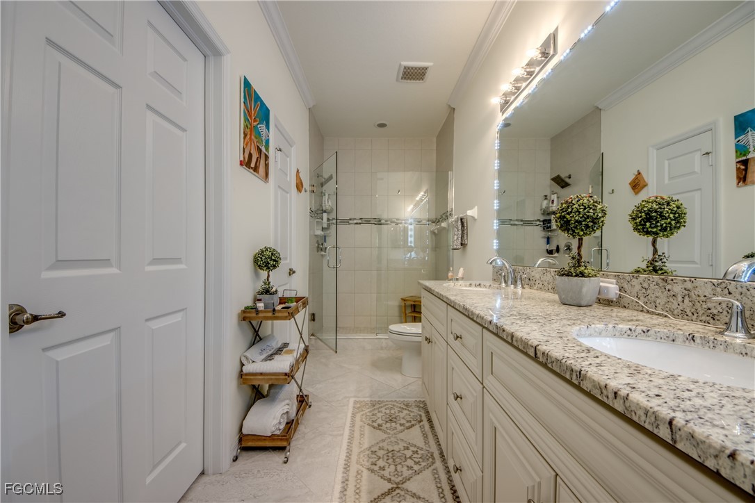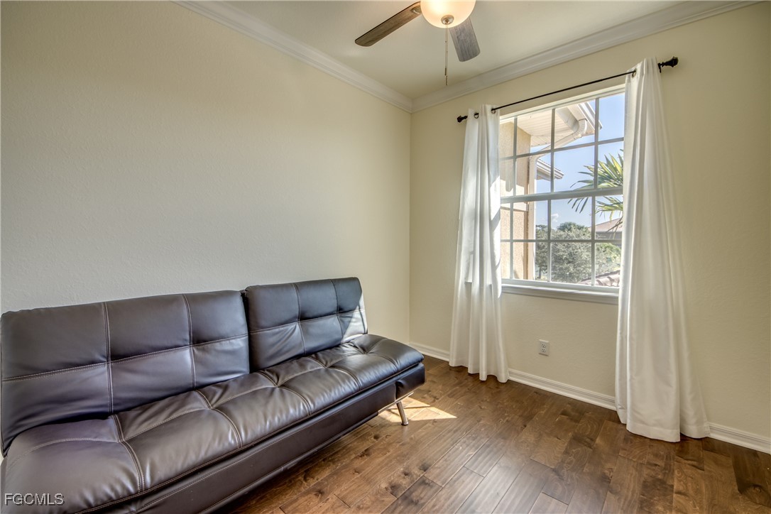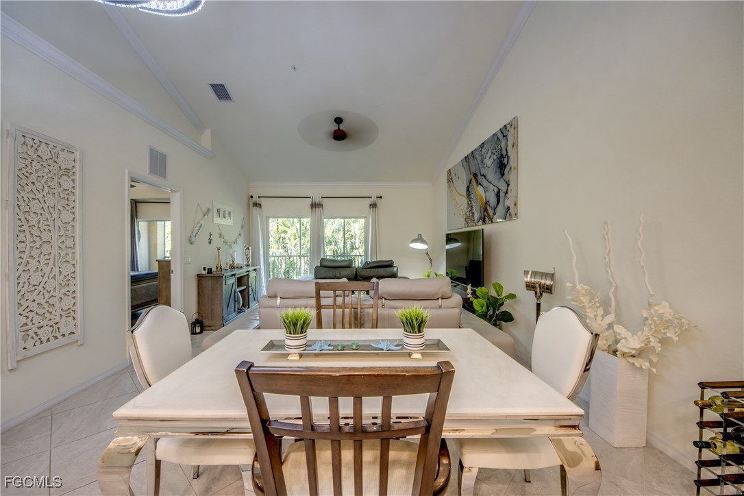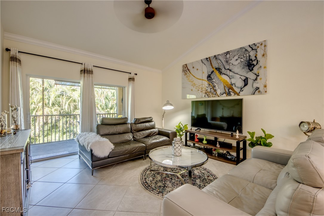 This beautifully appointed, bright and airy second-floor condo is located in the gated community of Casa di Fiori. Step inside to volume ceilings, crown molding and a spacious open layout designed for comfort and style. The kitchen features soft-close cabinetry, stainless steel appliances, ample counter space with room for barstools and the full height cabinets can be used as a pantry. A separate dining area flows seamlessly into the family room, ideal for entertaining. You’ll love the 24" x 24" diagonally set tile and laminate wood flooring throughout. The spacious primary suite offers a walk-in closet, linen closet, en-suite bath with dual sinks and a glass-enclosed, tiled walk-in shower. The guest bath includes its own linen closet and a tub/shower combo with glass-enclosure. Enjoy the oversized, screened-in lanai with access from both the living area and primary bedroom. It’s the perfect spot to savor your morning coffee or relax with evening TV (mounted TV conveys) while taking in peaceful views of lush landscaping. Additional highlights include hurricane-rated windows and manual shutters for the sliders, providing peace of mind. Casa di Fiori offers resort-style amenities: a heated pool, pickleball, tennis, bocce, shuffleboard, billiards, picnic areas with gas grills and tiki-style seating areas. Whether you’re looking for a quiet retreat or an active lifestyle, this community truly has it all! Located near plenty of shopping, airports, dining, entertainment and medical facilities. Schedule your showing today.