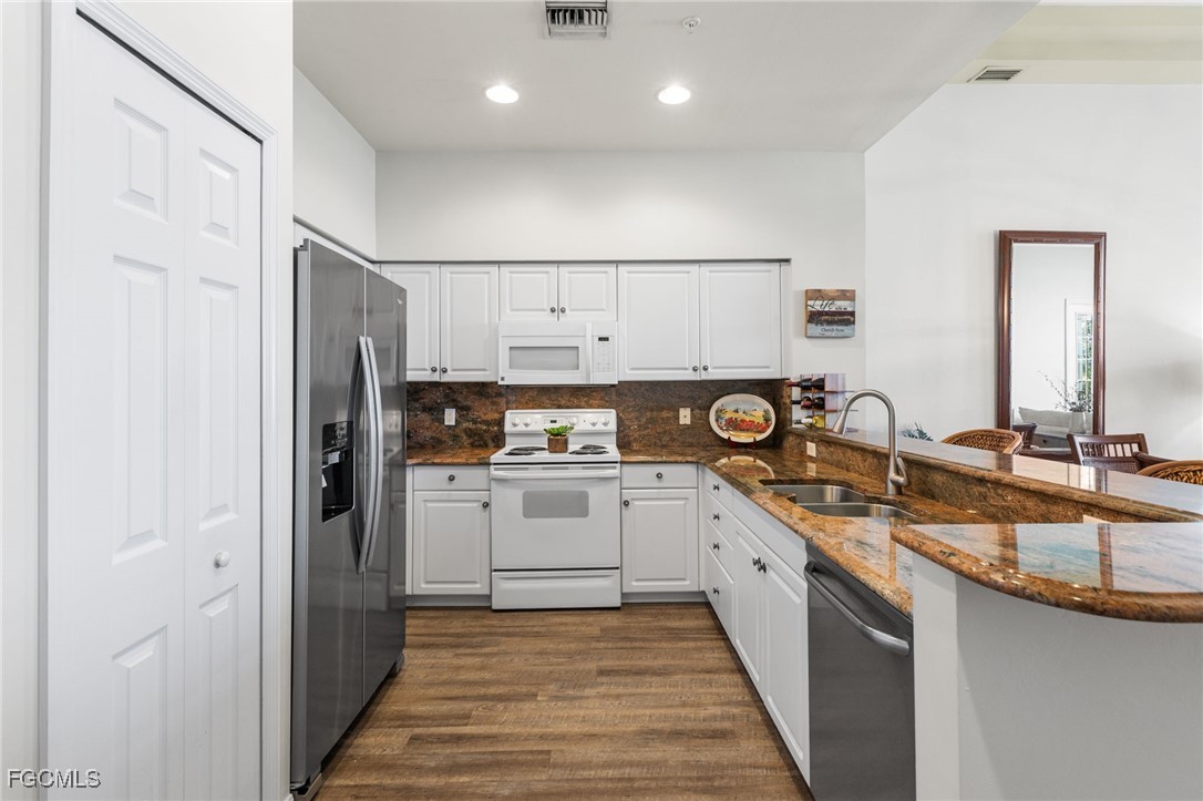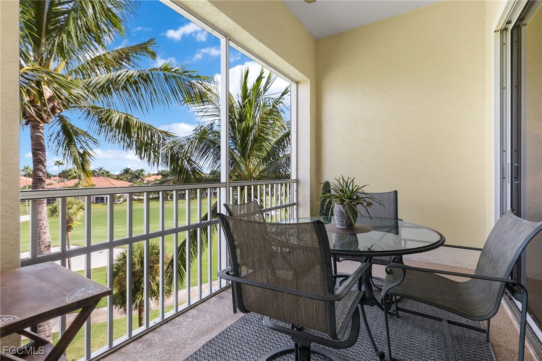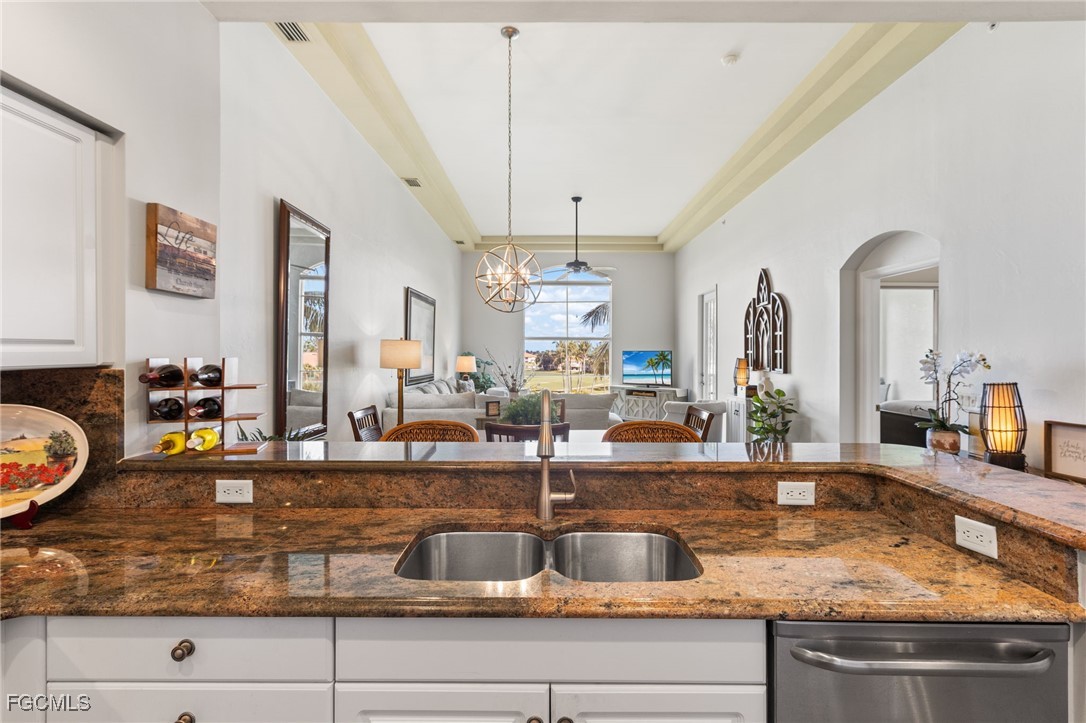 This top-floor CORTINA floor plan offers over 1400 sq. ft. of elegant living space with soaring 11-foot ceilings, double tray ceilings and breathtaking views of the 16th fairway and the shimmering lake beyond. The open-concept design is ideal for entertaining, featuring a kitchen with granite countertops, a breakfast bar, and stainless steel and white appliances.