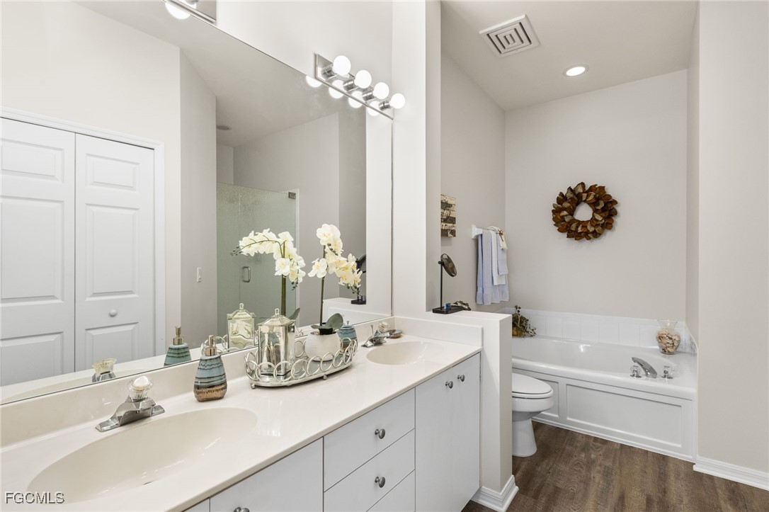 Enjoy the perfect balance of comfort and style with luxury vinyl plank as well as carpeting in the main living area, creating a warm, inviting atmosphere. The primary suite is a peaceful haven with an ensuite bathroom with a separate walk in shower with a seamless glass enclosure and a lovely garden tub. The primary suite also offers private lanai access - the perfect place to relax with your morning coffee or unwind after a day on the course.