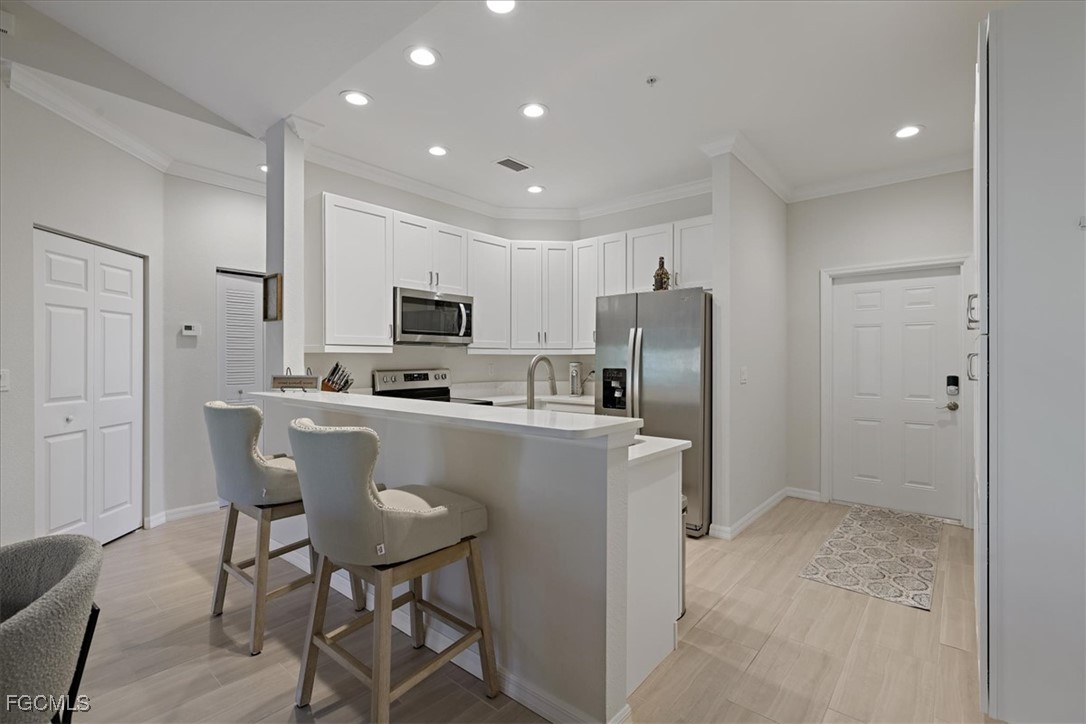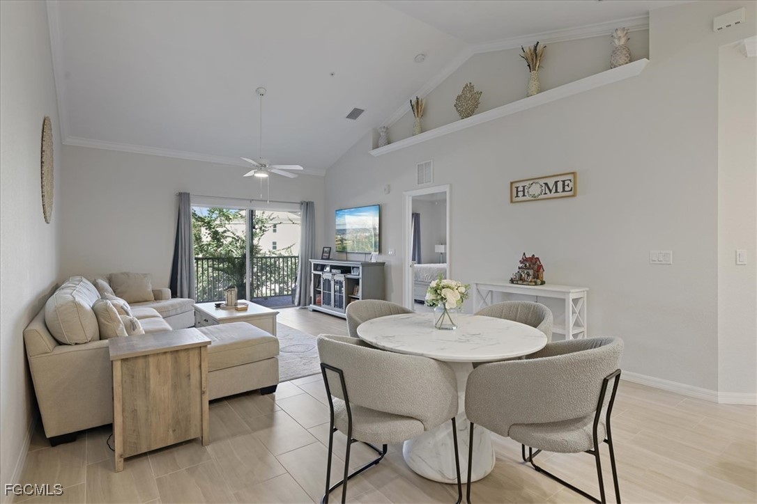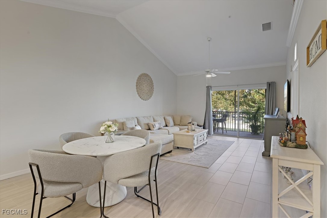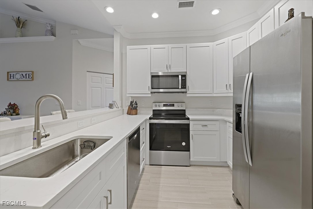 Discover modern Florida living in this like-new 3 bedroom, 2 bathroom condo located in a desirable gated community filled with resort-style amenities. This beautifully maintained second-floor unit includes a private garage and a screened lanai, offering comfort, style, and peace of mind, all in a no flood zone. Inside, you'll find tile flooring throughout, LED lighting, and elegant crown molding that enhance the home's bright, open layout. The kitchen features white shaker-style cabinets, quartz countertops, and stainless steel appliances, perfect for cooking, entertaining, and everyday living. Both bathrooms offer matching modern cabinetry and quartz surfaces for a cohesive, high-end look. Enjoy the privacy and security of a gated, amenity-rich community, complete with a clubhouse, fitness center, pool, and more. Conveniently located near shopping, dining, and top local attractions, this condo combines luxury and location in one incredible package. Whether you're looking for a primary residence, seasonal getaway, or investment property, this move-in ready condo has it all. Schedule your private showing today and experience the best of Florida condo living!