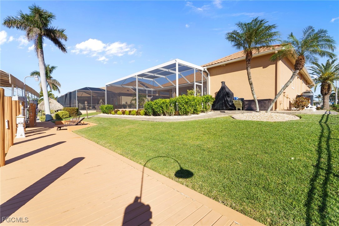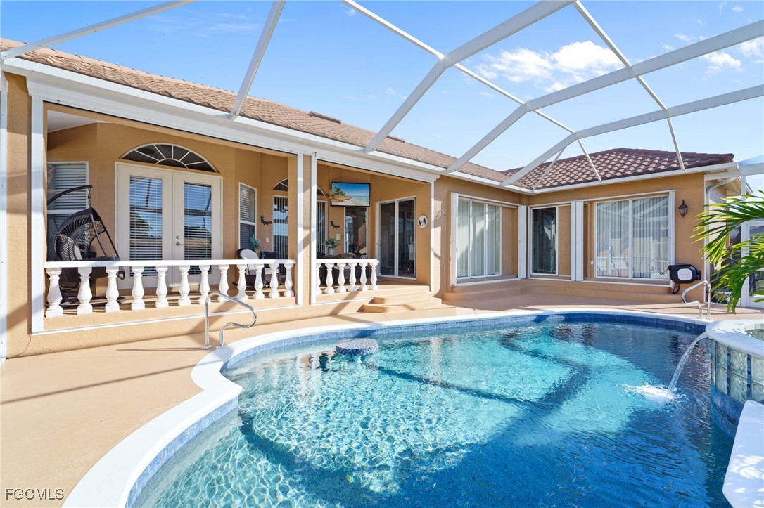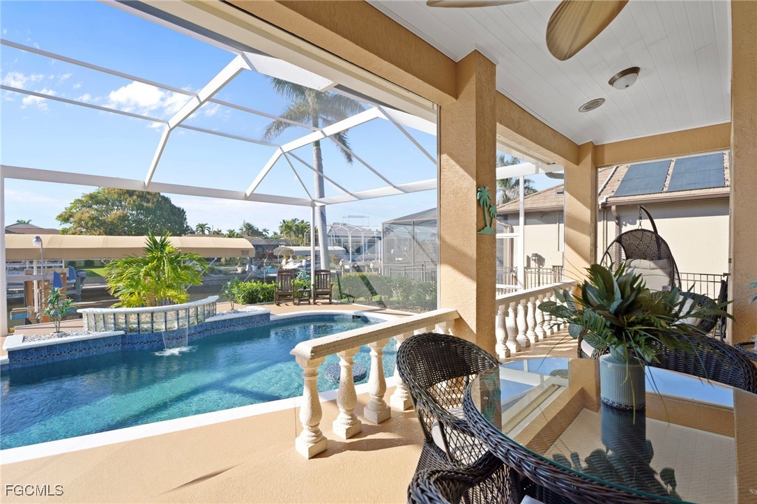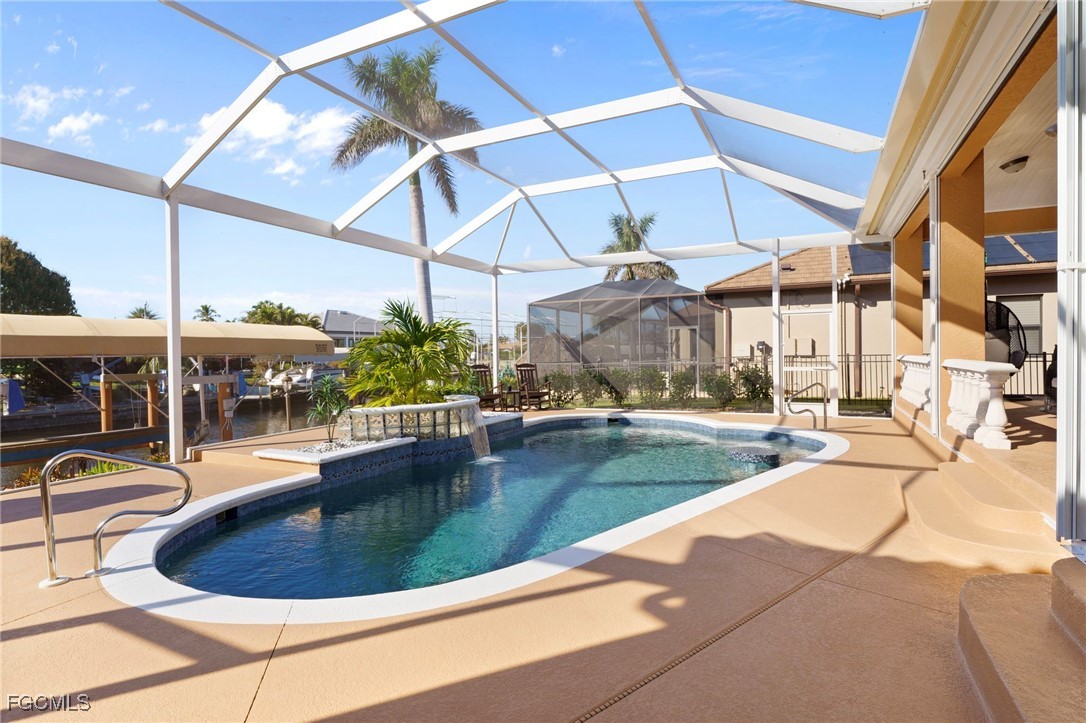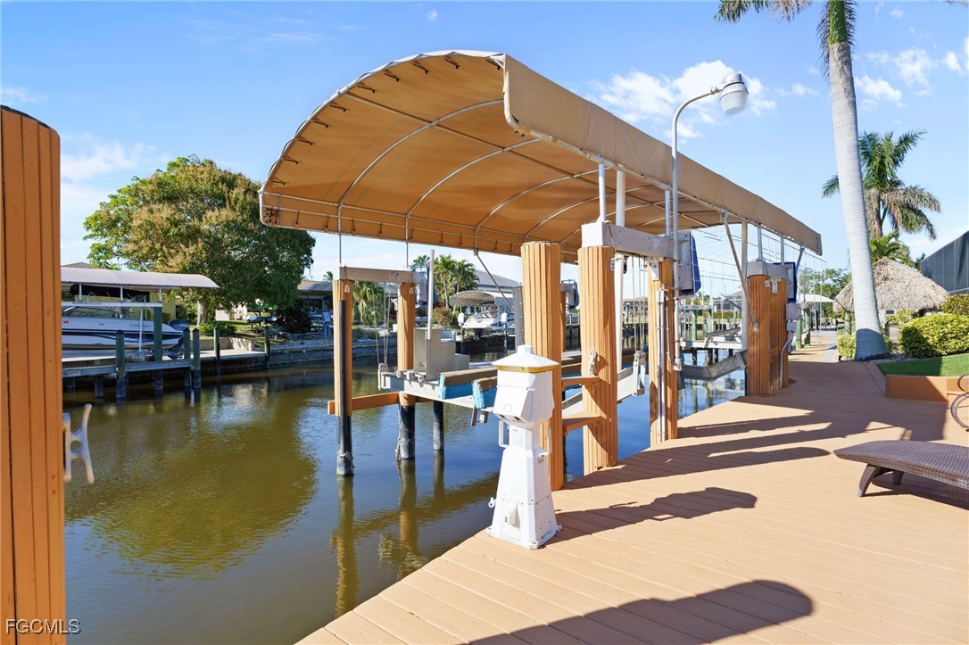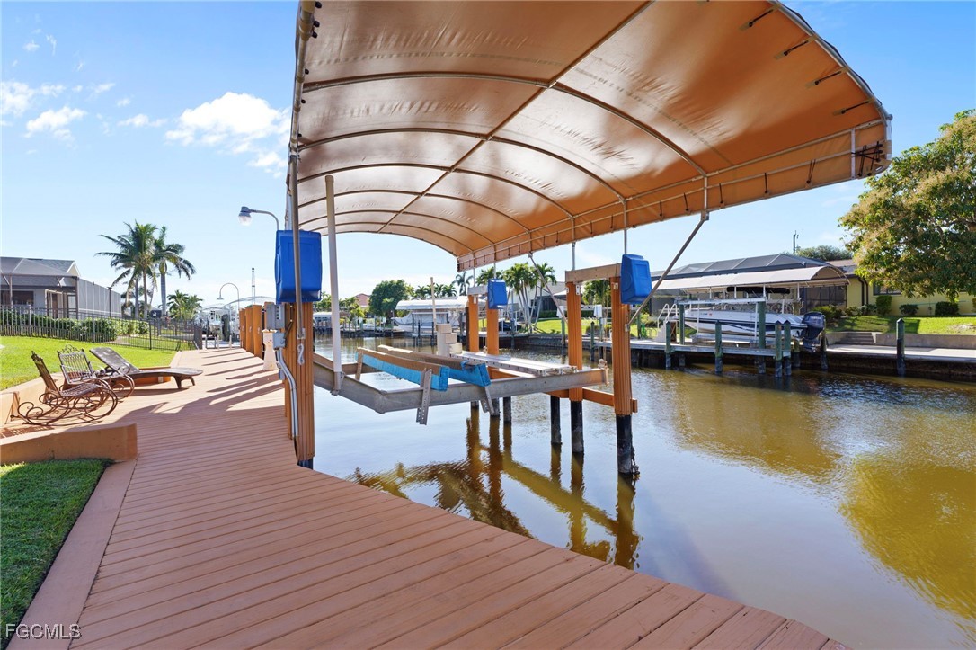Welcome to your dream home in Cape Coral, where luxury meets functionality in this stunning Western Exposure SAILBOAT GULF ACCESS NO BRIDGES single family home. Boasting just under 2000 sq ft of living including 3 large bedrooms, 2 bathrooms, 2 car garage and soaring high ceilings, this property is the epitome of waterfront living. This impeccably cared for home features wood cabinets, granite countertop in the kitchen, stainless steel appliances, built in safe, Marble countertops in Bathrooms, Jacuzzi tub in Primary Bathroom, crown molding in bedrooms, AC unit in Garage and epoxy floors so clean you could eat off of them. As for the Screened in patio and pool deck.... the pool was just resurfaced with Pebble Tec material, and it has an electric pool heater for those who like it hot. The Picture Window Screen Enclosure was replaced in 2023 with the latest state of the art System that reinforced the verticals with steel and concrete for extra strength and durability. But the real showstopper is the incredible dock system with a wood-stained captain's walk that pans the entirety of the back property line and a 25,000lb boat lift with a canopy. The high-powered boat lift has 4 motors making it easy to level out the boat to your liking. Each piling is also wrapped to prevent deterioration from the weather. No bridges deep water canals make it easy to access the open water for a day of boating and fishing. The circular paver drive and walkways up and down the property add to the curb appeal of this home. NEW METAL ROOF in 2023 by Roman Roofing with transferable warranty. This home stayed HIGH AND DRY during IAN and has never had any water intrusion. It also can be secured during storms with the Electric shutters along the back of the home and a combination of Kevlar and accordion around the rest. Garage door is hurricane rated as well so you have peace of mind with all areas protected. The main electrical panel has a switch that will support the use of a portable generator. You won't want to miss the opportunity to view this home. It is truly immaculate.