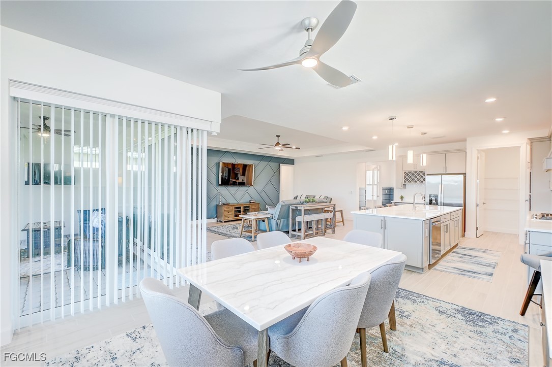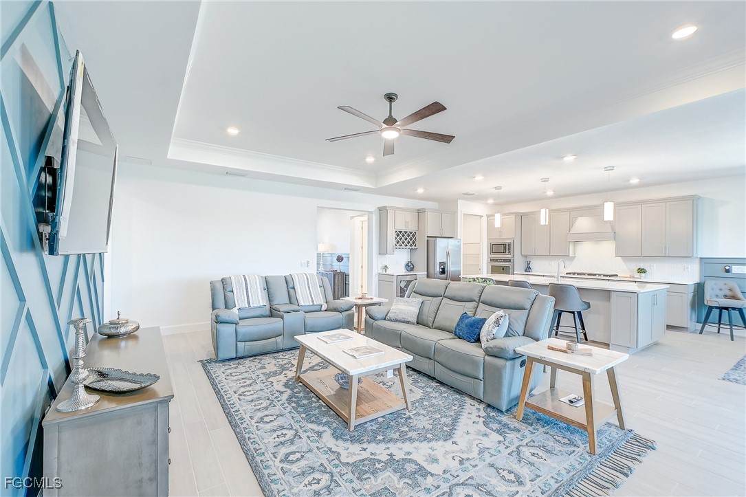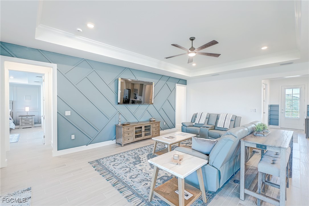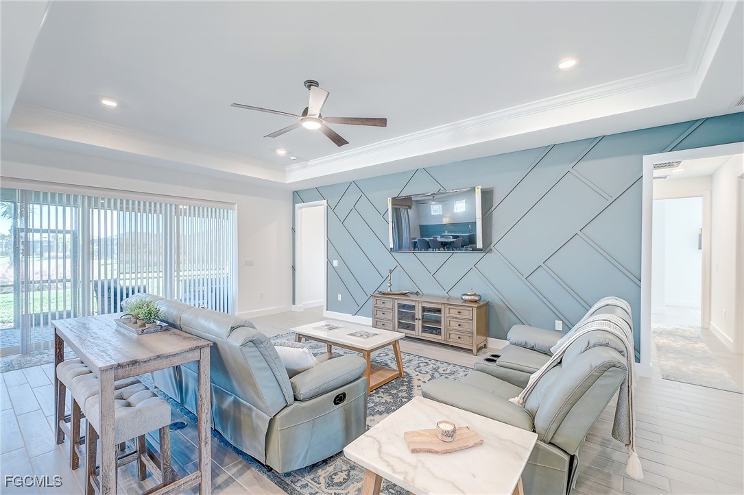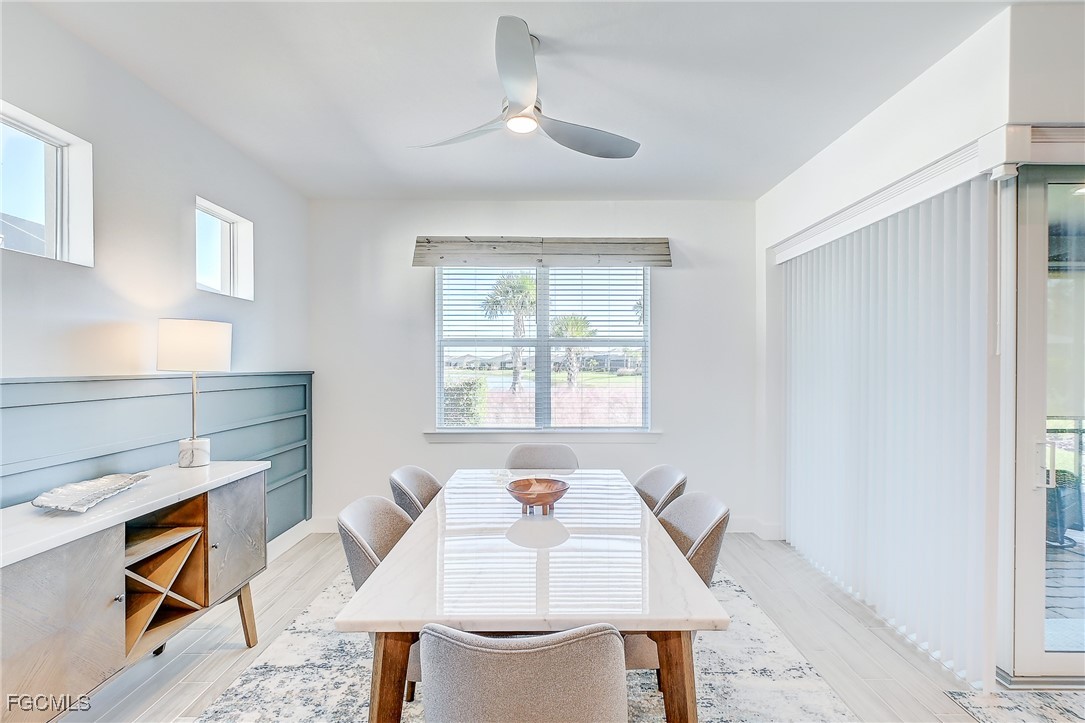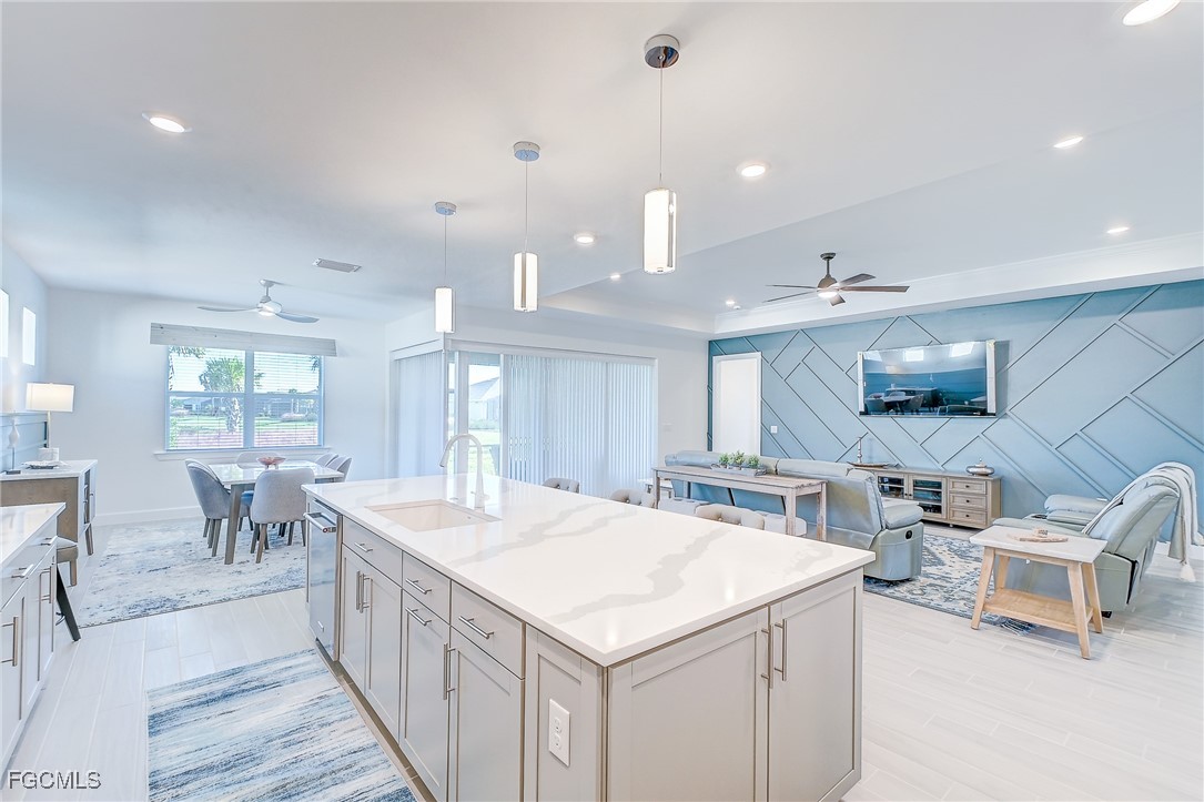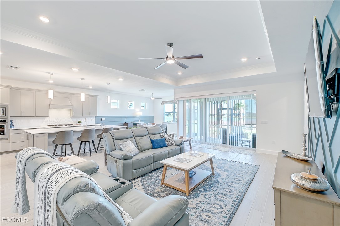 Inside, the open concept floor plan is anchored by a gourmet kitchen with quartz countertops, a spacious island with bar seating, stainless steel appliances, and plenty of storage. Beautiful tile plank flooring throughout flows seamlessly into the dining and living areas, creating an inviting space for both entertaining and everyday living. All furniture and decorations are included.