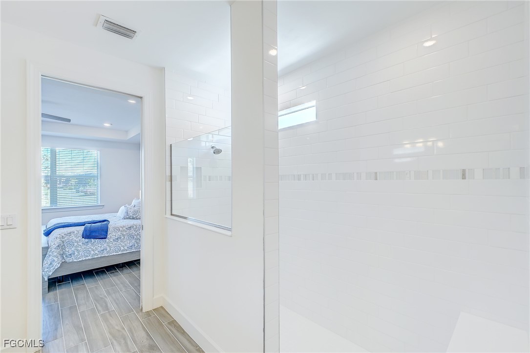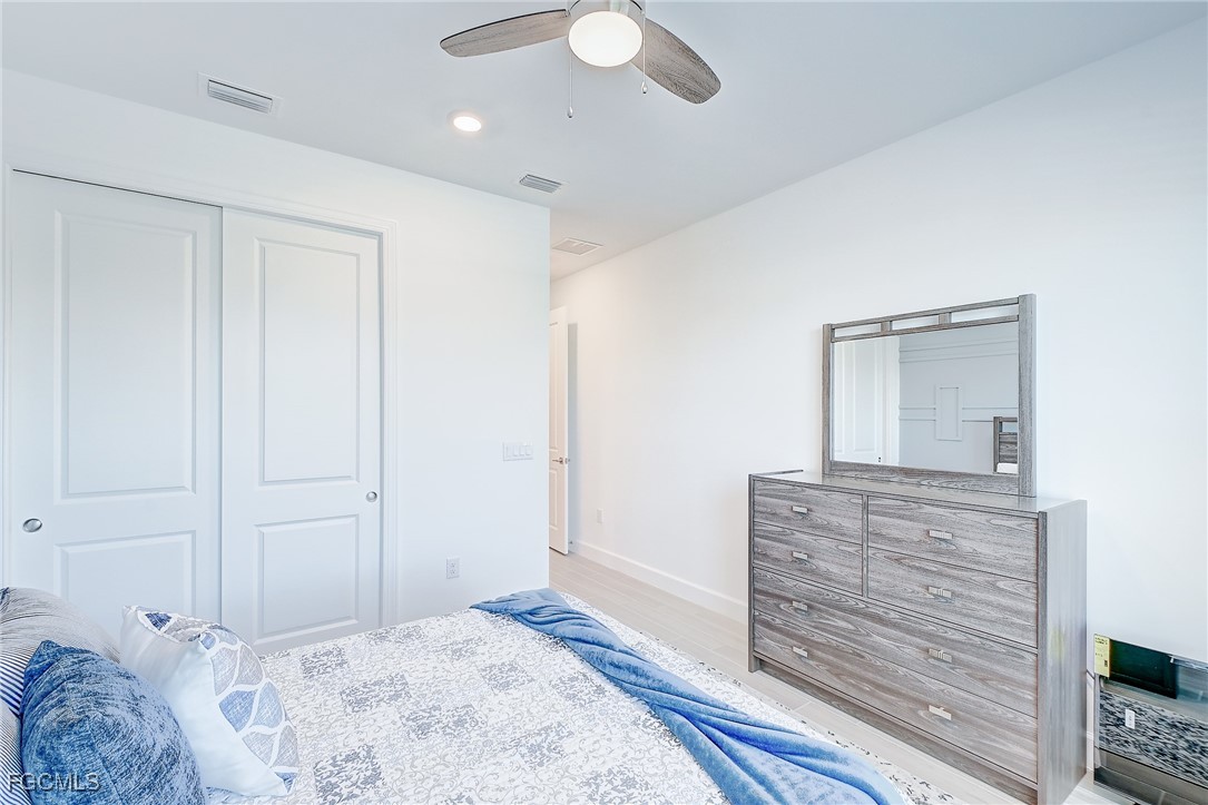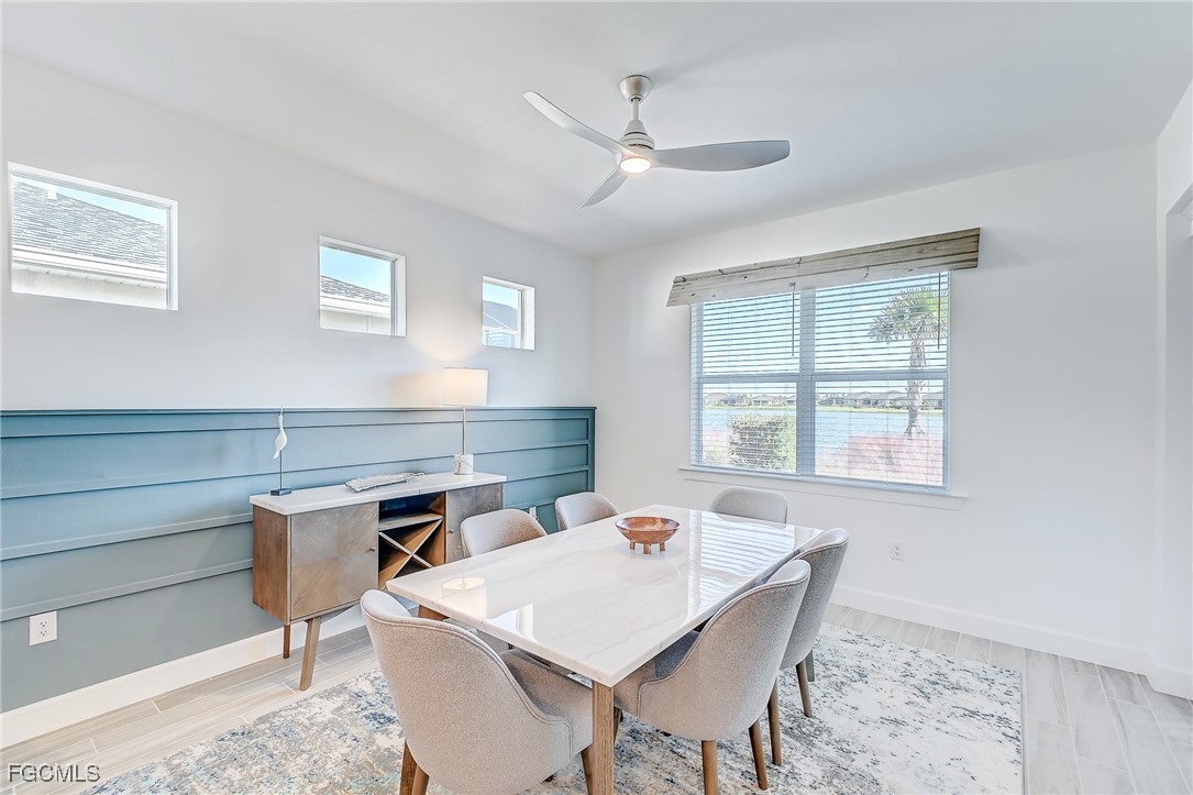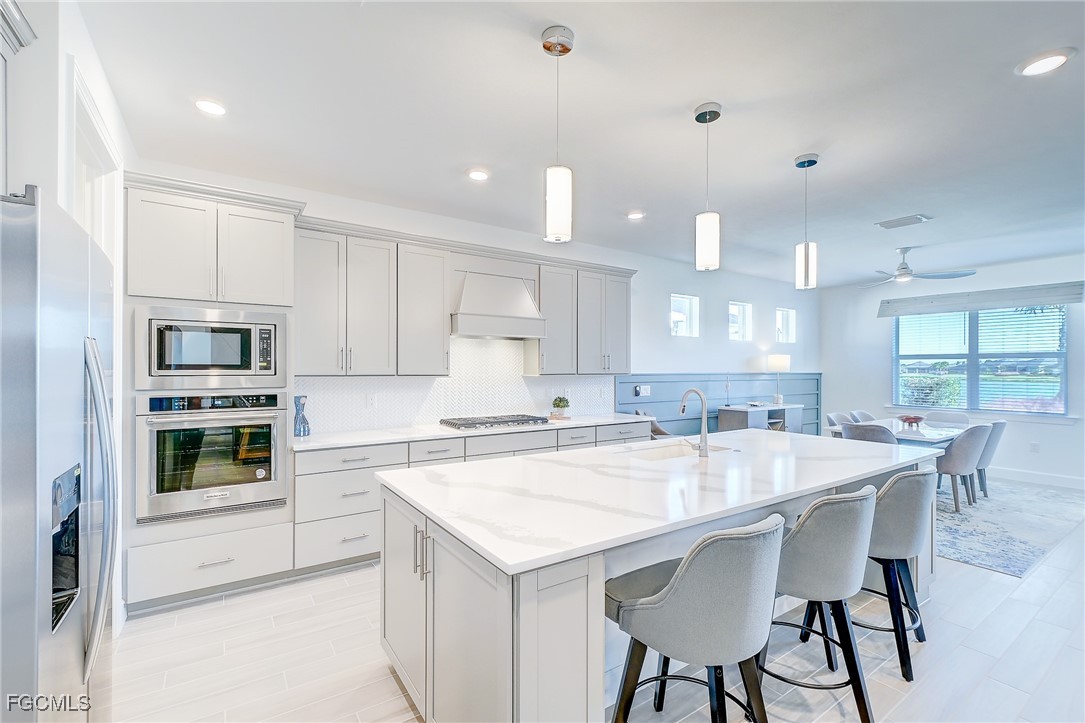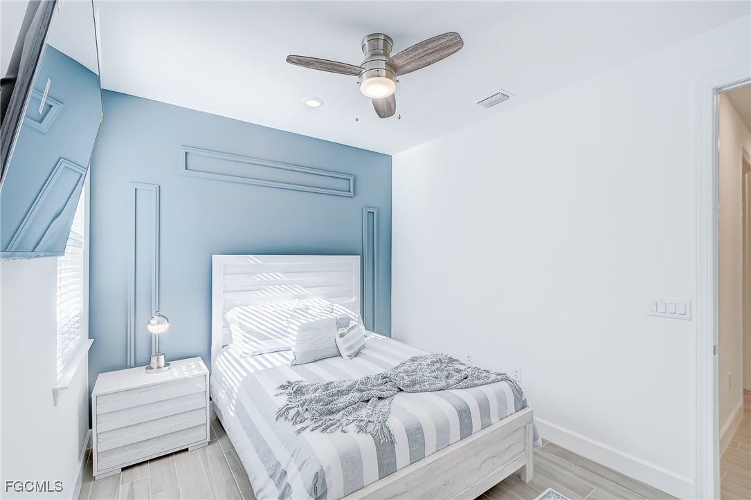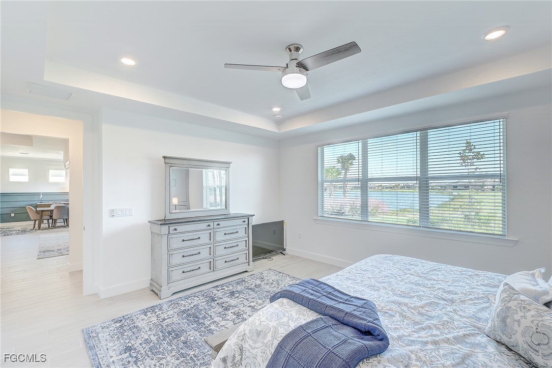 Inside, the open concept floor plan is anchored by a gourmet kitchen with quartz countertops, a spacious island with bar seating, stainless steel appliances, and plenty of storage. Beautiful tile plank flooring throughout flows seamlessly into the dining and living areas, creating an inviting space for both entertaining and everyday living. All furniture and decorations are included.