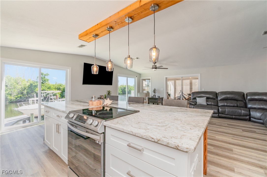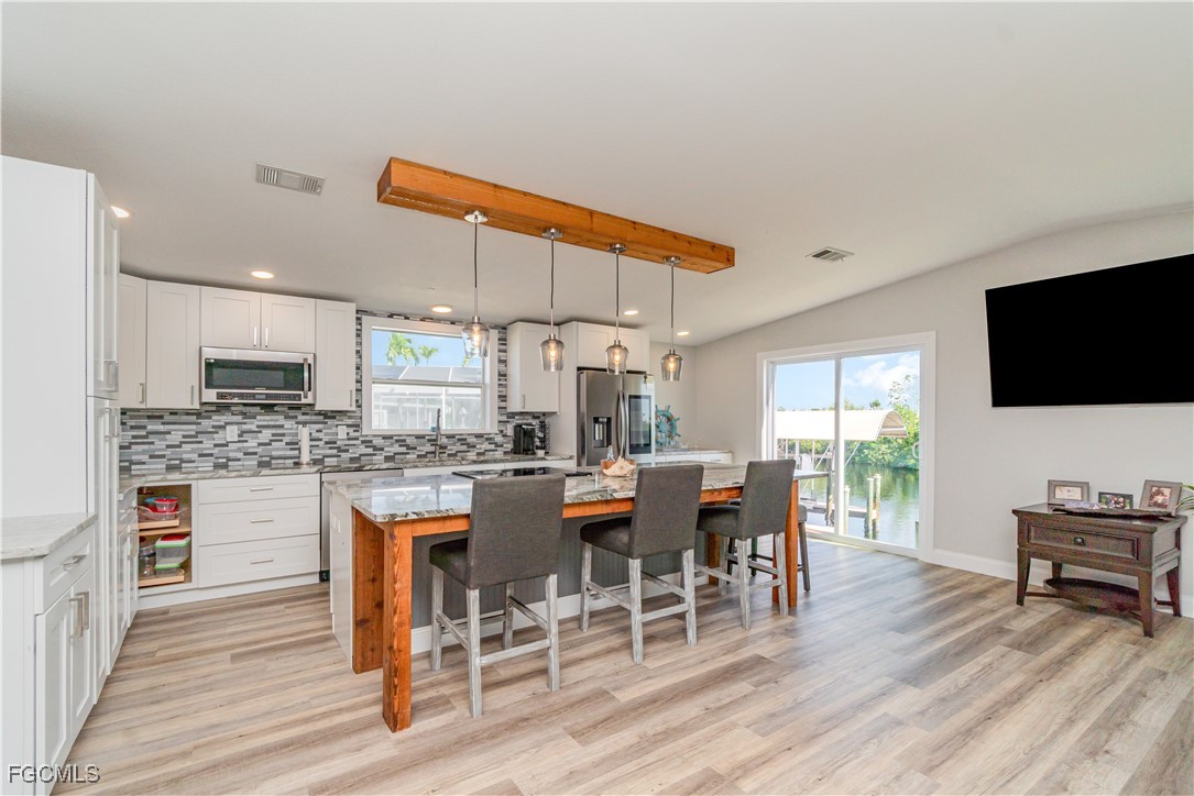 Discover the perfect blend of value and opportunity in this inviting 3-bedroom, 2-bath Gulf access home—already boasting beautiful upgrades and just waiting for your finishing touches! Step inside to open-concept living, dining, and kitchen designed for modern Florida living and effortless entertaining. The kitchen showcases granite countertops, stylish cabinetry, and plenty of space for cooking and gathering. Natural light pours through large windows and two double slider doors, leading to the rear where you can design your ideal rear deck overlooking the water. Offering morning coffee with breathtaking sunrise preserve views and refreshing, shaded afternoons from your dock. Captain's walk dock and boat lift with new motors, electric, and water provide Gulf access for endless adventures. The primary ensuite bath is a showstopper, featuring granite-topped double vanity, a huge tiled shower with dual shower heads, and modern finishes that create a relaxing, spa-like retreat. Many updates have already been completed—leaving a few projects for you to finish and make this home your own.
