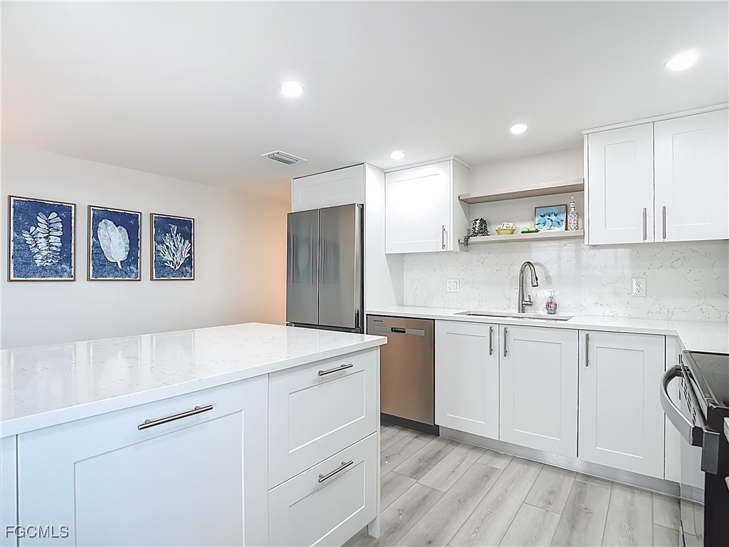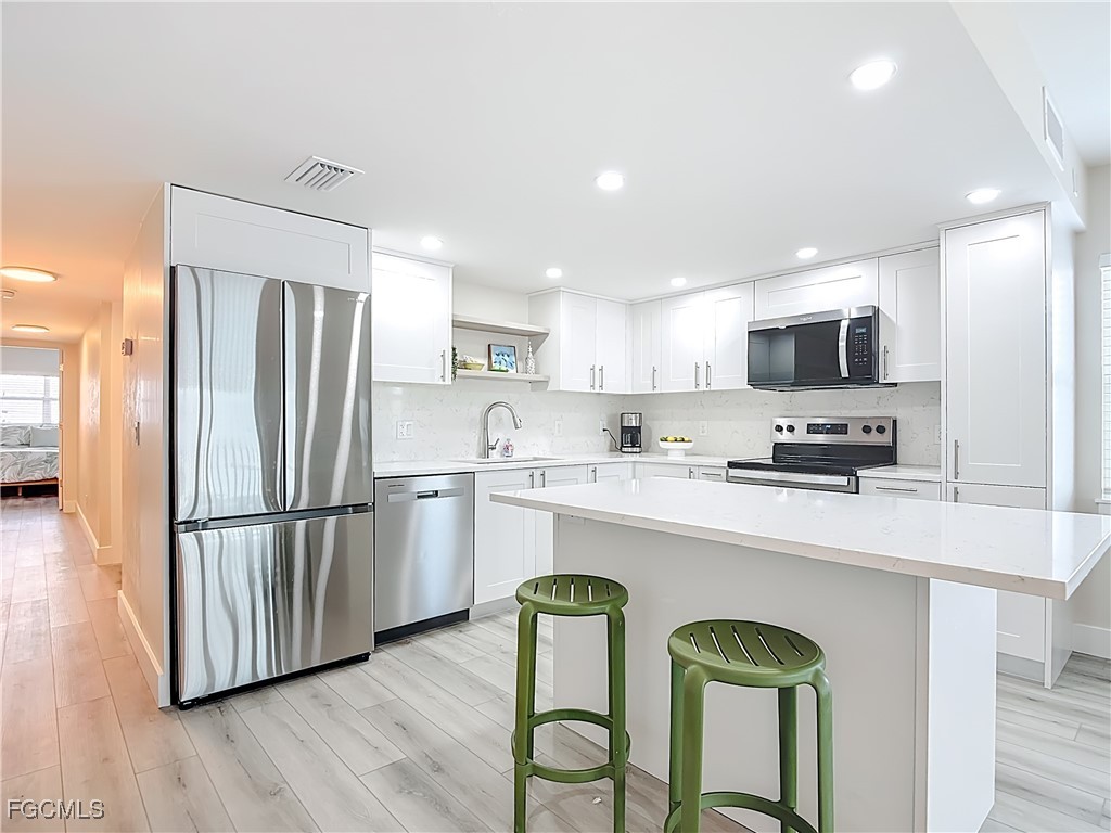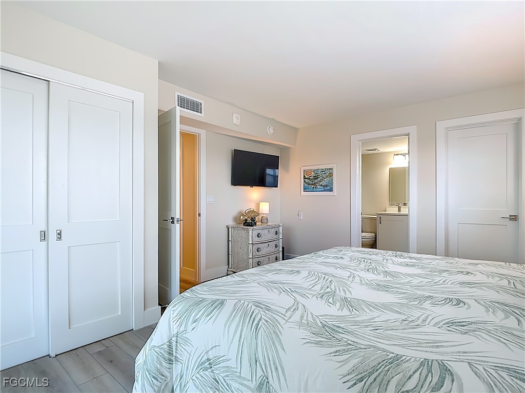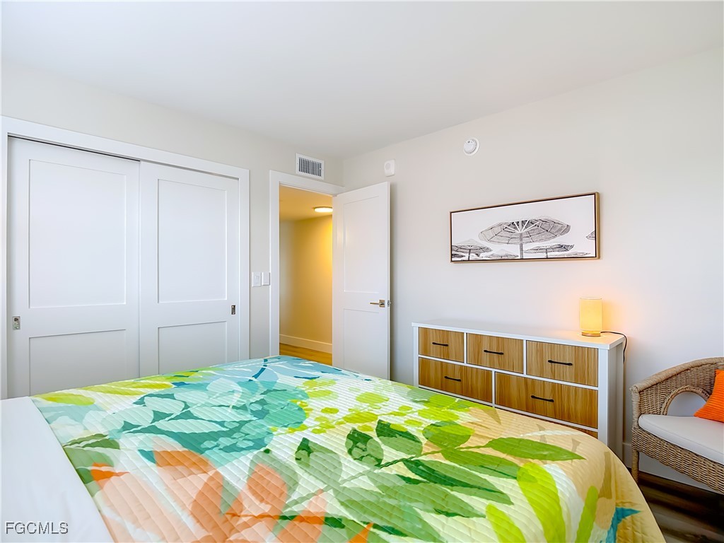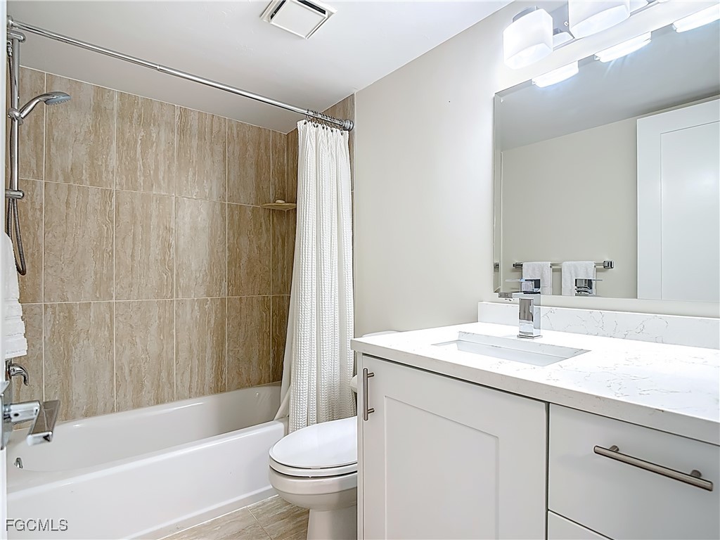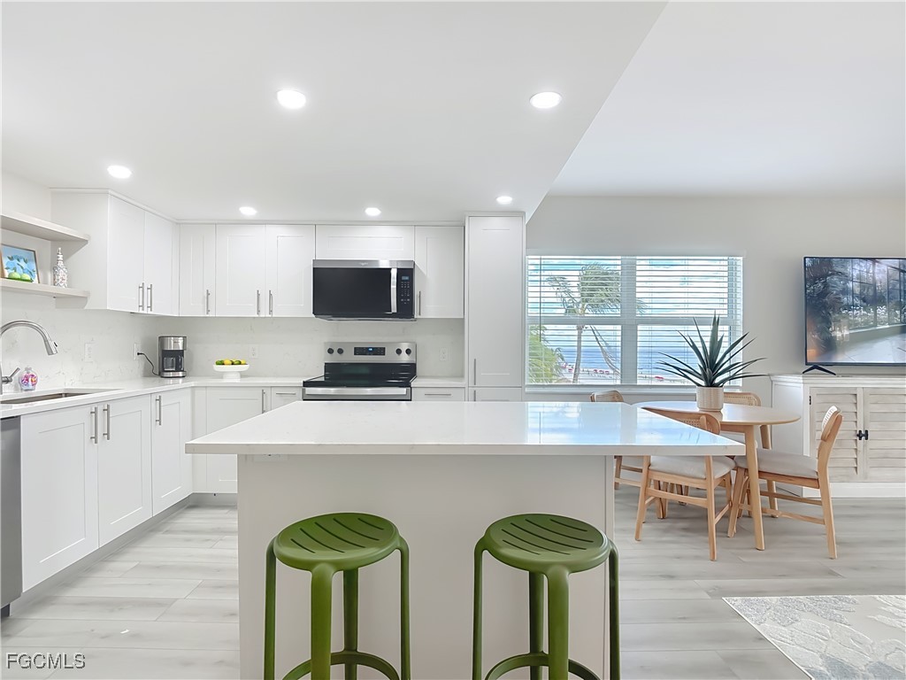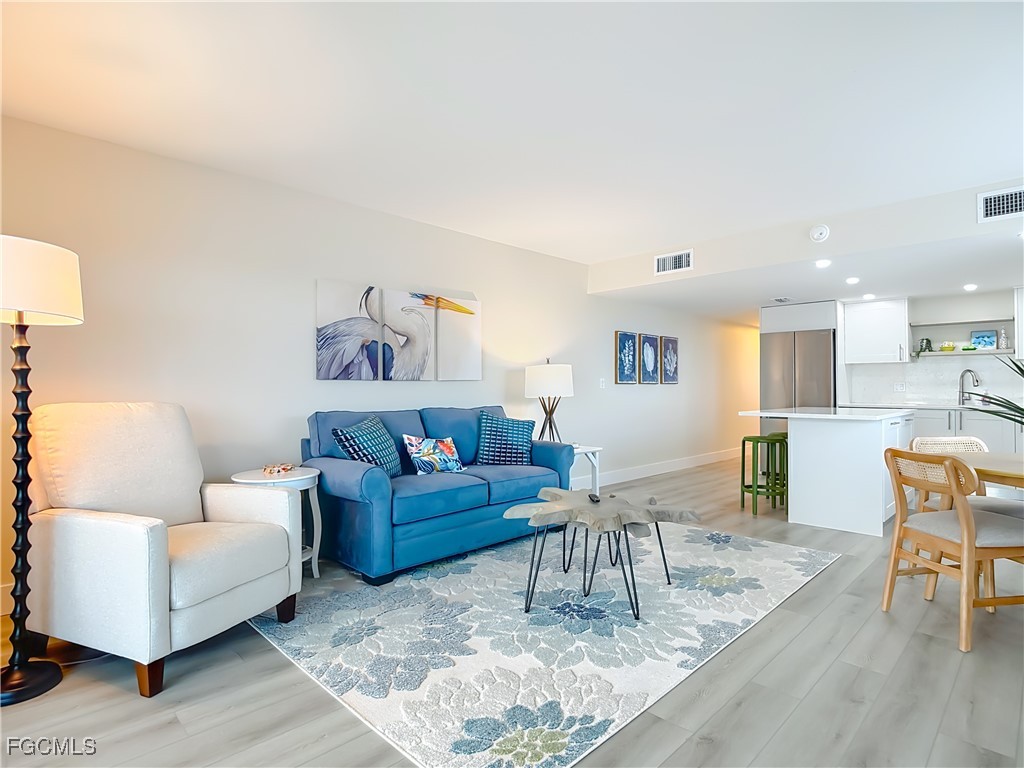 Just What You're Looking For! Highly desirable North tip of the Island, fourth floor, south corner condo with exceptional views over Gulf, Bay & sunsets over the beach. Completely remodeled interior, including all new plank wood-style vinyl flooring (LVP), New custom kitchen with island counter, new appliances and solid surface countertops. Both bathrooms have been upgraded. New impact windows and sliders have been installed. All the windows and both screened-in balconies offer exceptional water views from different perspectives. All new coastal style furnishings create the desired ambience. There is a walk-in closet with a washer/dryer hookup, as well as an additional laundry located on the lobby level. The Gulf-side pool enclave contains a spacious sundeck, BBQ grills and more. Uniquely located abutting Bowditch Point Park, a secluded 17 acres of beach & Bay. The Vacation Villas Complex allows one week rentals for maximizing rental potential. Owners are allowed one pet. Vacation Villas is NOT part of the Pink Shell Resort; however, the Pink Shell has provided Private Membership of their wonderful amenities to the owners at Vacation Villas through March 2027 at no cost, which includes their resort pools and hot-tubs, fitness center and more! This tranquil site offers a quiet and secluded location yet easy access on and off the island over Matanzas Pass Bridge, so you spend more time on the beach and less time in traffic. Don't miss this rare opportunity!