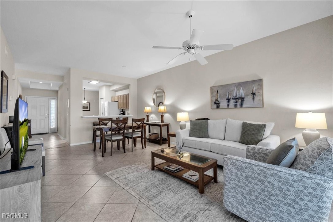 Charming top floor condo with stunning water and golf course views!! Nicely decorated and offered Turnkey. Newer appliances, custom light fixtures, maple cabinetry, a tiled living room and a lovely front and back outdoor sitting area to relax on and enjoy the Florida sunshine or breathtaking sunsets. Spacious master bedroom with bump out for an additional sitting or desk area. Nicely located in the desirable neighborhood of Wellington which is only a short stroll to the Clubhouse and pool. This beauty comes with a garage that's great for extra storage and to have your own grill and vehicle which you can have peace of mind leaving here year round. This is a Social Membership home with no worries of high golf fees, yet plenty of local golf courses around to play at your own leisure. The Legends is a prestigious private country club offering tennis, pickle ball, bocce, an exercise facility w/ tons of classes to choose from, everything from Zumba and Pilates to Yoga and Water Aerobics. Multiple dining options such as fine dining, casual sports pub and a gorgeous outdoor sunset grill located aside a lagoon style pool with a waterfall. Conveniently located close to shopping, dining, I75 and Fort Myers International Airport. Resort Style living to it's finest move in ready and waiting for you to call it home!!
