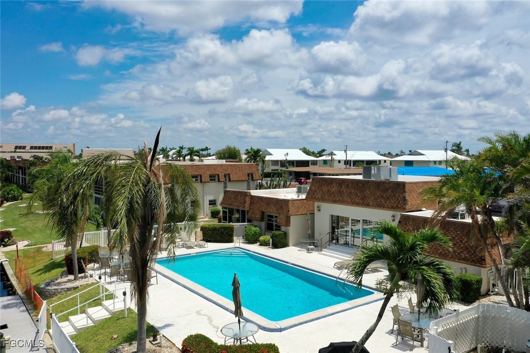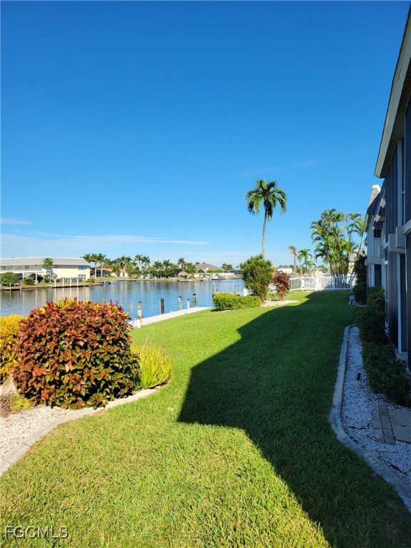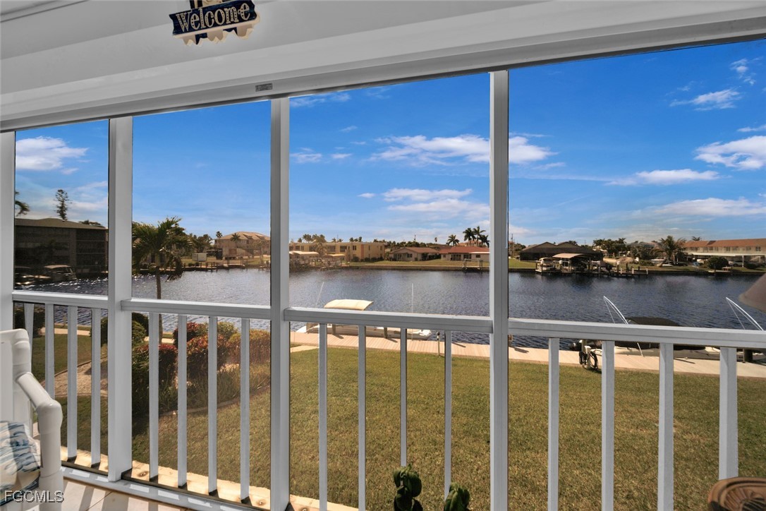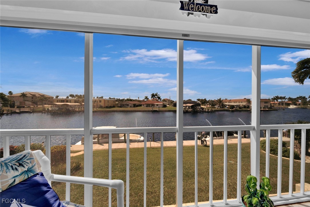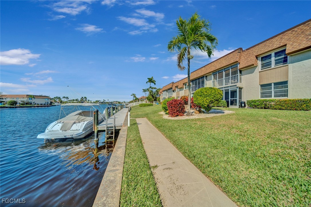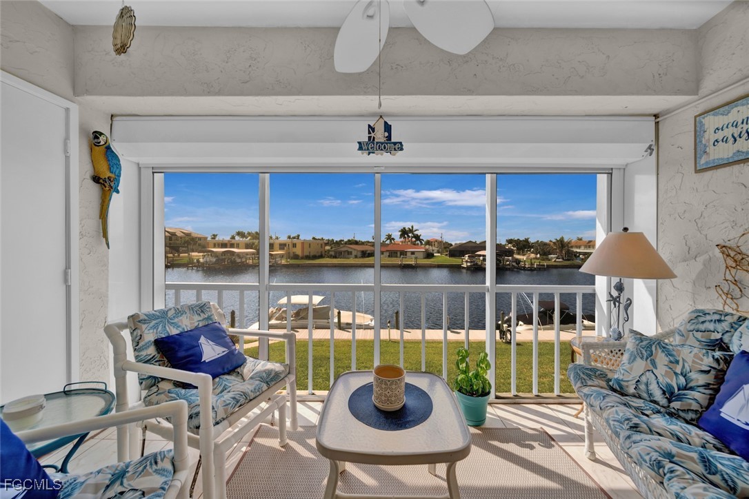 TURNKEY FURNISHED SAILBOAT ACCESS CONDO WITH STUNNING SUNSET VIEWS! This 2nd Floor unit is located just off of Beach Parkway. Tastefully & recently updated with NO BRIDGES Gulf Access and just minutes to the river. Experience the ultimate waterfront lifestyle-watch the dolphins play from the boat dockage right in your backyard! This fully furnished condo offers the perfect blend of comfort, convenience, & stunning views. Meticulously maintained and recently updated unit with new flooring throughout, fresh paint, crown molding- the open-concept living space is bathed in natural light, creating an airy and spacious feel. Living room, with sliders that showcase picturesque views of the water and vibrant sunsets. The updated kitchen features newer appliances, abundant cabinetry, and a well-appointed layout. It comes complete with all dishes, glassware, pots & pans, cookware and small appliances....a huge savings when outfitting a new kitchen! Recently re-plumbed, NEW A/C installed November, 2024, newer water heater, IMPACT WINDOWS throughout and electric shutters at the lanai, ensuring convenience, security, and protection against inclement weather. The primary bedroom offers water views & private bath. The community room has been updated & is complete with fully equipped kitchen, restrooms & workshop. Enjoy the best of both worlds...Walking distance to Jaycee Park which is undergoing an $18 million dollar enhancement with opening scheduled early 2026 and will include a bandshell, a bistro and a boardwalk along the river. Enjoy a quick morning walk or bike ride to experience a breathtaking sunrise on the river and complete your day relaxing on your Lanai or relax poolside to gather with friends and enjoy the stunningly beautiful sunsets. Located conveniently near shopping & dining with quick access to Fort Myers and the Beaches. Truly, the coastal lifestyle, with an abundance of Cape Corals best dining, shopping options and with beaches just a short drive away.