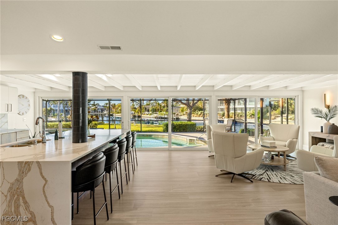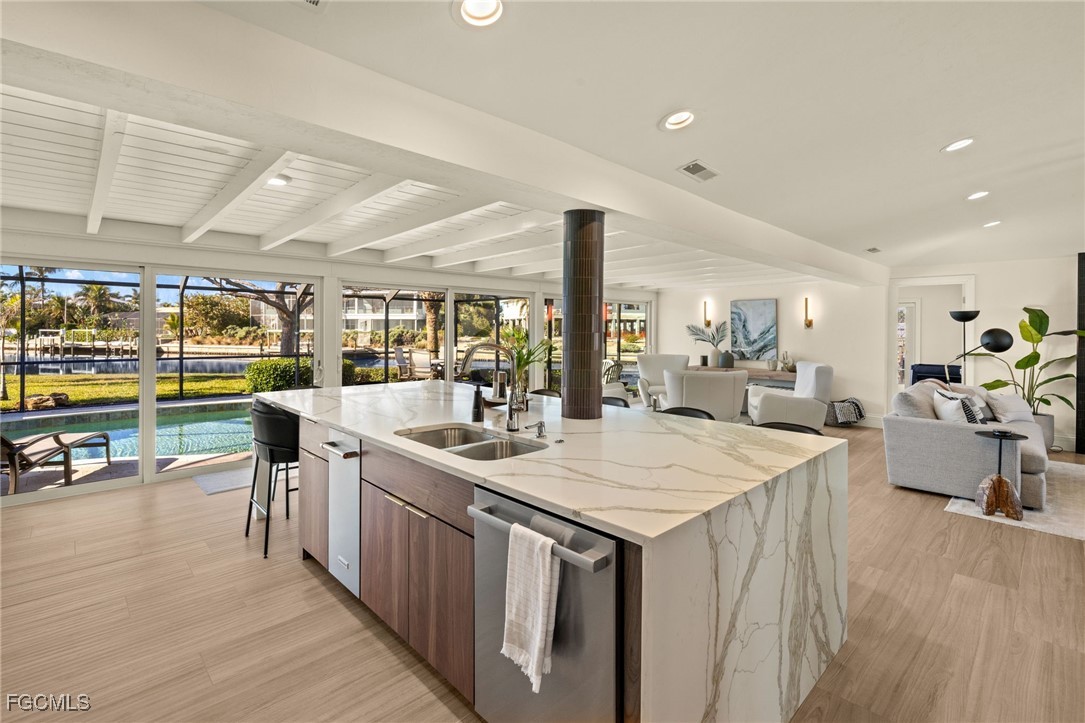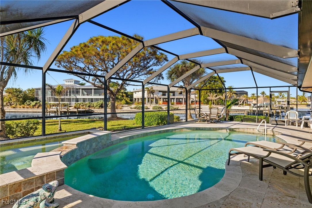 In a secluded corner of paradise, where the streets are named for seashells and sunlight glistens on the ripples of winding canals, a rare masterpiece awaits. Here, in one of the region’s most beloved boating communities, life unfolds at the water’s edge—graceful, unhurried, and framed by beauty at every turn. At the quiet end of a private lane, an oversized estate lot commands an exquisite position embraced by wide, intersecting canals that shimmer with tranquility. From dawn to dusk, sweeping water views set the stage for moments of reflection and wonder. It is not uncommon to see dolphins gliding past or boats drifting lazily toward the open Gulf, a gentle reminder that this is no ordinary address. Inside, light pours through every window, illuminating an interior that has been masterfully reimagined for modern living. The living room greets you with soaring vaulted ceilings, a sleek linear fireplace, and a sense of calm sophistication. The kitchen, equally elegant, is a symphony of craftsmanship—custom cabinetry, open shelving, and stainless-steel finishes surrounding a striking island where friends gather and laughter lingers. Each of the five bedrooms tells its own story—private sanctuaries where morning light shimmers on the water and the day begins with quiet inspiration. The four baths, individually designed, offer a touch of artistry and serenity, transforming the everyday into something extraordinary. Beyond the glass, an intimate seating area beneath a beamed, wood-inlaid ceiling opens to the caged pool and sweeping lawn, where tropical breezes carry the scent of salt and sun. At the water’s edge, your private dock and boat lift promise effortless access to open water, just minutes from adventure, yet a world apart from everything else. This is more than a home; it is a celebration of place and possibility. In a community where charm and character are timeless, finding such a fusion of design, serenity, and waterfront prestige is nothing short of extraordinary. Here, coastal living becomes art.