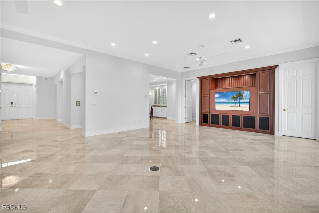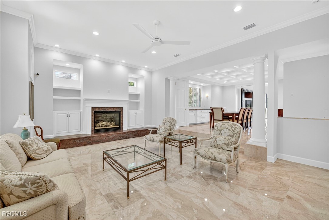 Inside, the attention to detail is evident throughout. The main living level features stunning marble floors, a welcoming living room with a propane fireplace, and a formal dining room enhanced by a coffered ceiling and custom-built ins. The expansive family room opens through impact sliders to a screened lanai overlooking the pool and canal, blending indoor and outdoor living seamlessly. The gourmet kitchen is the heart of the home, showcasing a center island, breakfast bar, stand-alone refrigerator and freezer, gas range, and a butler’s pantry with a wall oven, ideal for entertaining or family gatherings. A guest bedroom with a private bath on this level ensures comfort and convenience for visitors.
