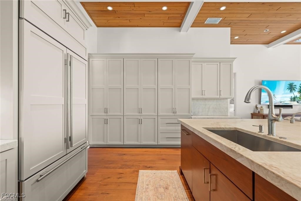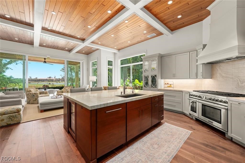 Experience the perfect blend of spacious luxury and serene surroundings in this beautifully designed Creekside villa. Featuring 3 bedrooms, a generous den, a separate office, an additional living room, and expansive patios framed by lush landscaping, this home offers both comfort and privacy in equal measure. Upon entry, you're welcomed by rich oak flooring, soaring beamed ceilings, and peaceful garden views. The open-concept living areas flow seamlessly toward the den and a stunning chef’s kitchen, appointed with Taj Mahal Level 5 quartzite countertops, custom cabinetry, and high-end appliances. Floor-to-ceiling glass walls draw your eye to the covered patio, where an invisible edge pool and panorama screen showcase sweeping views. The thoughtfully designed split floor plan provides optimal privacy, with the primary suite featuring direct access to the patio and pool, high ceilings, a spacious walk-in closet, and a spa-like, neutrally toned bath. Ownership does not require club membership, but members of The Sanctuary can enjoy access to the Arthur Hills championship golf course, tennis, pickleball, lap pool, fitness center, fine dining, and more.