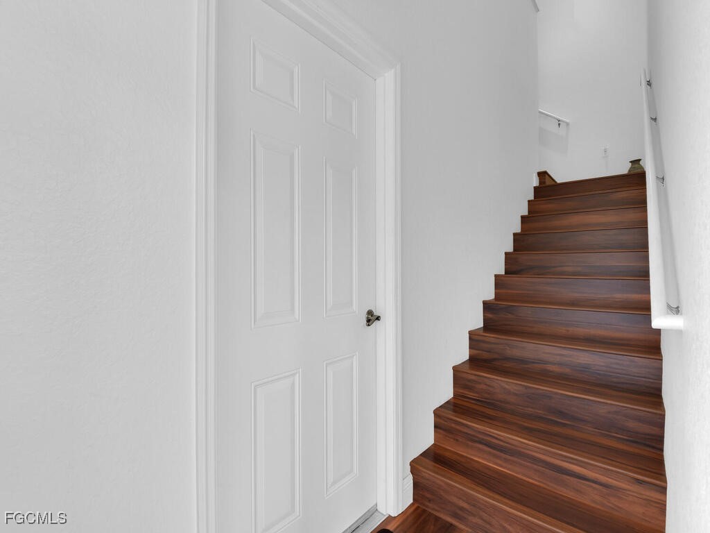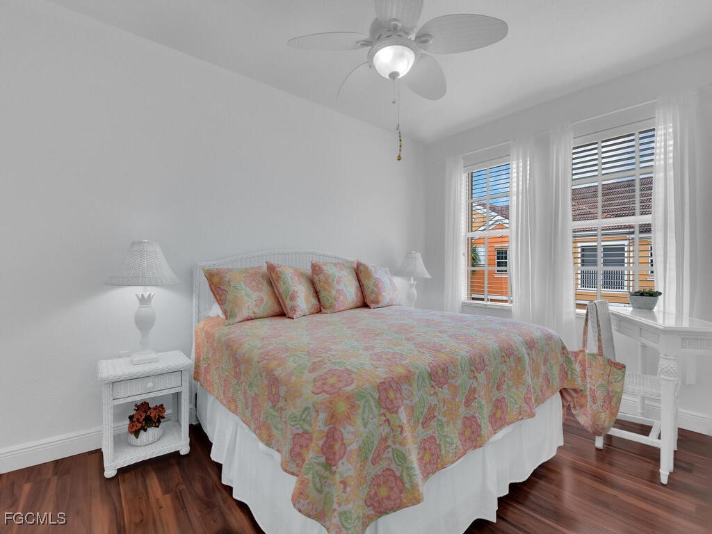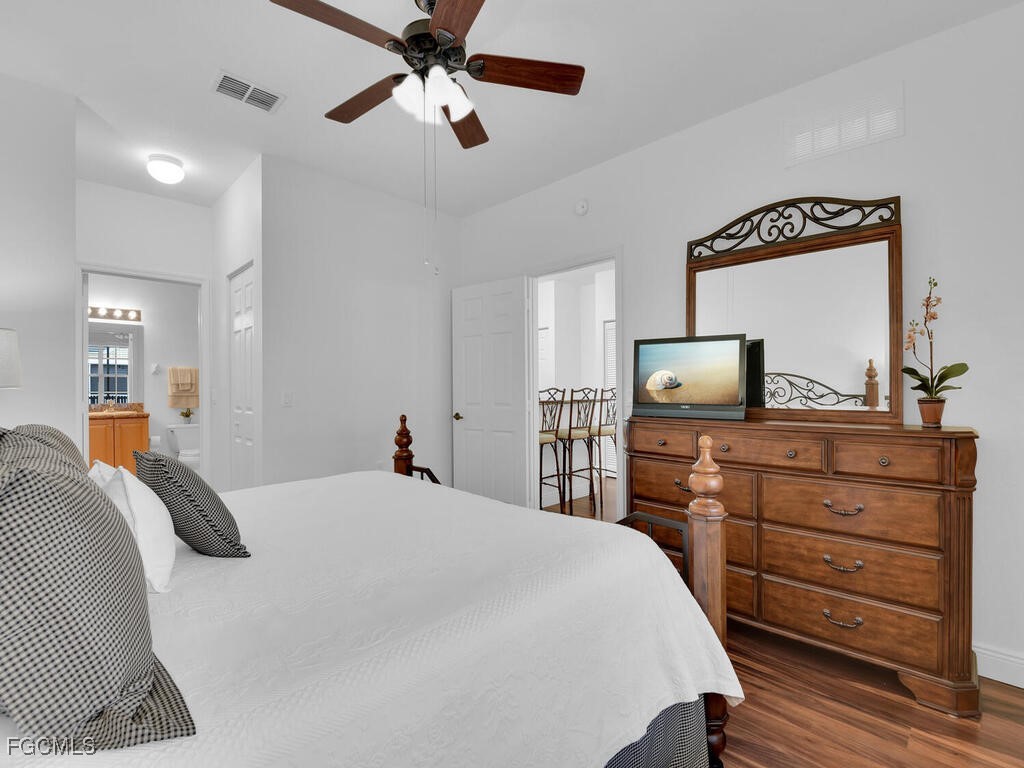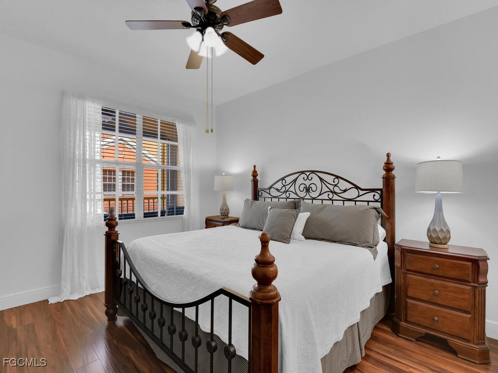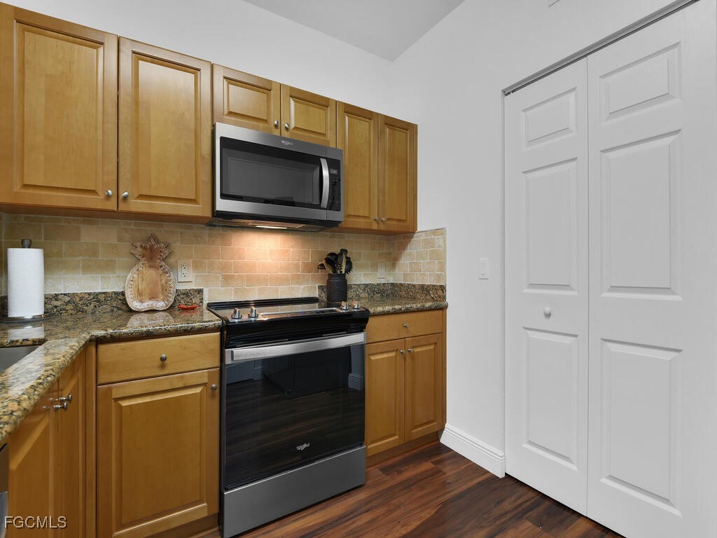 This move-in ready end-unit condo, complete with a one-car garage, is being offered turnkey—just bring your luggage! The open floor plan features custom upgraded Armstrong wood flooring throughout the main living areas, with tile in the bathrooms and lanai. The kitchen showcases beautiful wood cabinetry, granite countertops, Stainless steel appliances (less than a year old) and a breakfast bar that overlooks the spacious living and dining area. The master suite includes walk-in closets and a luxurious bathroom with dual granite sinks, a large, tiled shower, and a soaking tub. Enjoy outdoor living on the large balcony, perfect for relaxing or entertaining guests. The welcoming entry vestibule provides convenient access to the garage, and new storm shutters have recently been installed for added peace of mind. HVAC system replaced 2025. Transferrable home warranty. This unit comes fully furnished with quality pieces. The community’s large clubhouse features a full-sized gym overlooking a resort-style pool and inviting hot tub—everything you need for comfortable and carefree living.