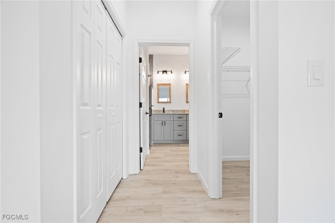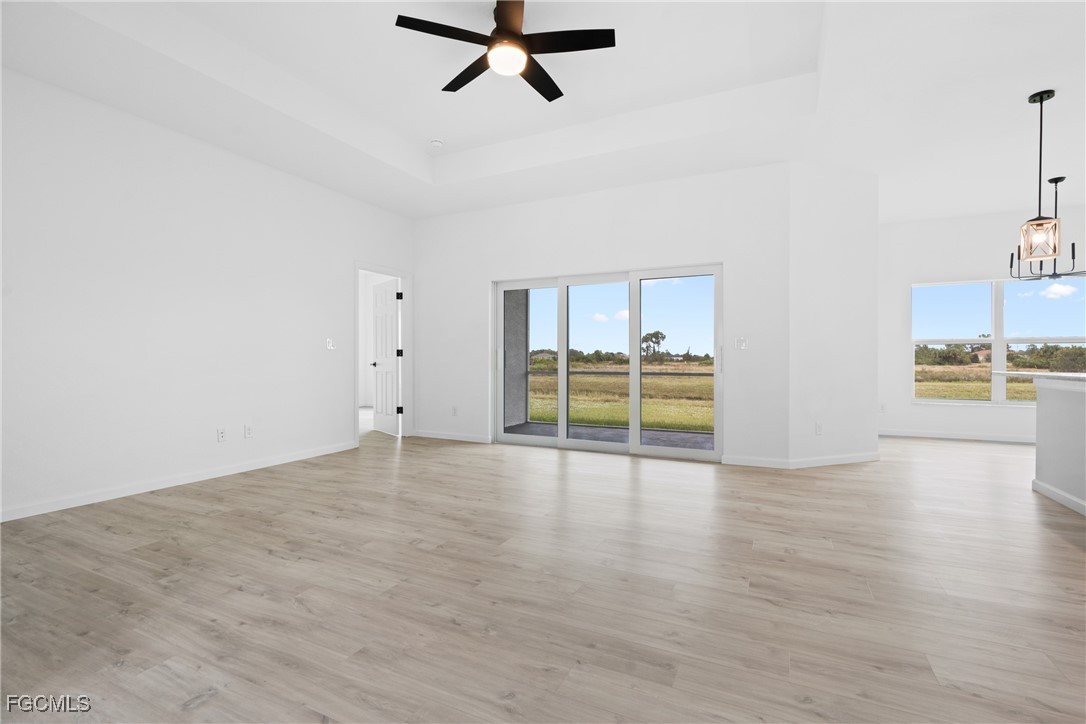 Built with durability and energy efficiency in mind, the home includes impact-resistant windows, wrap-around gutters, and a two-car garage. Interior features include luxury vinyl plank flooring throughout, ceiling fans in every room, and tray ceilings in both the living room and primary suite.