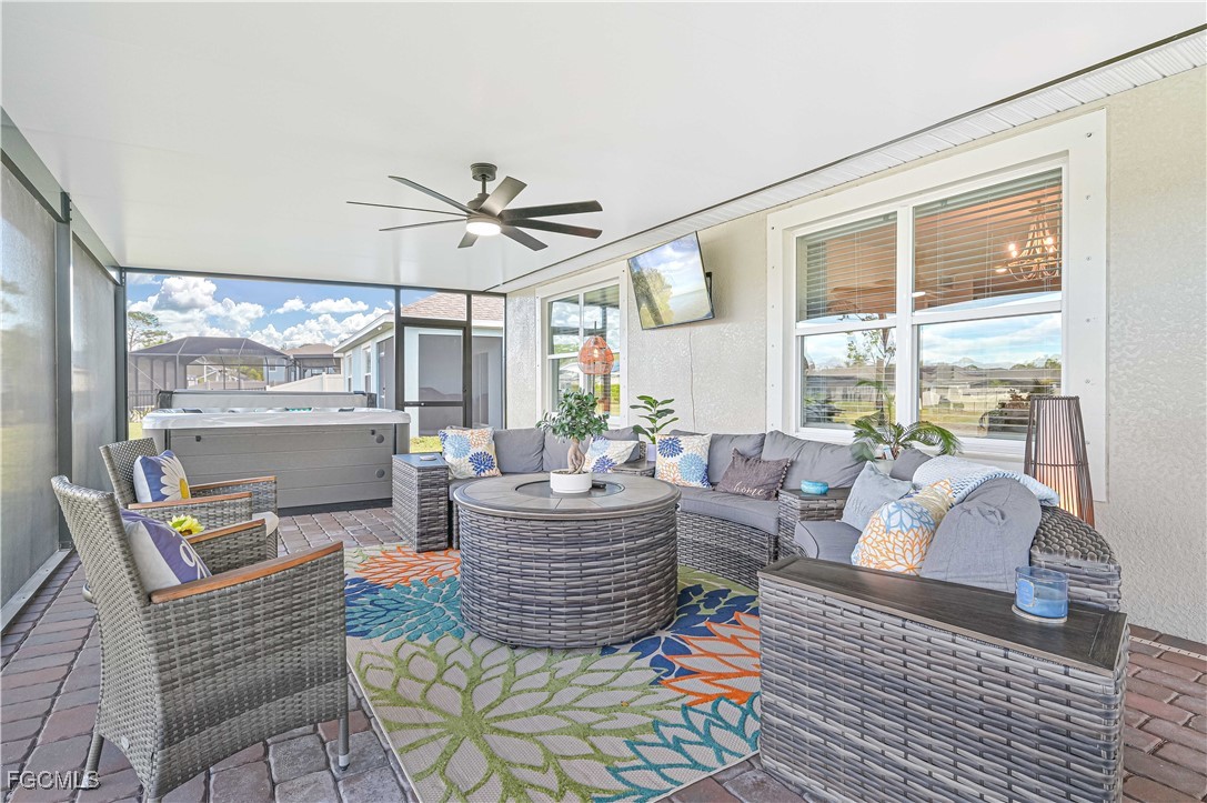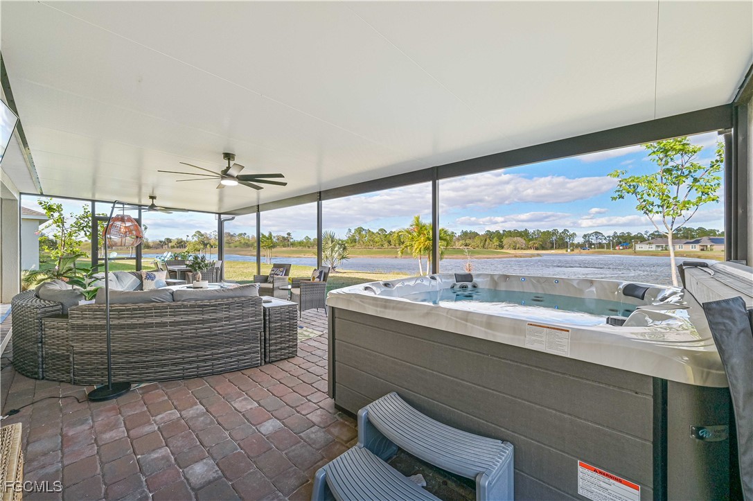The inviting living area flows effortlessly to the extended screened lanai, offering over 600 sq. ft. of outdoor living space with breathtaking long-lake views—ideal for relaxing while soaking in the hot tub or hosting friends and family. Enjoy enhanced landscaping that boosts curb appeal and complements the serene natural surroundings. The two-car garage is a standout, featuring an epoxy floor and Monkey Bar wall system for organized storage and convenience.