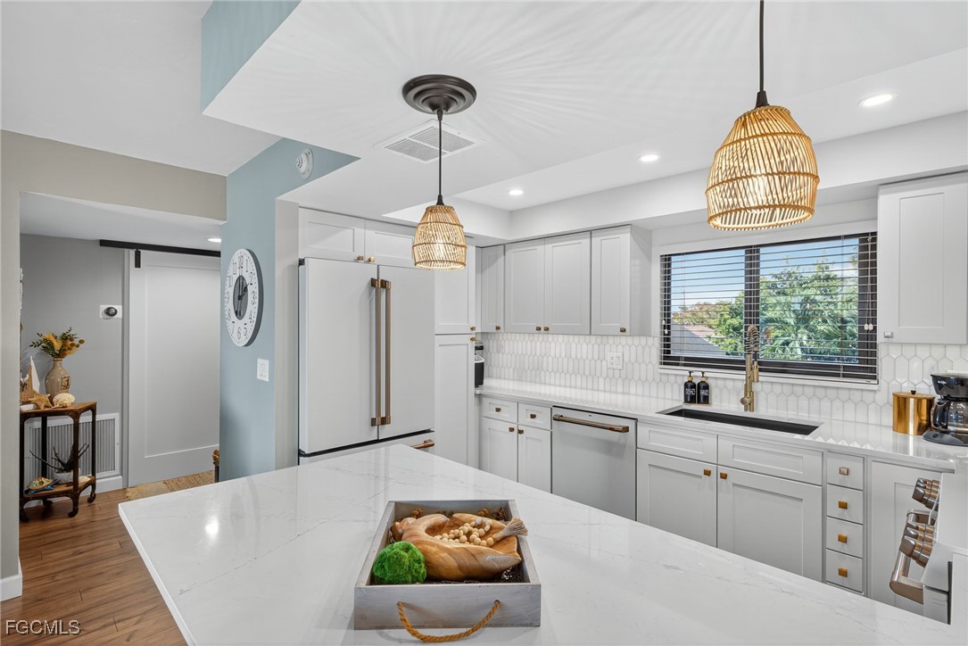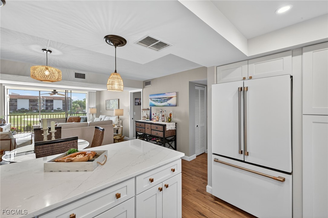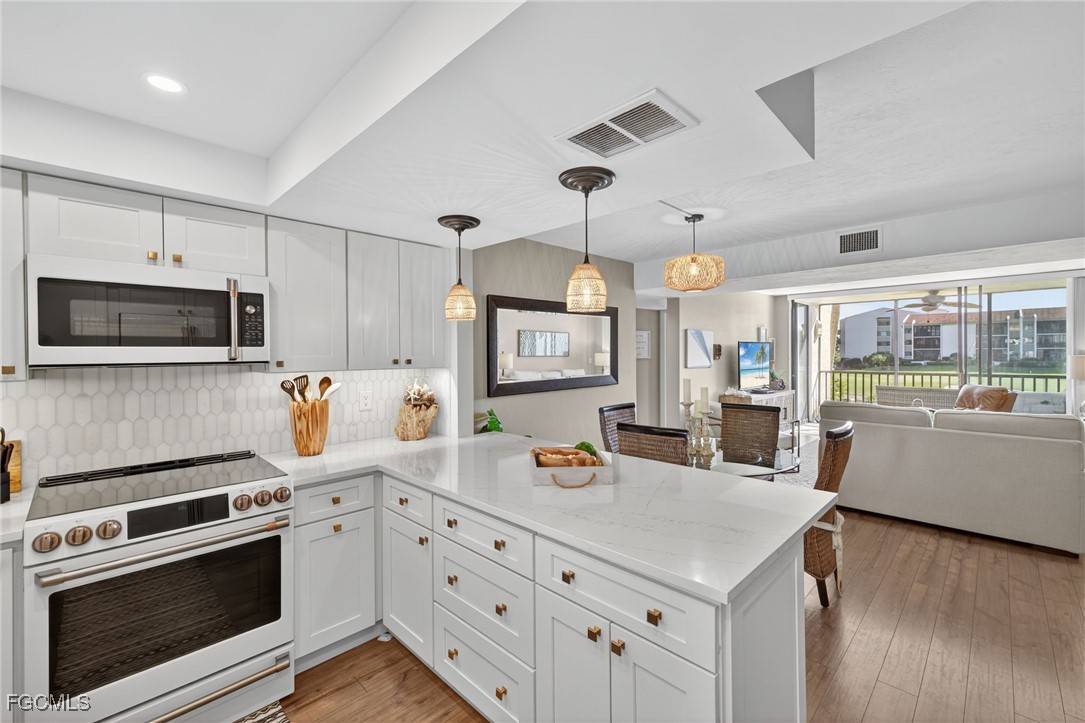 Discover refined living in this 3-bedroom/2 bath residence offering prime southern exposure and sweeping views of the golf course and tranquil lake. Bathed in natural light all day long, this beautifully updated condo combines modern design, high-end finishes, and effortless comfort. The fully renovated kitchen showcases custom-built cabinetry, high-end quartz countertops, and a Café appliance package, a stunning blend of luxury and function. Throughout the home, Luxury vinyl flooring provides a clean, contemporary flow from the living areas to all bedrooms, with the primary bedroom featuring new carpeting with high quality padding. Both the guest and primary en-suite bathrooms have been thoughtfully updated with modern fixtures. Enjoy peace of mind with newer HVAC and quality craftsmanship throughout. This spacious layout is ideal for both seasonal escapes and year-round living. Located within The Landings Yacht, Golf & Tennis Club, residents enjoy a private country club lifestyle with golf, tennis, pickleball, bocce, a marina with boat slips (based on availability), fitness center, and on-site gourmet dining. Picturesque walking and jogging trails wind through lush tropical landscaping, creating a serene resort-style setting. Elegant, light-filled, and move-in ready, this condo captures the best of luxury living in one of Fort Myers’ most sought-after communities.