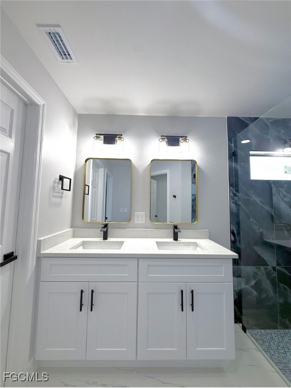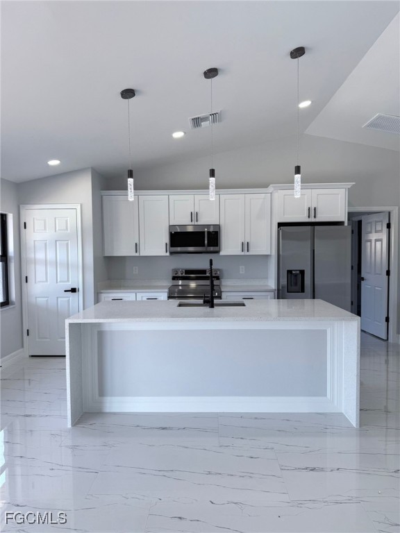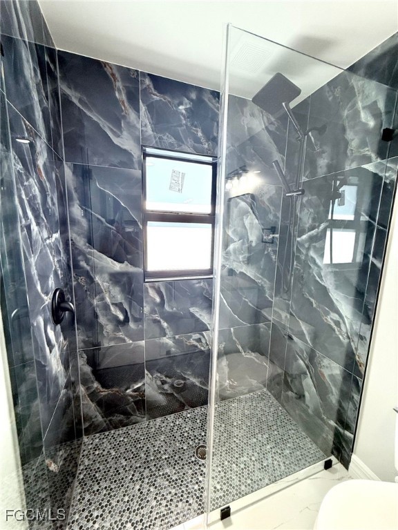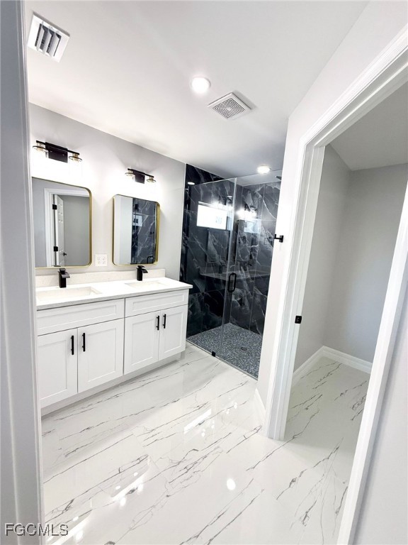 The stylish kitchen features a striking quartz cascade island, stainless steel appliances, and sleek cabinetry—perfect for entertaining. Elegant details continue throughout with tile flooring, tile showers with glass doors, soffit LED lighting, and a clean epoxy-finished garage.