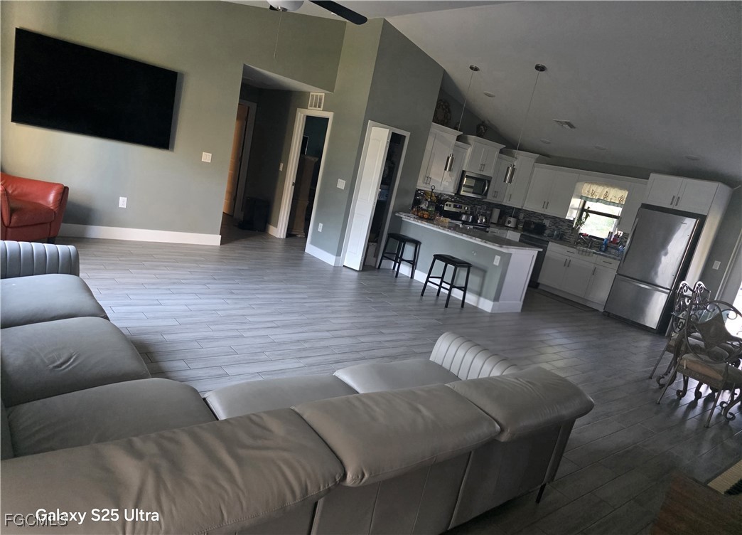 Beautiful home very well maintained, has an open floor plan, 3 bedrooms plus an in-law suite, 3 bathrooms, Tile throughout, granite counter tops in the kitchen, spacious island, smoke detectors, ceiling fans, walk in closet, and dual sink in one of the bathrooms, double doors to the screened lanai, automatic lawn irrigation system, Stainless steel appliances like new, two refrigerators, washer and dryer included. 220V outlet for outdoor kitchen connection, freshly painted. Air conditioning and water system working very well.