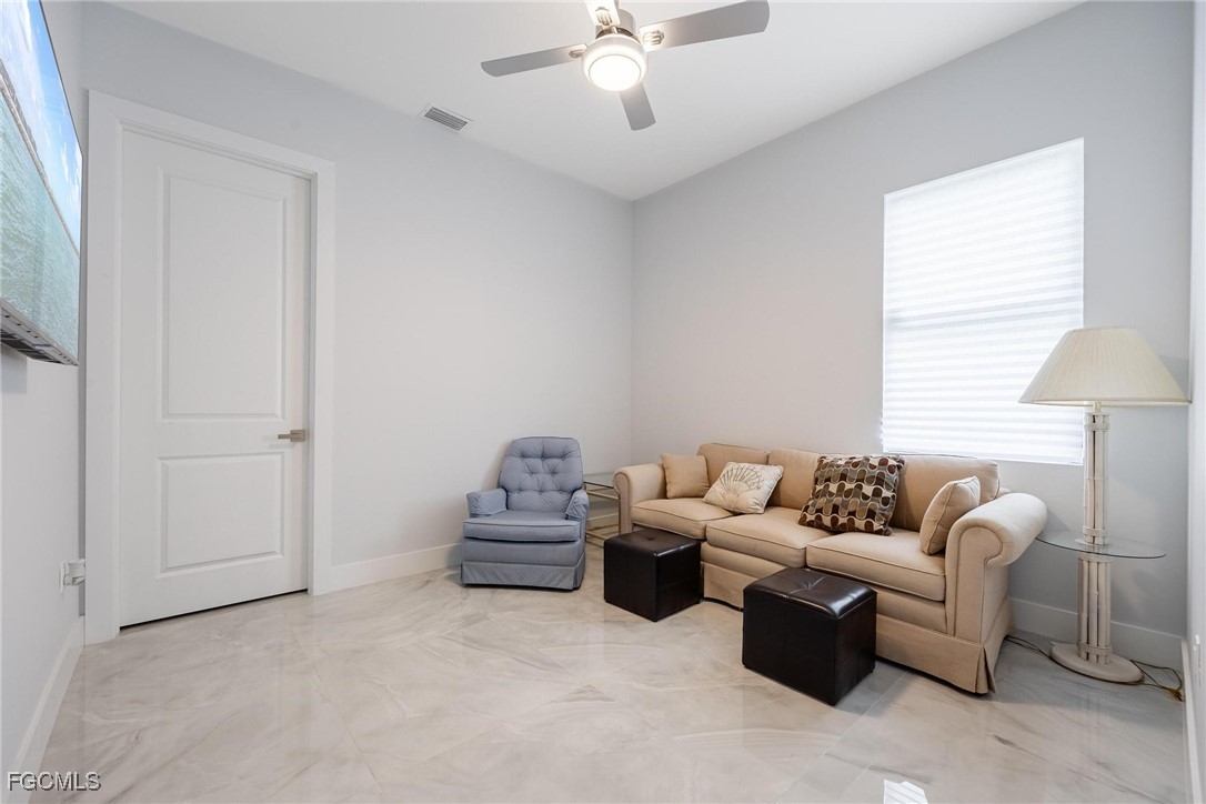Inside, the home features 32x32 rectified porcelain tile flooring, custom closet shelving, and a bright open layout. The upgraded kitchen includes quartz countertops, acrylic cabinetry, an oversized waterfall island, and built-in countertop outlets—perfect for cooking, hosting, or everyday function. Three bedrooms include custom closet shelving, and the living room opens directly to the covered lanai for seamless indoor-outdoor living.