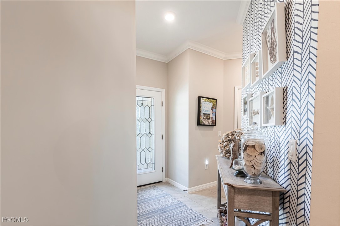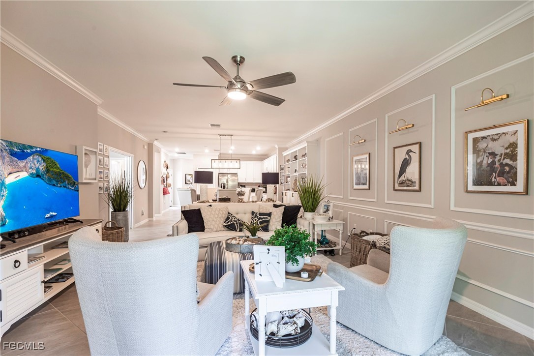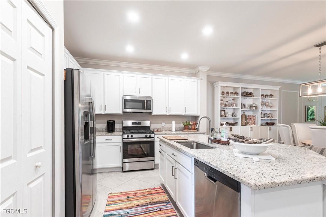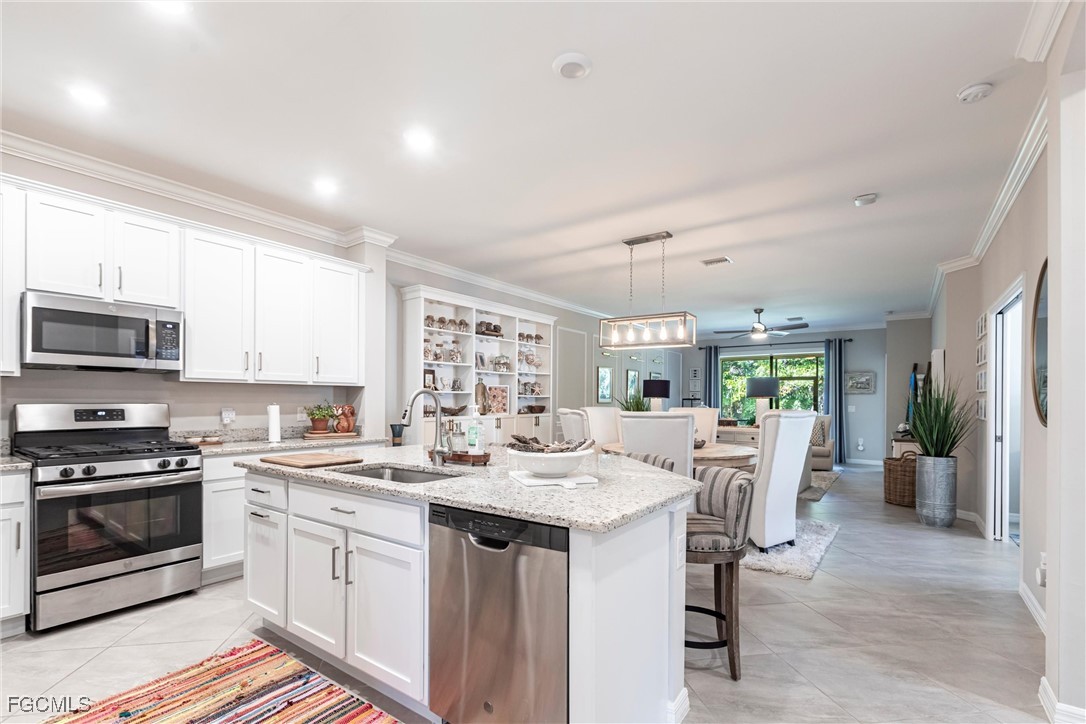 inviting open-concept layout, where the tall 9’4” ceilings and luxurious touches create an airy, welcoming atmosphere. The gourmet kitchen features white shaker cabinets, sleek gray granite countertops, stainless steel appliances including a GAS range cooktop, and a spacious island, perfect for entertaining. A feature wall with custom accent moldings, custom built display shelving in dining room, and crown molding throughout add sophisticated charm. The primary suite is a private retreat, complete with a large walk-in closet and an ensuite bath boasting dual sinks and a walk-in shower. The guest bedrooms in this split floor plan share a hall bathroom and provide flexibility, with the third bedroom featuring double doors, ideal for use as a study, den, or game room. Enjoy seamless indoor-outdoor living with large sliding glass doors that open to a private patio overlooking lush green space. Additional highlights include a glass front door for enhanced natural light, a tankless water
