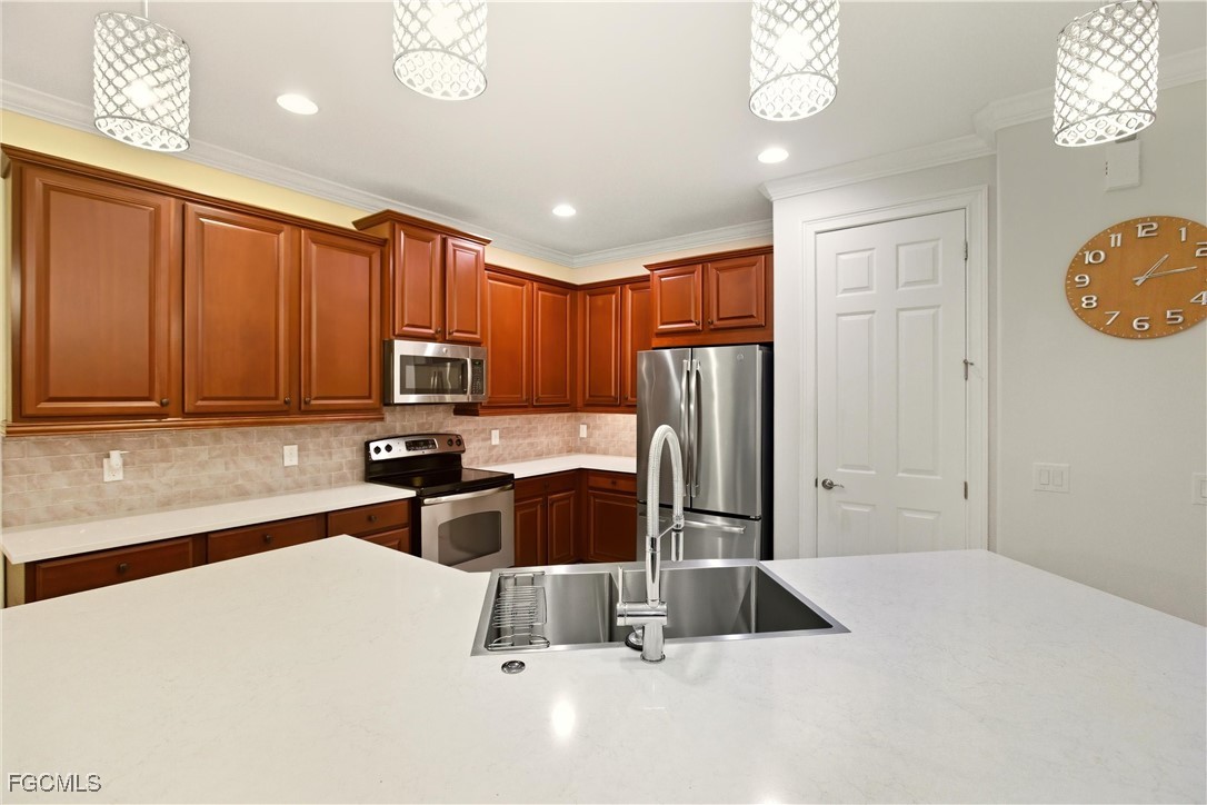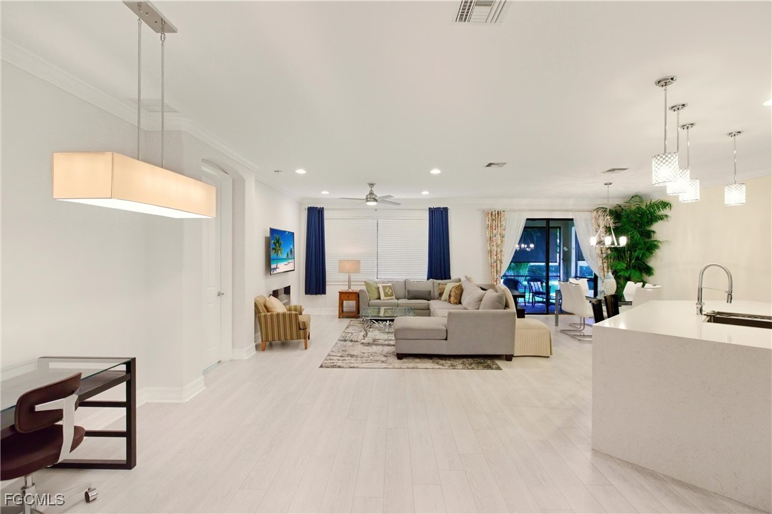 The spacious Great Room floor plan features high ceilings, elegant crown molding and a bright airy feel that flows seamlessly into the gourmet kitchen. The kitchen is a chef's dream with a large center piece island with a stainless-steel farmhouse sink and seating that overlooks the main area. The kitchen features rich wood cabinetry, sleek white quartz countertops, stainless steel appliances and stylish pendant lighting.