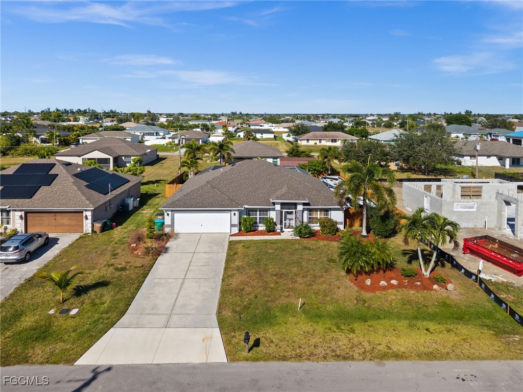 This bright and cheerful, 3-bedroom den pool home has great curb appeal, a new roof (2024), and is not in a flood zone! Upon approach, the home says “welcome”! The upgraded kitchen in this 1,800 +/- SF gem is perfectly positioned steps from the dining room and the living area. It boasts granite counters, quality wood cabinetry topped with decorative molding, double sinks, sleek black appliances including a double-door refrigerator with an icemaker, a wine refrigerator, and a built-in wine rack. There is additional counter space perfect for your personal coffee bar or an array of handy kitchen appliances. A raised counter easily accommodates bar-style seating for four. A large pantry? Of course. Your dining room offers LVT flooring, and windows facing south, allowing the Florida sunshine to shine in. The living area is quite spacious and easily accommodates larger furniture or even sectional furniture and a big screen TV. The living-area-to-kitchen-flow is perfect for entertaining or a comfortable, relaxing evening at home. You will enjoy and appreciate the quality, decorative tile-on-the-diagonal throughout the main living areas. No carpet here. The spacious great room design offers excellent flow and showcases lovely views of the sparkling pool, the extended lanai, and the fully fenced (wood) backyard oasis with mature low maintenance landscaping. This tropical retreat provides privacy, a shaded space for outdoor dining, and areas for sunbathing. The den, with French doors and LVT flooring, is ideal for a quiet home office, a craft room, or a cozy reading area. The split floor plan ensures privacy with an oversized primary suite, large enough for a king bedroom suite and a sitting area. The sleek, modern, primary bath will impress even the savvy buyer with extensive, decorative wall tile, dual vessel sinks, contemporary countertops, a very, private - private water closet, and a luxurious walk-in shower with multiple shower heads. The additional two guest rooms also offer LVT flooring and share the tub/shower combo guest bath. Your indoor laundry room has newer appliances, shelving, and room for cabinetry. This priced to sell Cape Coral pool home has it all!