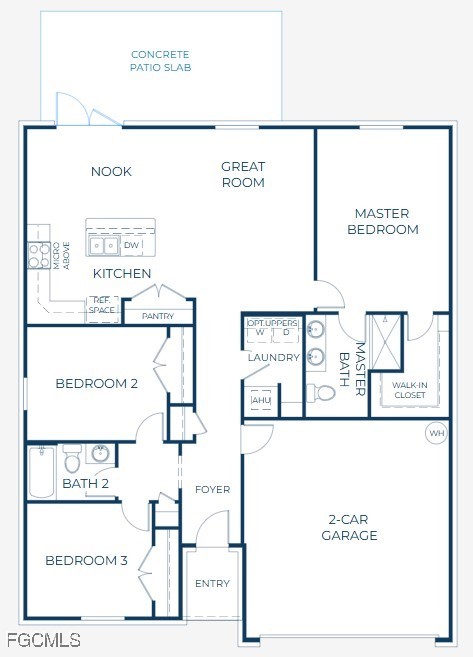 Tucked in the rear corner, the owner’s suite offers peaceful seclusion with a large walk-in closet and a full bath featuring a walk-in shower. Two additional bedrooms and a second full bath sit at the front of the home, providing comfort and convenience for family or guests. A centrally located laundry room adds everyday practicality.