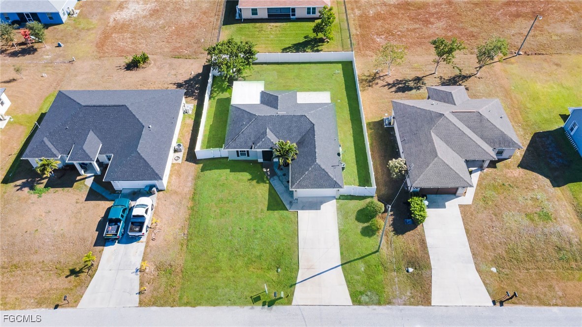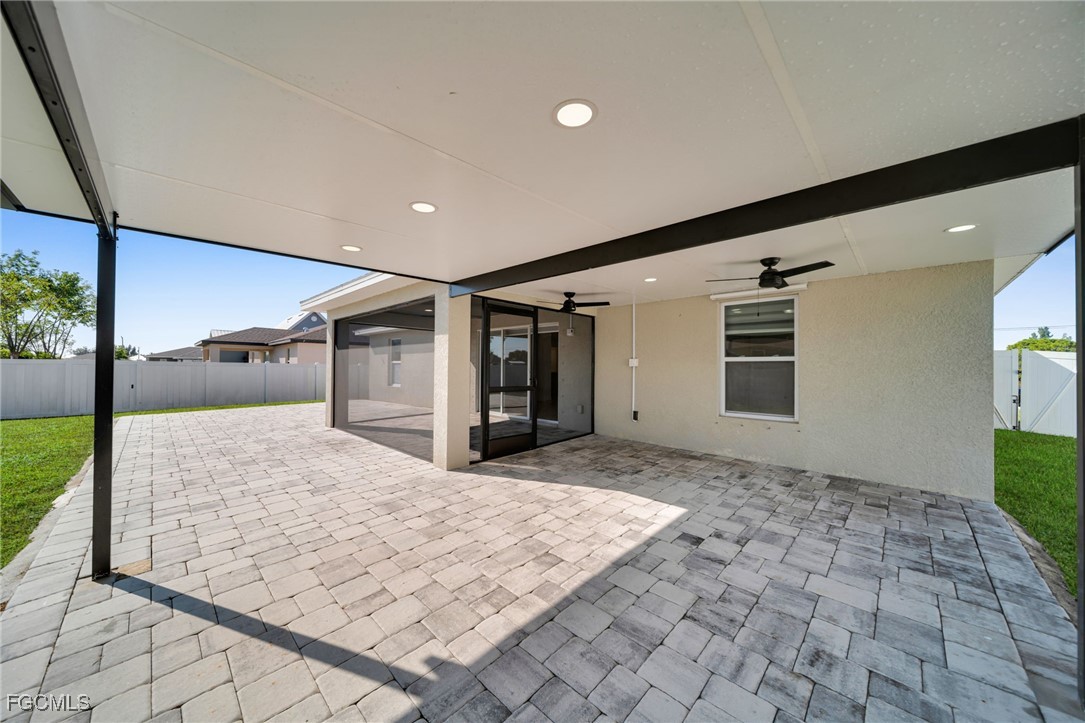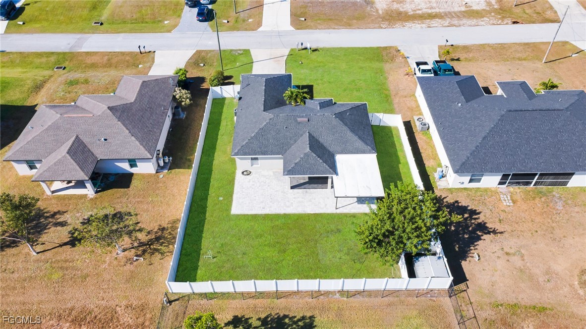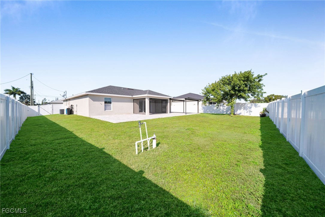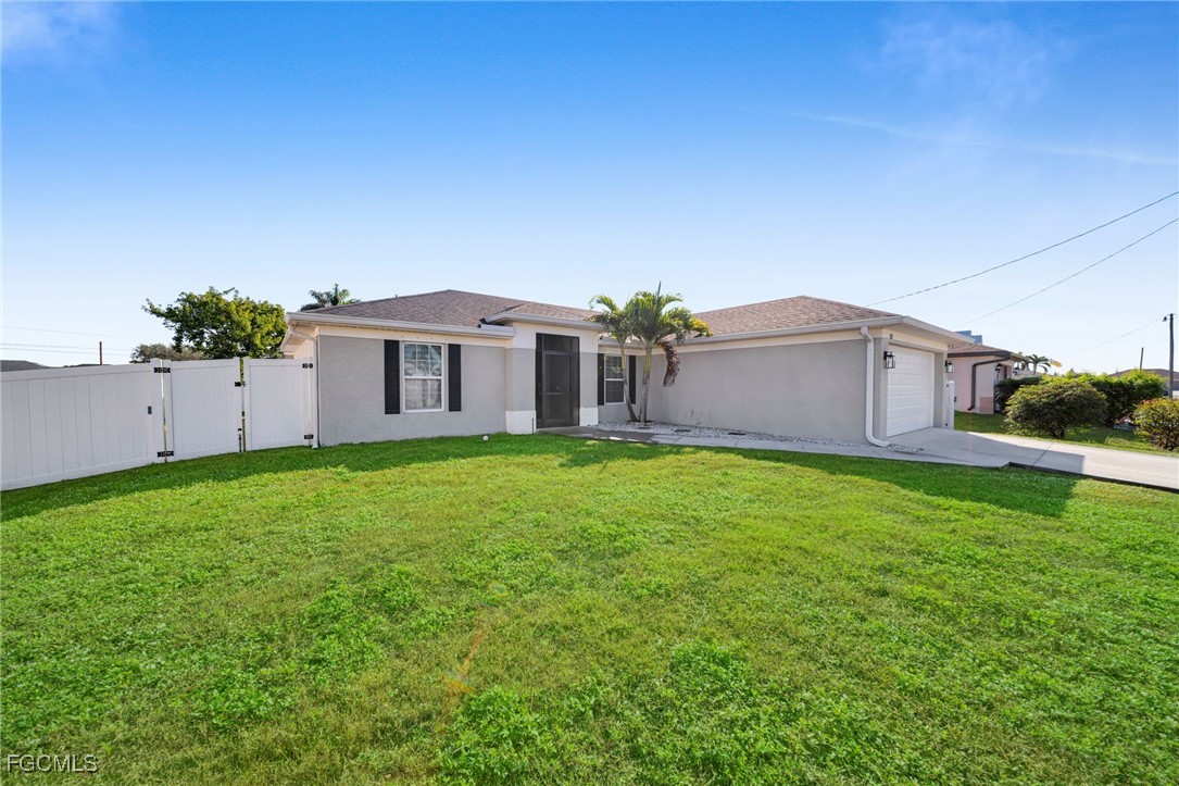 Move-in ready 3-bedroom, 2-bath single-family home in Cape Coral. Built in 2018, this residence showcases an inviting open layout with wood cabinetry, tile and laminate floors, and a well-designed kitchen equipped with stainless steel appliances, granite countertops, dishwasher, refrigerator, microwave, and stove. All appliances are included. The master bedroom features dual sinks, walk-in closets, and a spacious walk-in shower. Enjoy the convenience of a dedicated laundry room with washer/dryer, ceiling fans in the living room and bedrooms, blinds throughout, and an irrigation system. Step outside to a fully fenced yard perfect for outdoor living. The home offers a screened porch and an expansive backyard lanai with a pan roof, plus a beautifully paved backyard area. Additional features include hurricane shutters for peace of mind. Recent upgrades include a new water heater and new A/C handler, with the water softener replaced within the last two years. Conveniently situated near schools, shopping, and local amenities, this home has everything you need for comfortable living and entertaining.