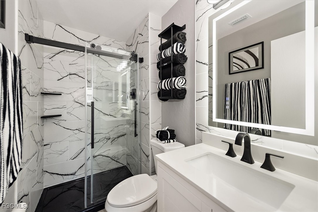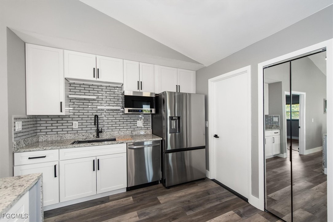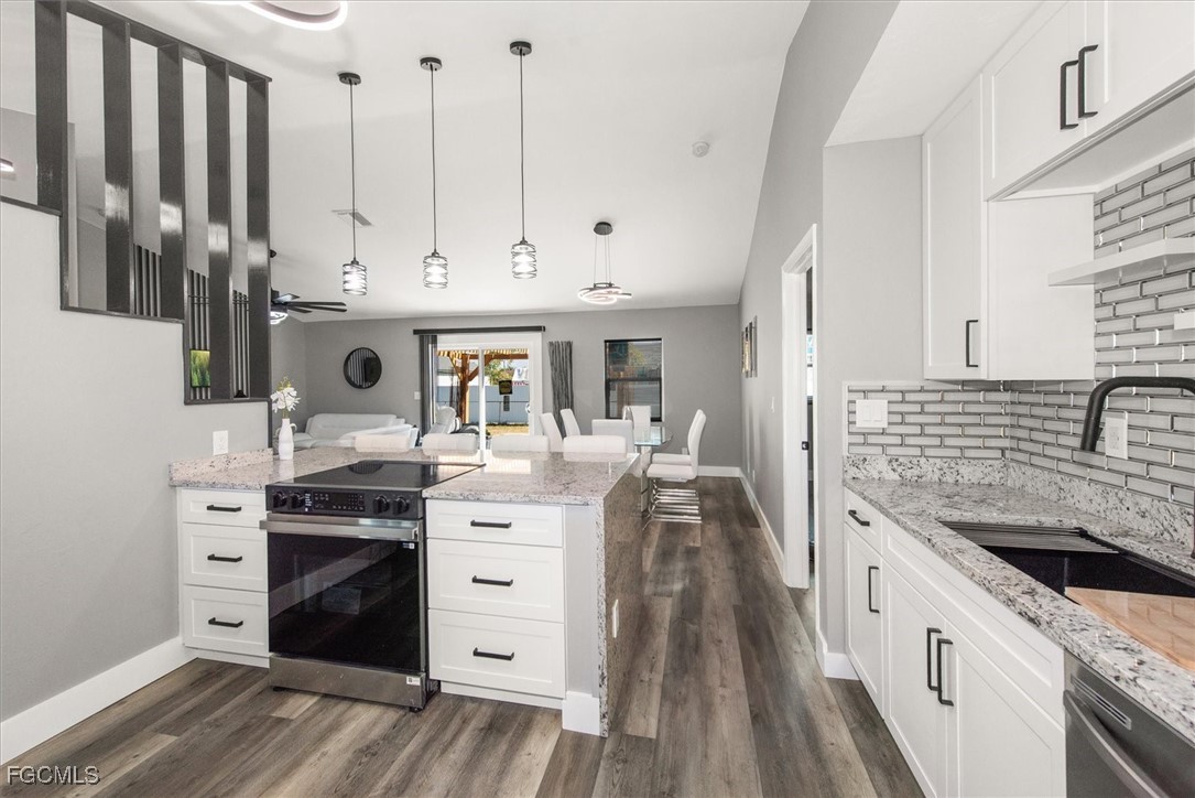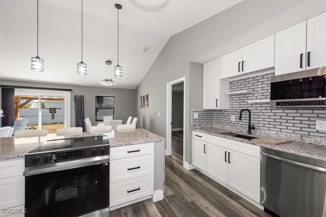 Beautifully updated home for your pickiest buyer! The home is NOT in a Flood Zone and has never flooded. Everything is NEW - AC (2025); Water heater (2025); Roof (2023); All Impact Windows and Doors (2025); Stainless Appliances (2025); Water softener and RO (2023). The exterior features concrete hardyboard, screened front entrance porch (new screens), freshly painted, low maintenance landscaping with gravel beds, large pergola / gazebo (new) and fenced backyard. The interior features a great room concept, entrance foyer with large closet and mirrored doors, split bedroom floor plan, vaulted ceiling, luxury vinyl flooring throughout, and interior design features on walls in kitchen and living room. The kitchen features a pantry with mirrored door, subway tile backsplash, white shaker WOOD cabinets with soft close doors, decorative wood shelving, and granite waterfall countertop that waterfalls on two sides. There is a cozy nook in the kitchen for cafe seating, nestled under two windows, and there is room for 4 barstools at the countertop. Both bathrooms have a spa quality with glass rolling shower doors, white vanities, and marble showers (with marble on the ceiling over the shower in the primary too). You will love the huge primary walk in closet with custom shelving. The 2 car garage is oversized and the floor is recently painted. This is a great home - light and bright and new - show it with confidence today! NO HOA!