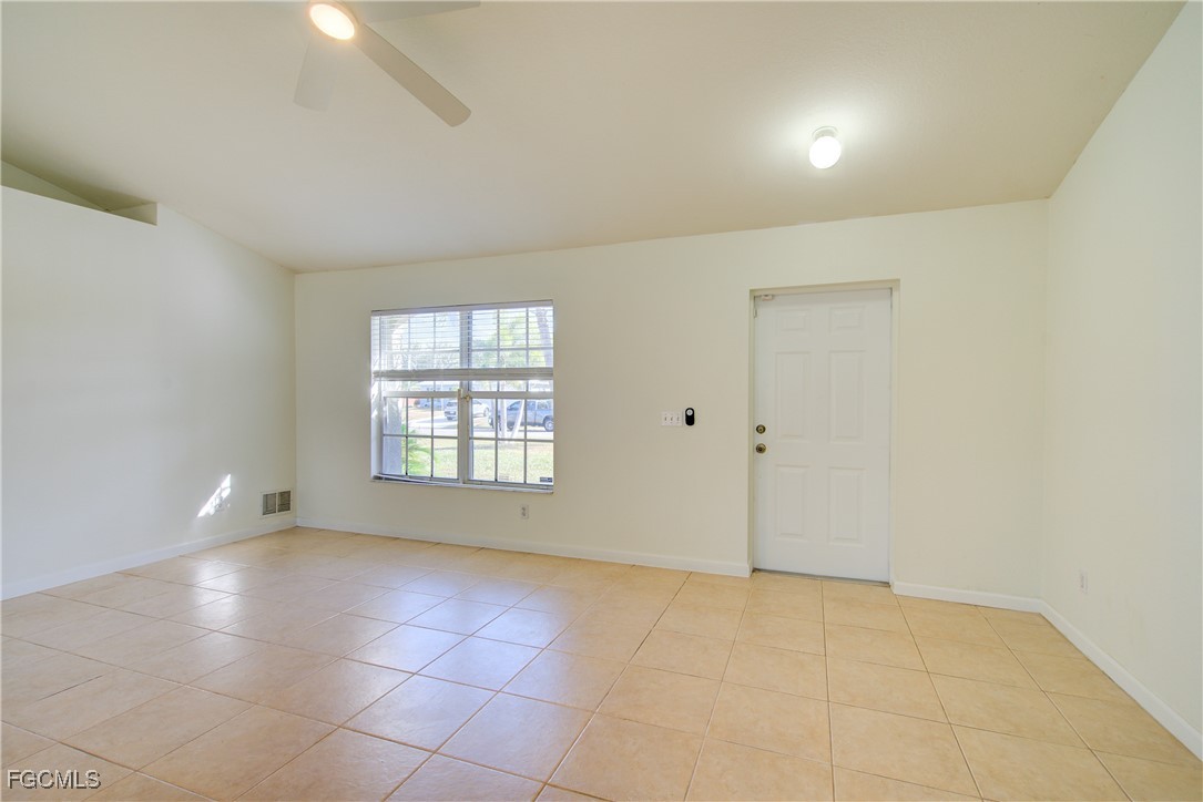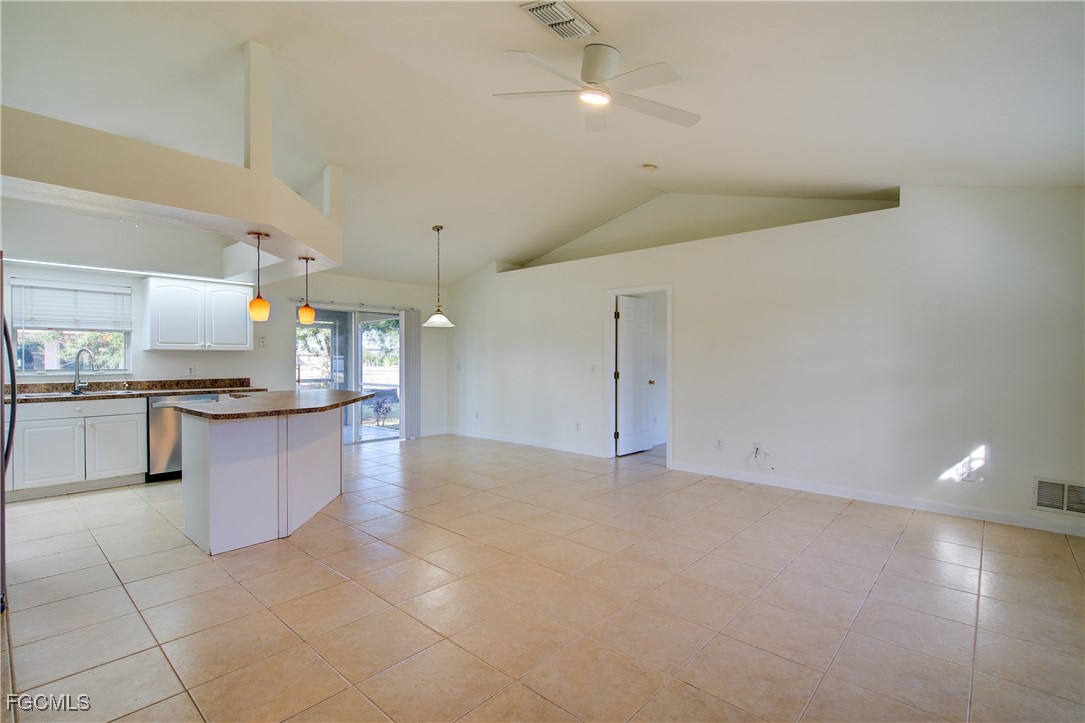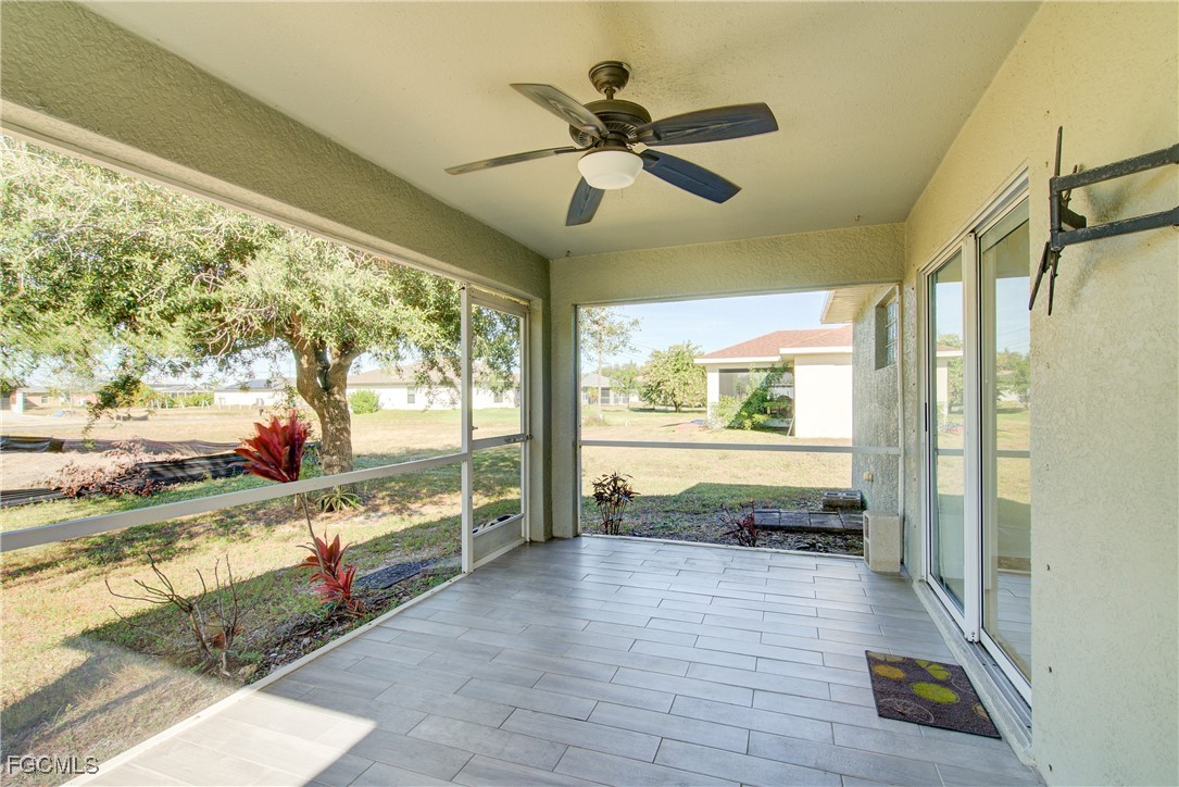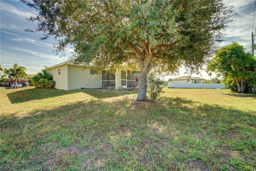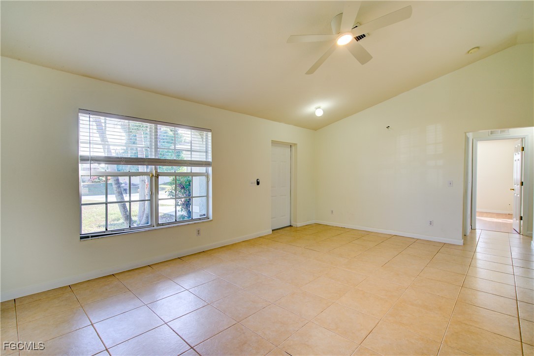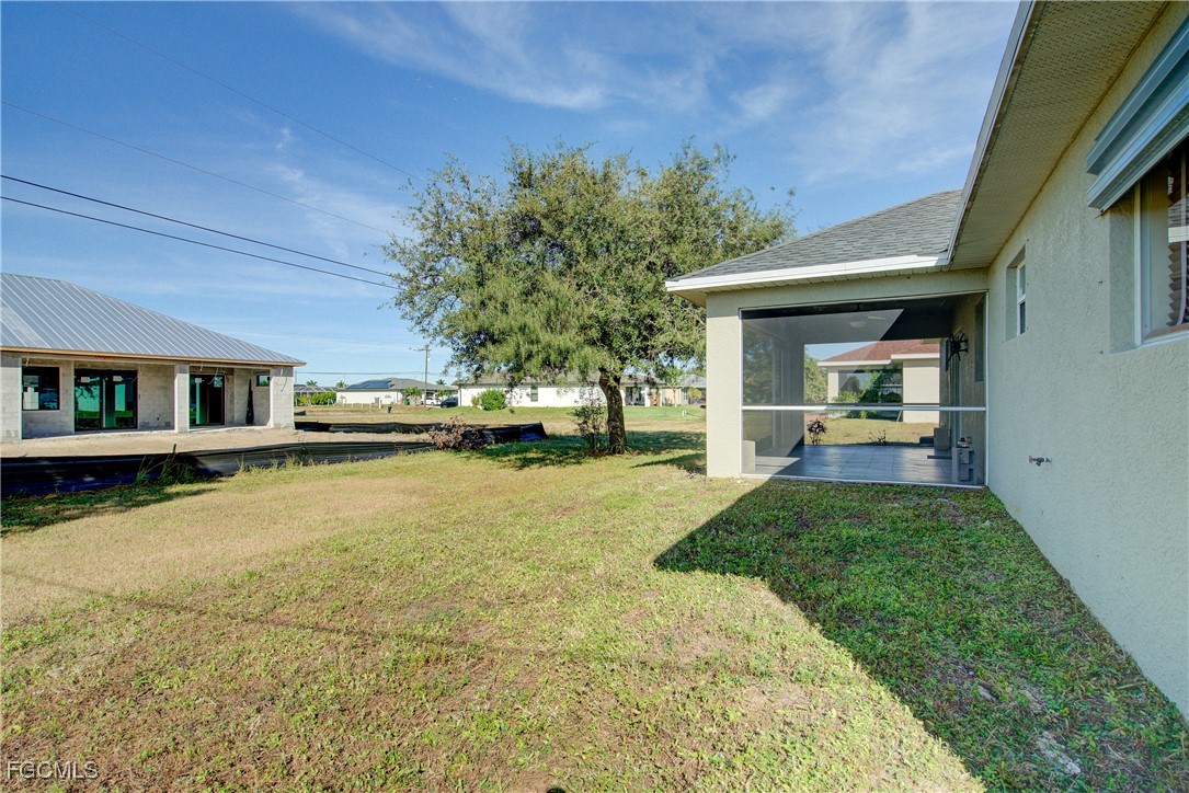 Move-In Ready 3 Bedroom Home in NE Cape Coral – Not in AE Flood Zone! New roof in 2022!! This well-maintained home features an open concept kitchen, living, and dining area with soaring vaulted ceilings that create a bright, spacious feel. The kitchen includes all-new appliances, and the home offers tile and laminate flooring throughout—no carpet. The split-bedroom floor plan provides privacy for guests, and the 3rd bedroom includes a custom built-in desk and shelving, making it ideal for a home office. Fresh interior and exterior paint—including the garage and tiled, screened lanai—give the home a crisp, updated look. City water and sewer are already connected, and assessments are paid in full, saving thousands annually on your tax bill. Located in a desirable, quiet neighborhood close to shopping yet away from heavy traffic. Best of all, this home sits in a NO flood zone for added peace of mind. Clean, updated, and ready for immediate occupancy—this one is a must-see!