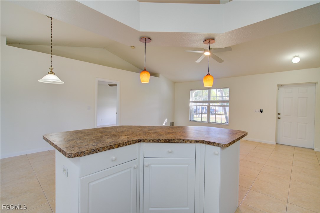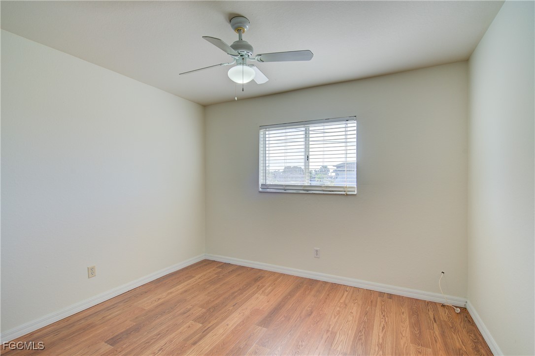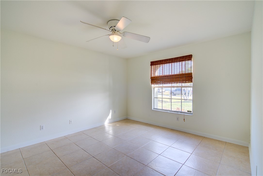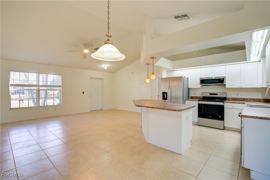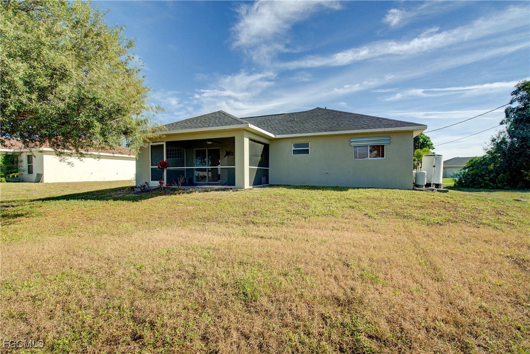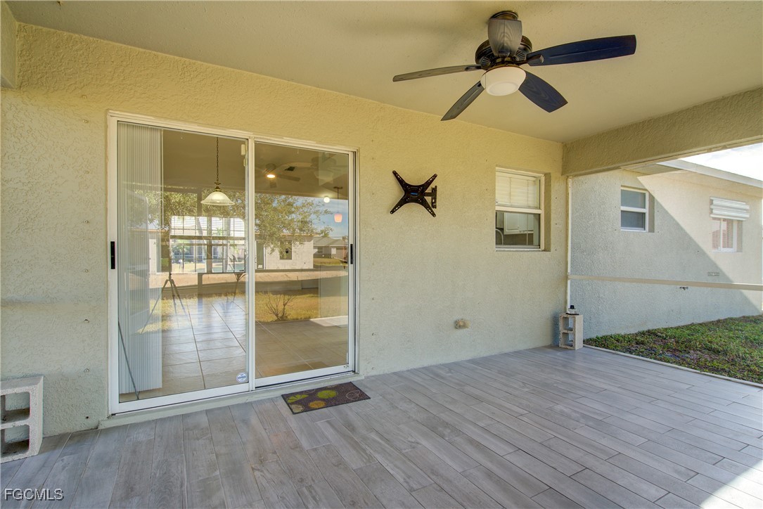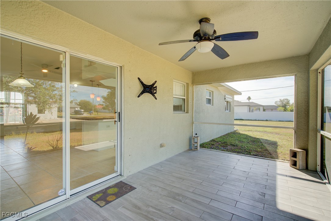 Move-In Ready 3 Bedroom Home in NE Cape Coral – Not in AE Flood Zone! New roof in 2022!! This well-maintained home features an open concept kitchen, living, and dining area with soaring vaulted ceilings that create a bright, spacious feel. The kitchen includes all-new appliances, and the home offers tile and laminate flooring throughout—no carpet. The split-bedroom floor plan provides privacy for guests, and the 3rd bedroom includes a custom built-in desk and shelving, making it ideal for a home office. Fresh interior and exterior paint—including the garage and tiled, screened lanai—give the home a crisp, updated look. City water and sewer are already connected, and assessments are paid in full, saving thousands annually on your tax bill. Located in a desirable, quiet neighborhood close to shopping yet away from heavy traffic. Best of all, this home sits in a NO flood zone for added peace of mind. Clean, updated, and ready for immediate occupancy—this one is a must-see!