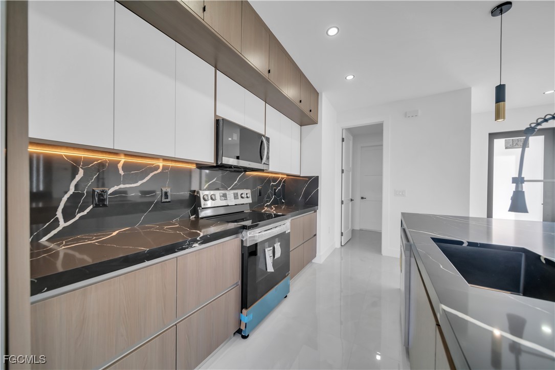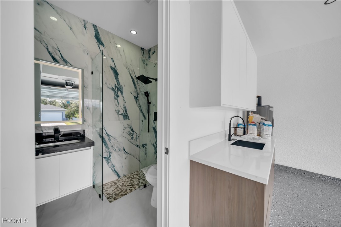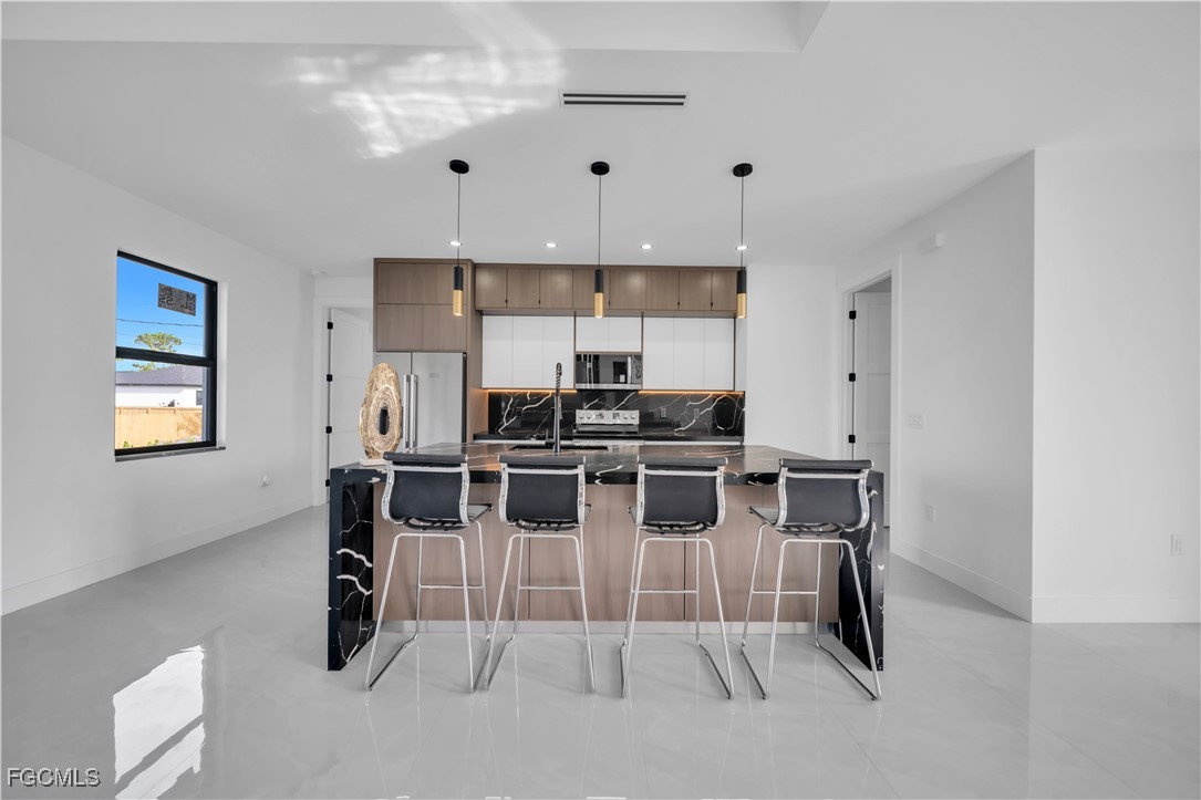 READY TO MOVE IN! This exceptional new construction home offers the perfect blend of modern design, comfort, and functionality. Featuring 3 bedrooms and 3 full bathrooms—including the third full bath and a small kitchenette area located in the garage, providing additional flexibility for future use (buyer to verify any intended use with local authorities)—this property delivers outstanding versatility for everyday living. Impact-resistant windows enhance both safety and energy efficiency throughout the home. The stylish kitchen features quartz countertops, stainless steel appliances, and an open-concept layout ideal for cooking, hosting, or gathering with family. Additional upgrades include a built-in audio system, a full security camera system, and an irrigation system. The exterior is equally impressive, boasting professional landscaping with a Clusia living privacy fence and complete exterior lighting that creates a warm and elegant ambiance. This home offers ample outdoor space and a low-maintenance design, making it easy to enjoy Florida living at its best. A turn-key, move-in-ready opportunity that truly stands out—this one is a must-see!