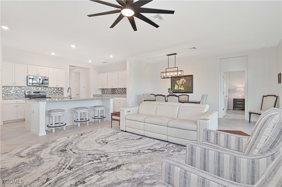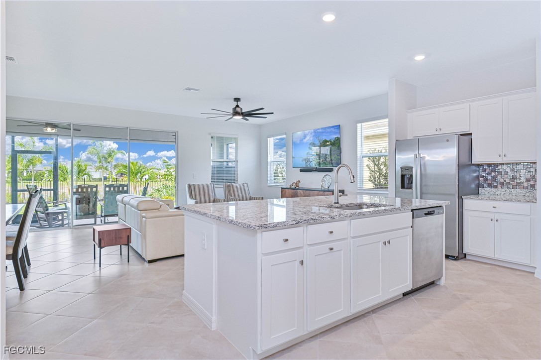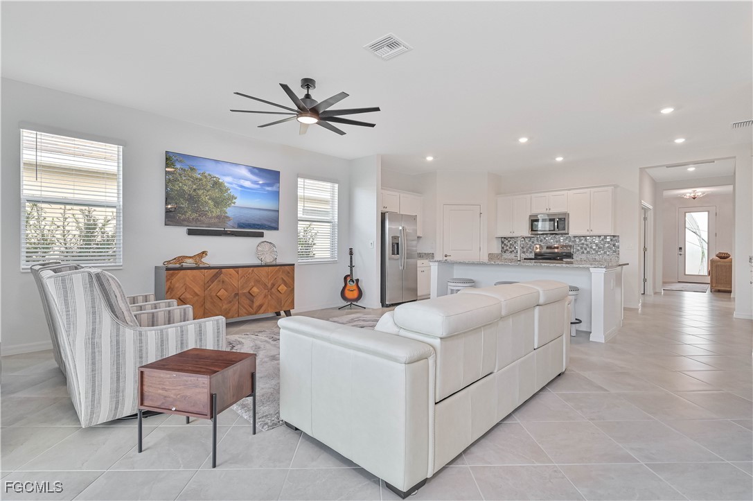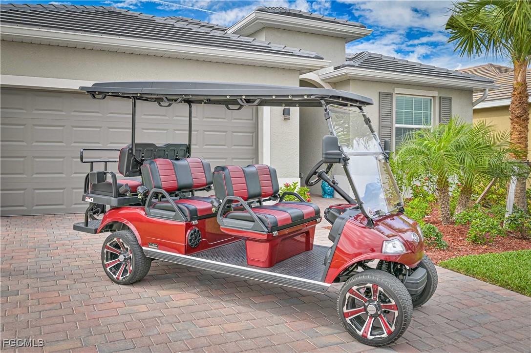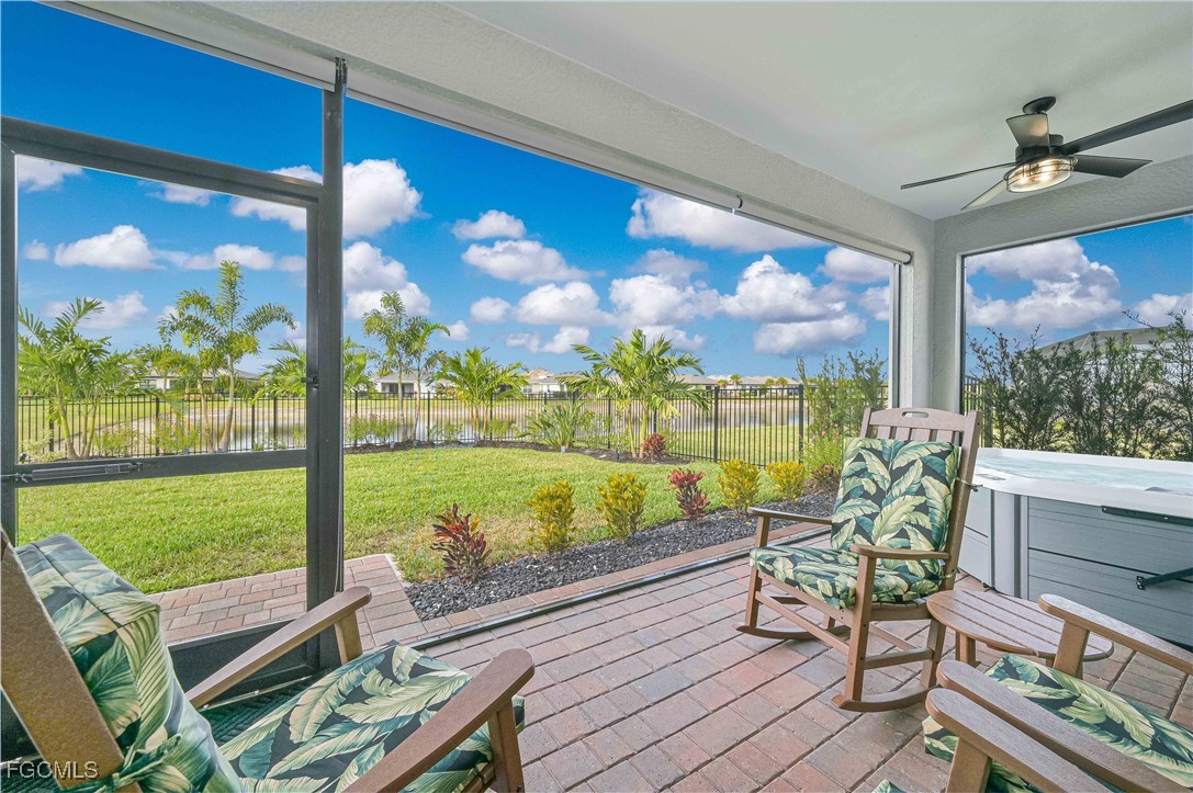 Welcome to this Stunning, Move-In Ready Home with Premium Upgrades Throughout & Optional High-End Furnishings. Discover exceptional comfort, style, and convenience in this beautifully upgraded home set on a premium lot with enhanced outdoor spaces and luxurious interior finishes. From the moment you arrive, the etched glass entrance door welcomes you into a residence designed for both elegance and everyday living. Inside, enjoy thoughtful upgrades including ceiling fans and designer light fixtures throughout, smart light controls, and a beautifully refreshed kitchen featuring glass-copper tile backsplash, counter lighting, and a touch-activated faucet. The open-concept living areas flow seamlessly for entertaining and relaxation. The bathrooms offer elevated comfort with upgraded towel bars and accessories, plus a frameless shower door in the guest bath. The home also includes a garage with epoxy flooring and fully enhanced landscaping with irrigation. Step outside to a private oasis on the lanai, complete with BRAND NEW SPA, new screening, custom Graber roll-down privacy shades, and a relaxing Hot Springs spa. Additional exterior features include installed gutters, decorative metal fencing in the rear yard, and a convenient trash-can storage area.