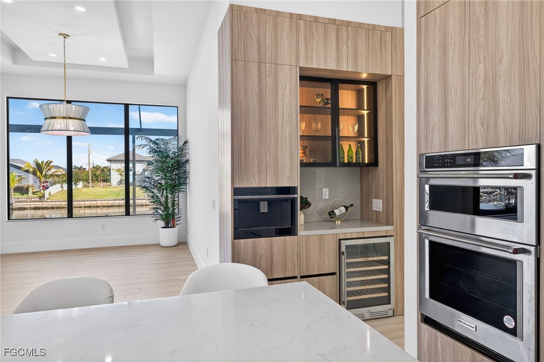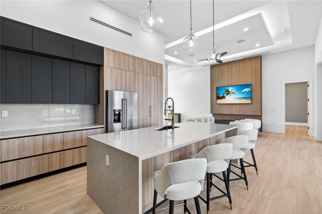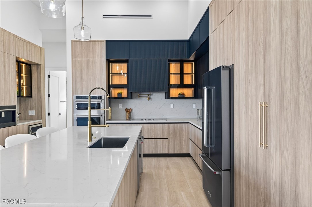 Welcome to your modern luxury retreat in Cape Coral, perfectly positioned on the highly sought-after Hush Puppy Canal just 2.9 miles from open water and near the future 7 Islands Project. Blending contemporary architecture with refined finishes, this brand-new 2,400+sqft , 3 bedroom+ den/ 3-bath home is designed for those who value style, comfort, and Florida’s indoor-outdoor lifestyle. Step inside to a light-filled, open-concept layout featuring heigh ceilings, luxury tile flooring, custom accent walls, and a chef-inspired kitchen equipped with a 10-ft island, KitchenAid appliances, hidden walk-in pantry, soft-close cabinetry, and a built-in Fisher & Paykel coffee maker. Impact windows and doors throughout. The spacious living area flows seamlessly to the outdoor oasis through zero-corner sliders, revealing a resort-style lanai with a negative-edge pool, picture window screen, and a fully equipped outdoor kitchen perfect for sunset entertaining. The primary suite offers private access to the pool, a spa-like bath, and elevated touches that feel truly high-end. Additional upgrades include a metal roof, whole-home speaker system, epoxy garage floor, and show-stopping canal views. With direct Gulf access, stunning craftsmanship, and a prime location within Cape Coral’s most exciting growth corridor, this home is more than a residence it’s a lifestyle.