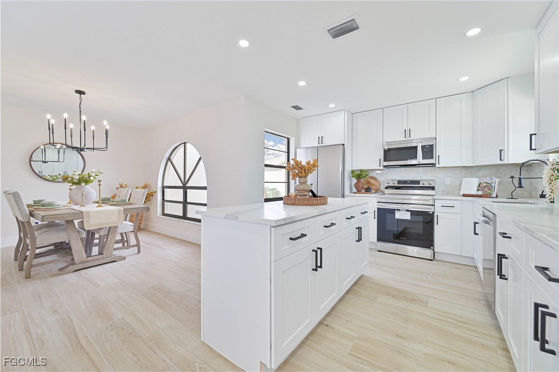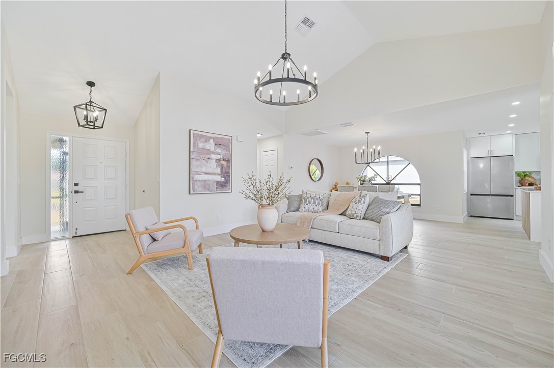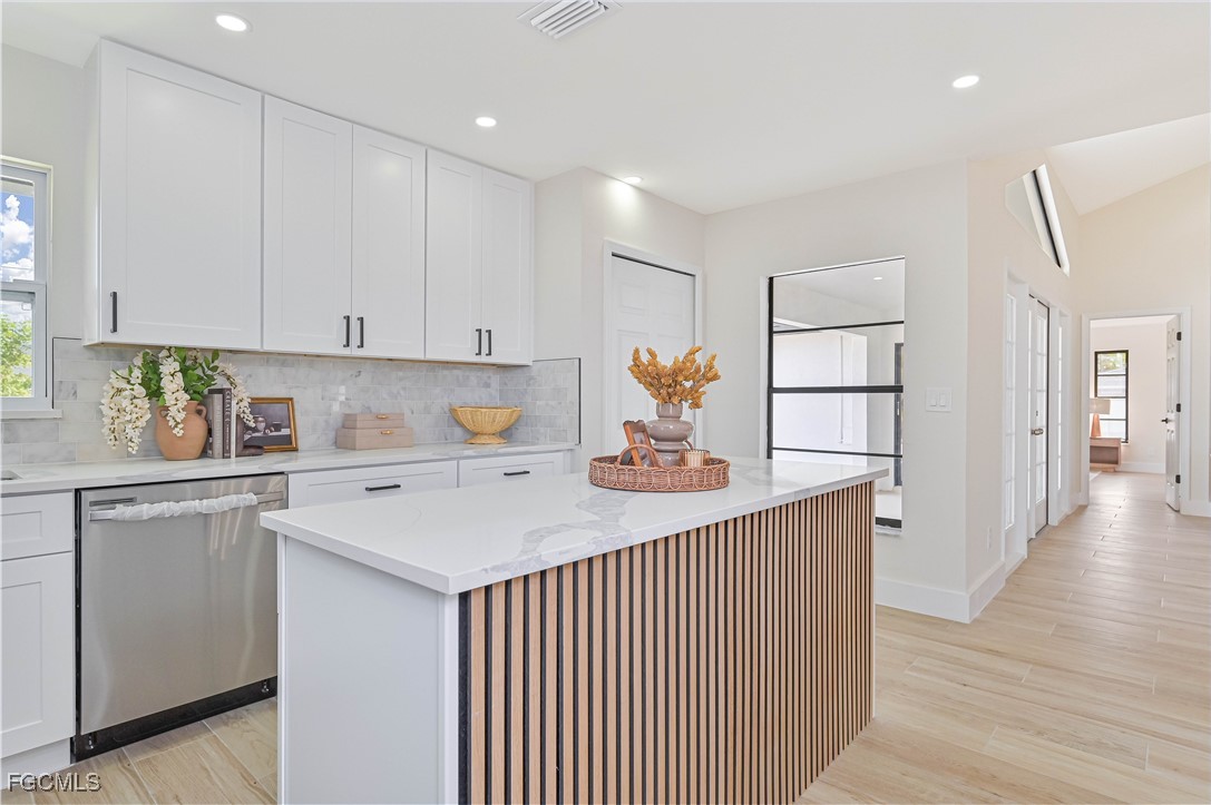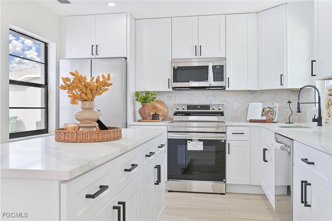 Buyer has got issue with job transfer! Welcome to this Stunning renovated home In SW Cape Coral. The property has been totally renovated from top to bottom like a new home. Step inside, you'll be greeted by stunning wood plank tile that graces the entire house with 5 inches base board gives it the modern feel. The Living room, open concept with kitchen and dining room offers great practical space for family and friends gathering and partying. This luxury kitchen carries brand new hardwood cabinets with soft closing features, beautiful calacatta quartz countertop, Big island and brand-new stainless-steel appliances. Stunning main bedroom and huge walk-in closet as well as the spa like main bathroom literally take your breath away when you walk in. Home has brand-new LED lighting throughout the entire house. Property has newer 2022 roof that provides peace of mind for years to come. Property is in X zone, so no flood insurance is required. Big patio provides tons of concrete pad with large cover area oversees practical backyard provides endless Florida outdoor living lifestyle. Hurry up before it is gone.
