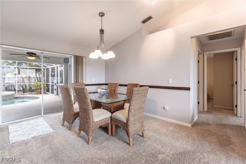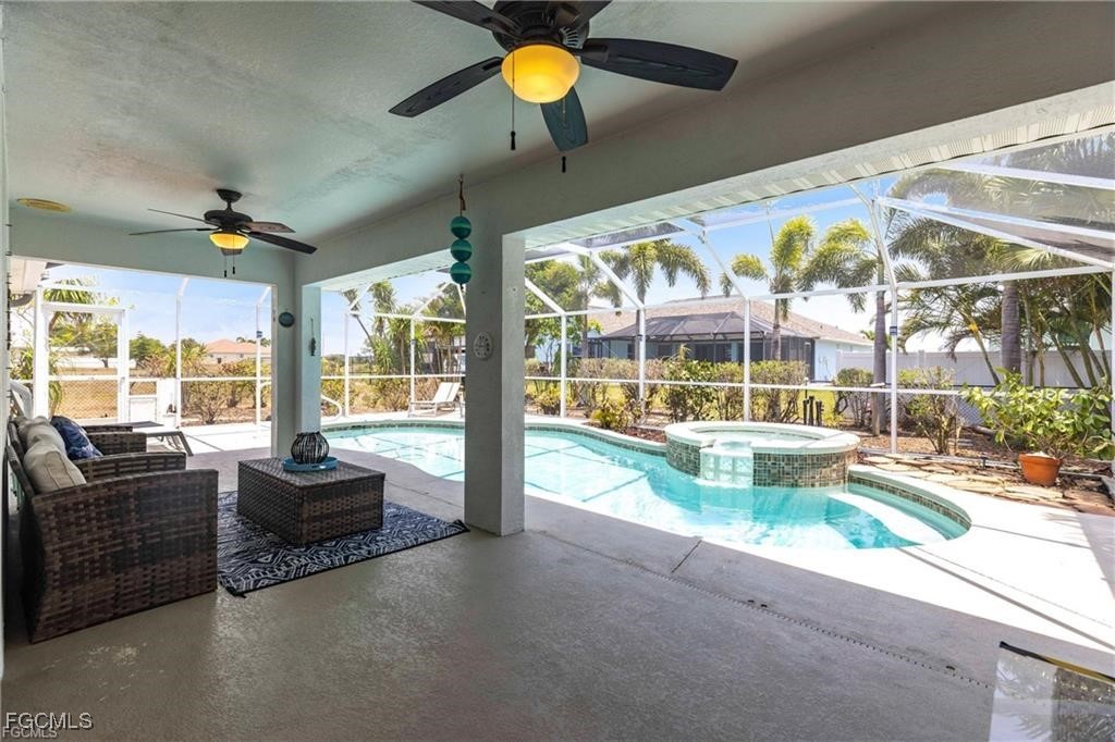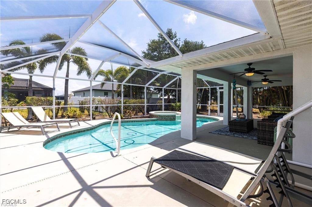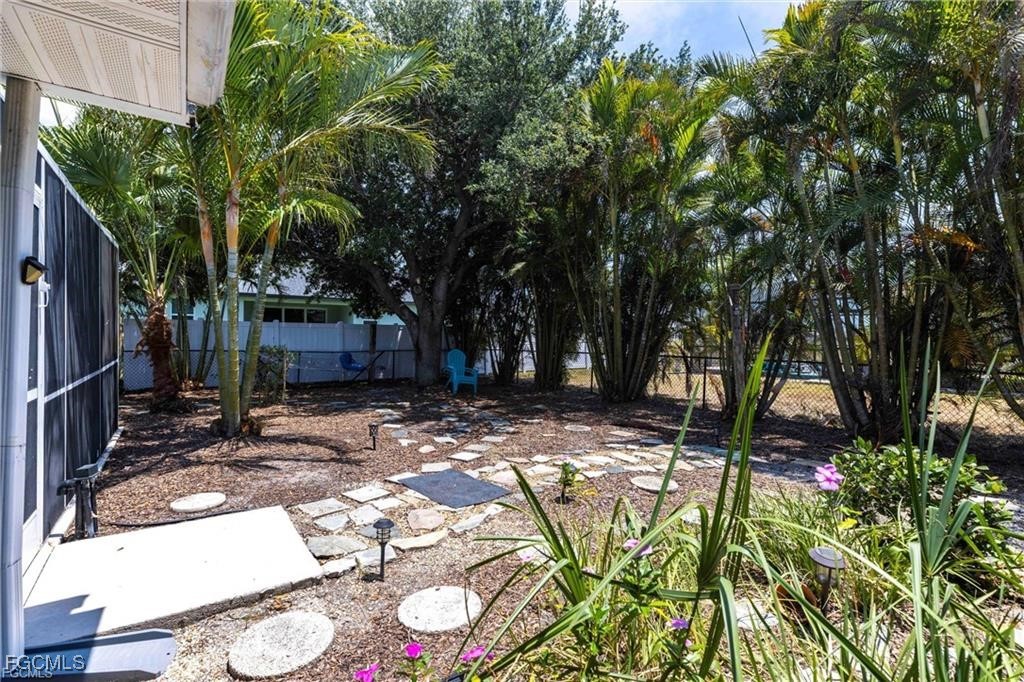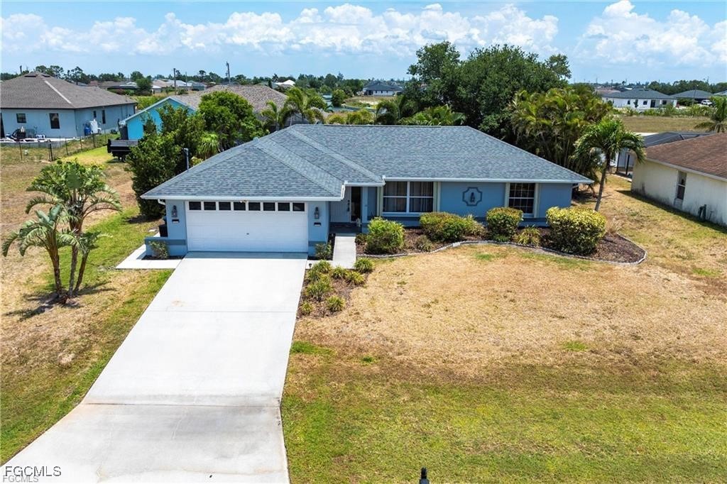 Welcome Home! This move-in-ready home offers a peaceful escape from the everyday. NO FLOOD INSURANCE REQUIRED!! Surrounded by lush butterfly gardens, vibrant orchids, mature tropical foliage, and the soothing sounds of wind chimes, the backyard has been transformed into a personal nature sanctuary. A charming stepping stone path leads you through the garden to a cozy sitting area—perfect for enjoying visits from songbirds and soaking in the natural beauty. The park-like landscape provides privacy from neighboring homes and wraps around an expansive screened lanai with a sparkling pool and spa, seamlessly blending indoor and outdoor living. Inside, the spacious layout is filled with natural light and offers a calming, open atmosphere. Enjoy garden views right from your dining table through sliding glass doors, bringing the outdoors in. This home is not in a flood zone and was re-piped in 2023. Its location offers convenient access to Pine Island Road and all the amenities of the area. The Construction across the street is the brand new $3.3 Million Hector Cafferata School: A state-of-the-art K-8 school.