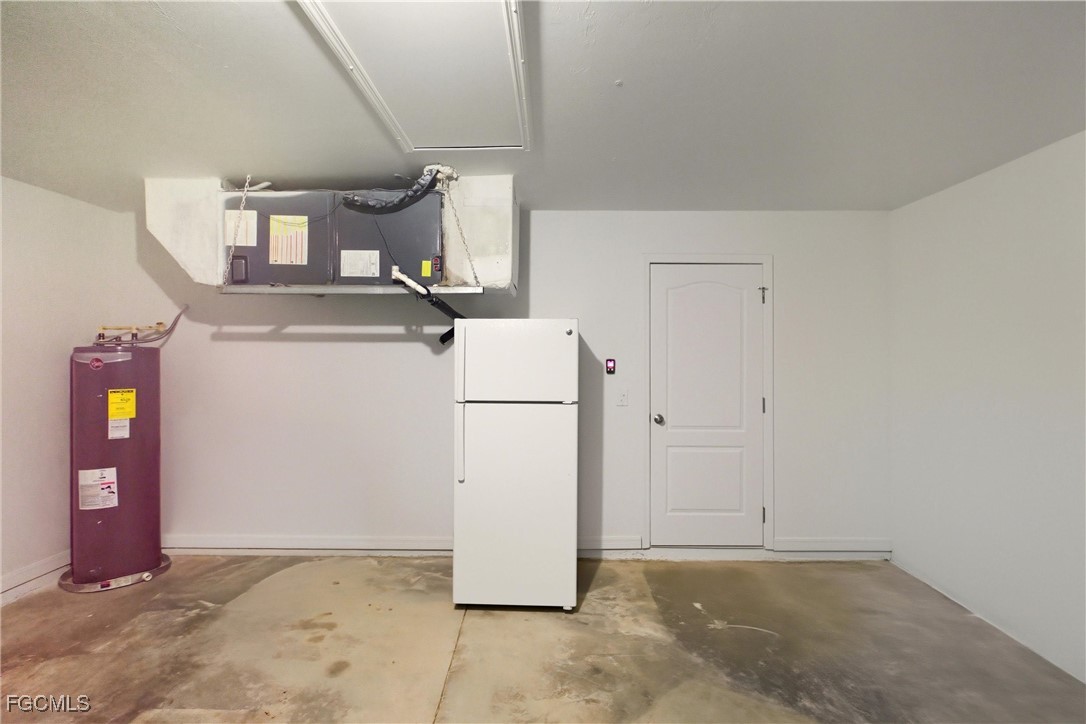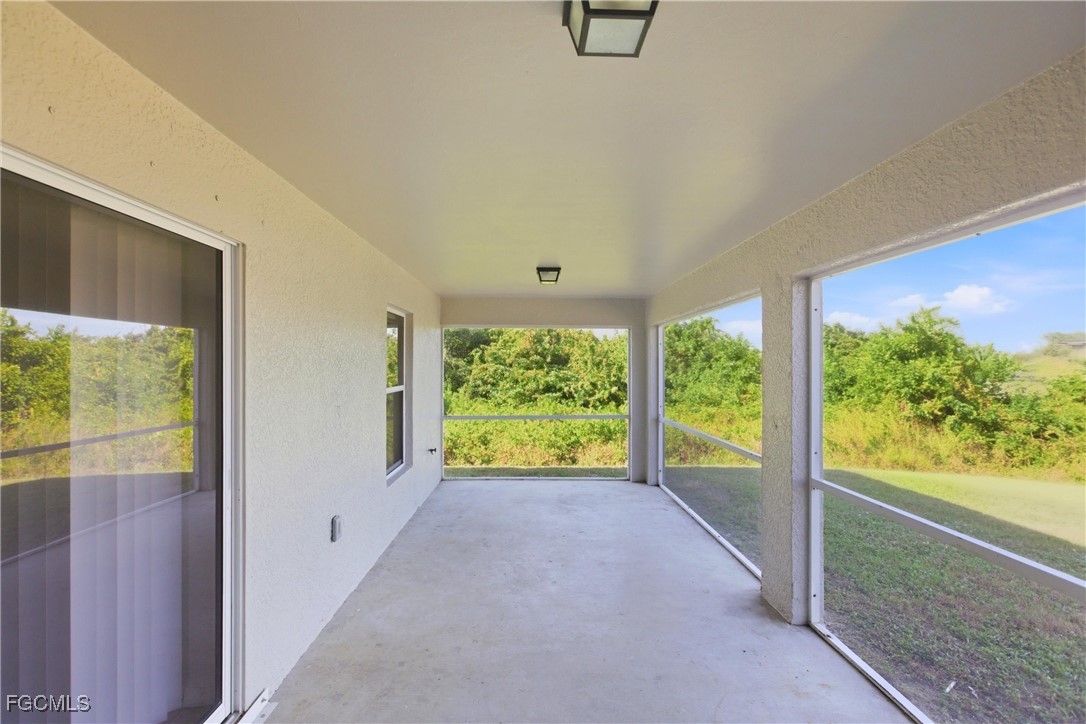 Welcome to this well-maintained 3 bedroom, 2 bathroom, 1,574 sq. ft. home in Southwest Lehigh Acres featuring a cozy front porch perfect for rocking chairs, seasonal décor, and quiet evenings outdoors. Step into the spacious great room where vaulted ceilings, ceiling fans, tile flooring, and sliding doors to the screened patio create an open, airy living space that flows easily into the formal dining room and the kitchen. The kitchen boasts a large peninsula breakfast bar, granite countertops, white cabinetry, newer appliances, a pantry, and convenient access to the indoor laundry room with a linen closet and direct entry to the 2-car garage (with hurricane-rated door and refrigerator). This desirable split floor plan offers privacy for the primary suite, which features new carpet, a walk-in closet, ceiling fan, and an ensuite bathroom with white cabinetry, linen closet, tub/shower combo, and abundant natural light. On the opposite side of the home, two guest bedrooms with fresh carpet and ceiling fans are accompanied by a full bathroom with tub/shower combo, white vanity, and medicine cabinet. A built-in desk nook adds the perfect space for homework, home office tasks, or creative projects. Fresh paint and window coverings throughout make this home move-in ready. Enjoy Florida living on the long screened patio under truss overlooking the backyard. Additional perks include HVAC replaced in 2020, well and septic (no monthly water bill), X-flood zone (no flood insurance required), and unincorporated Lehigh Acres taxes (no city tax). This inviting property offers comfortable living and excellent value in sunny Southwest Florida.