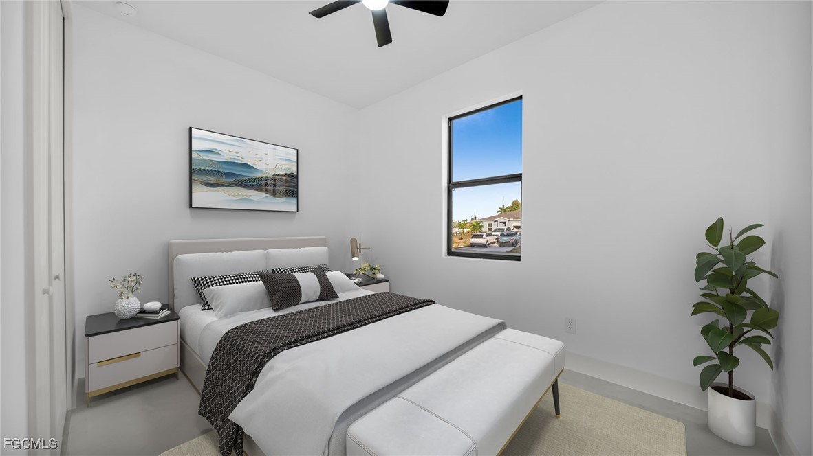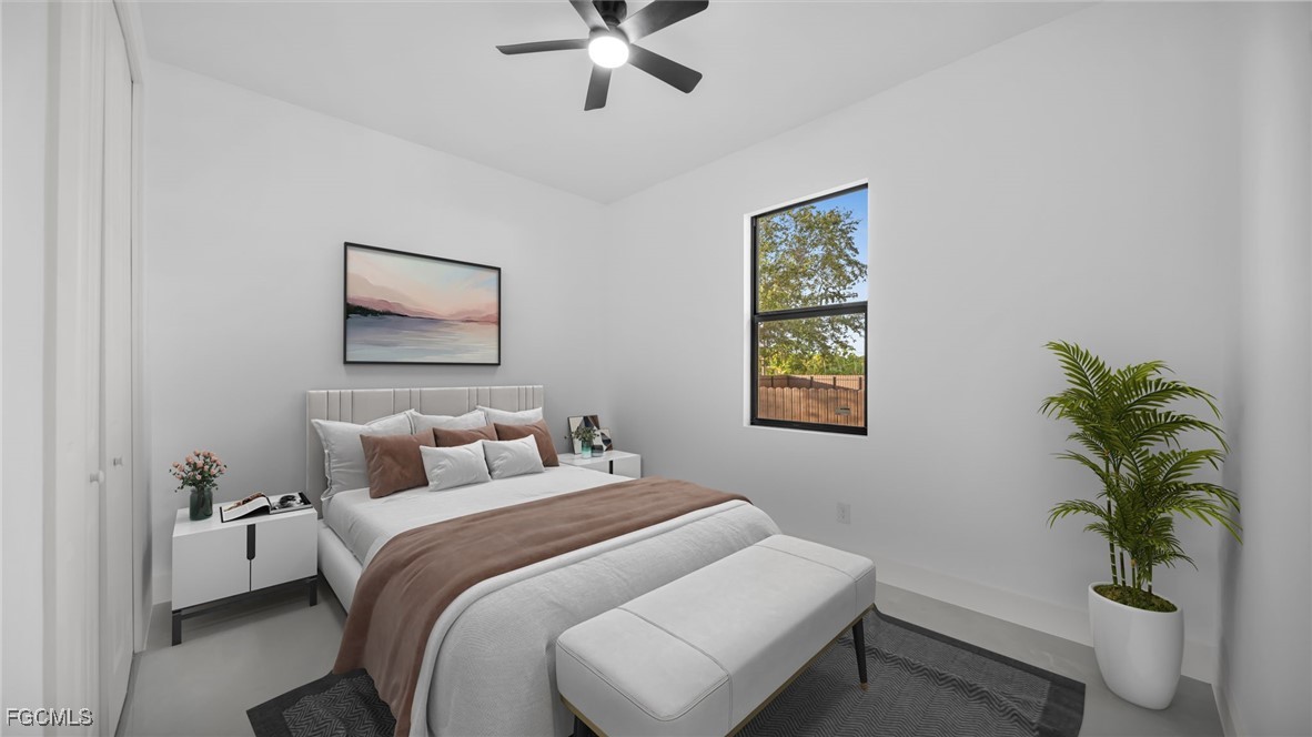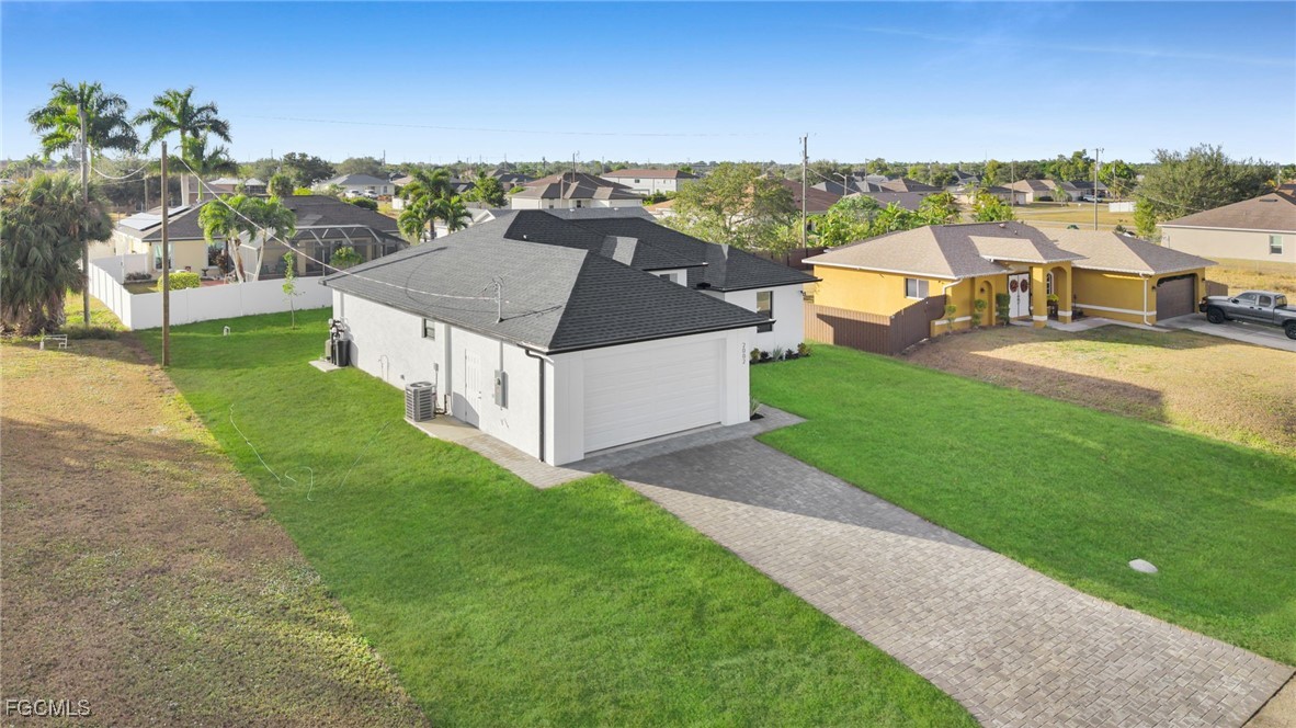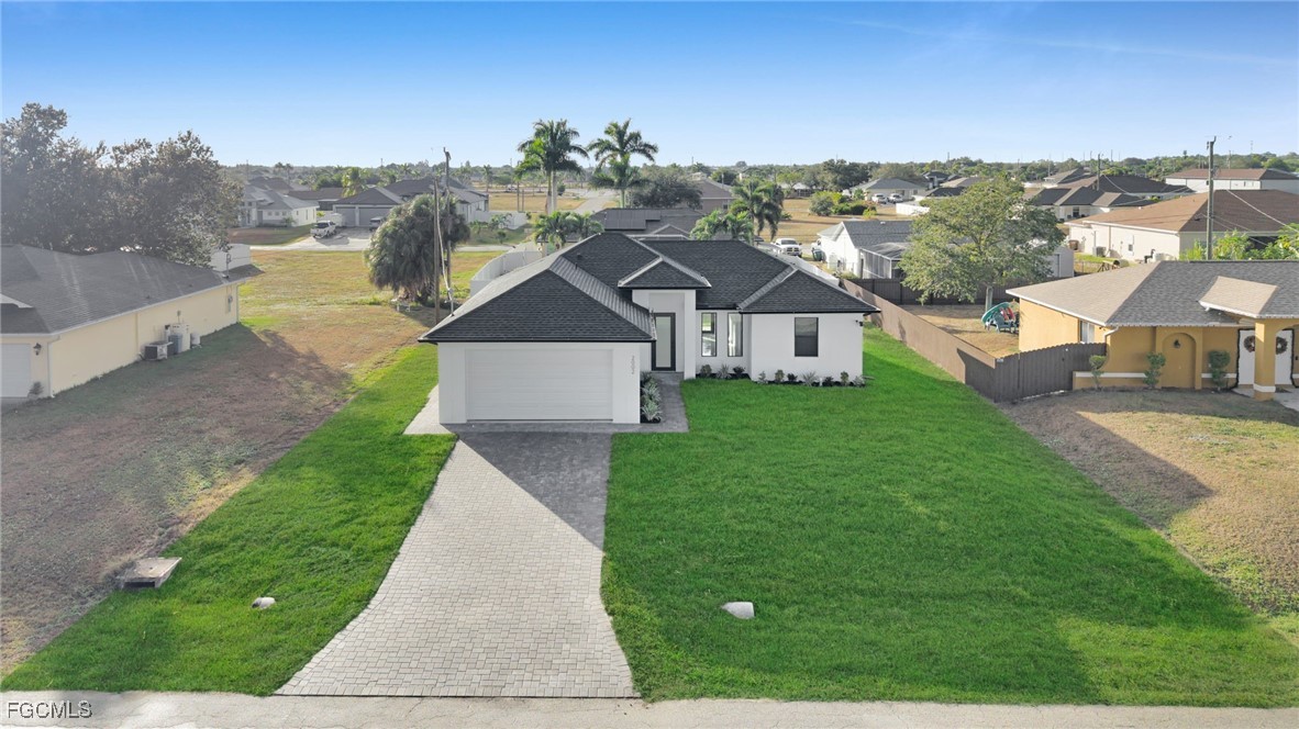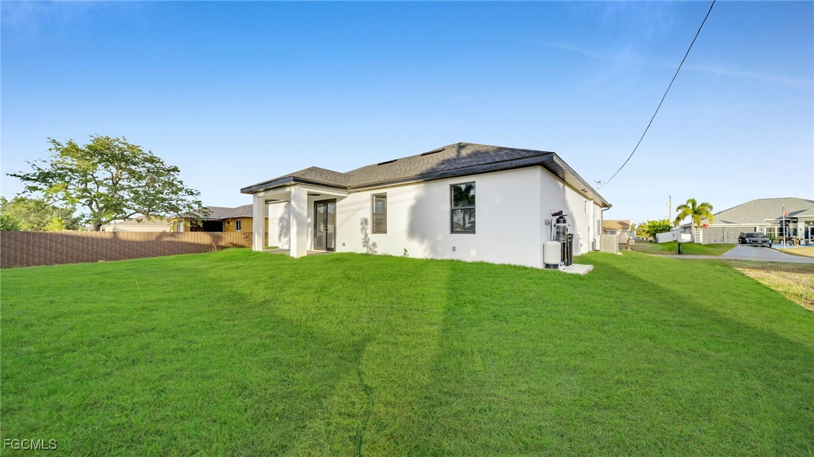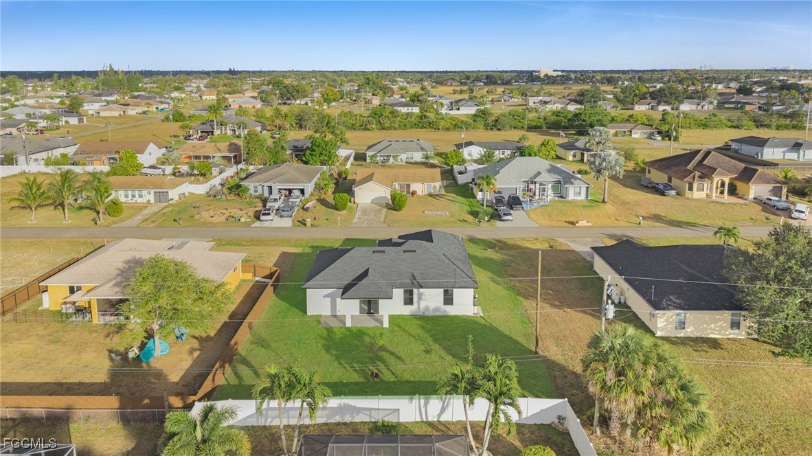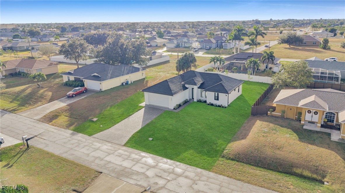 Welcome to this beautifully crafted New Construction Single-Family home located in the desirable Northeast area of Cape Coral. With 3 spacious bedrooms, 2 modern bathrooms, and a thoughtfully designed open floor plan, this home offers both style and functionality across 1,431 SqFt of living area. Step in through a front door into a bright and airy interior featuring tray ceilings, impact-resistant windows and doors, and premium finishes throughout. The kitchen features white wood modern cabinets, stainless steel appliances, and sleek quartz countertops-also featured in both bathrooms for a cohesive, upscale look. Enjoy the walk-in closets complete with custom wood dividers, and unwind in the master bathroom featuring a double sink vanity, a beautifully tiled glass-door shower, and plenty of natural light. Outdoor living is easy with an open lanai, perfect for relaxing or entertaining. The Property boasts a large backyard with plenty of space to add a pool, creating your very own outdoor oasis. Quiet and peaceful Neighborhood. Quick access to US-41 and nearby bridges. You're also just minutes away from shopping centers, restaurants and essential amenities. Whether you're looking to relax at home or explore the area, this property offers the ideal combination of privacy, spaces, and location. Don't miss your chance to own this elegant home in one of Cape Coral's growing neighborhoods!