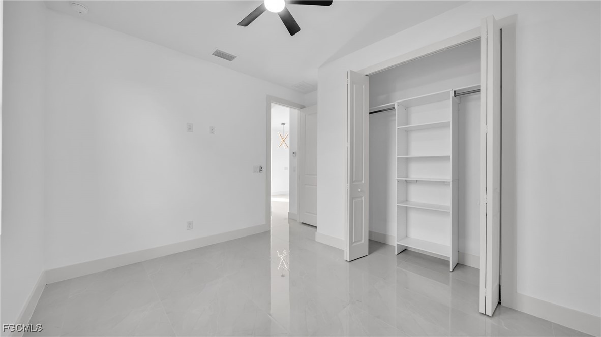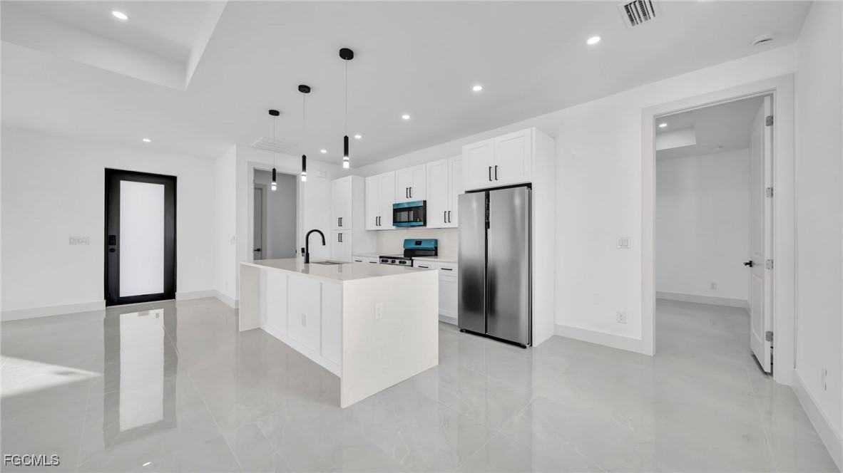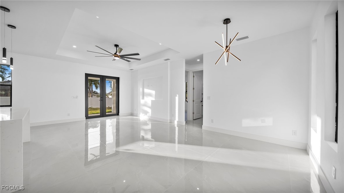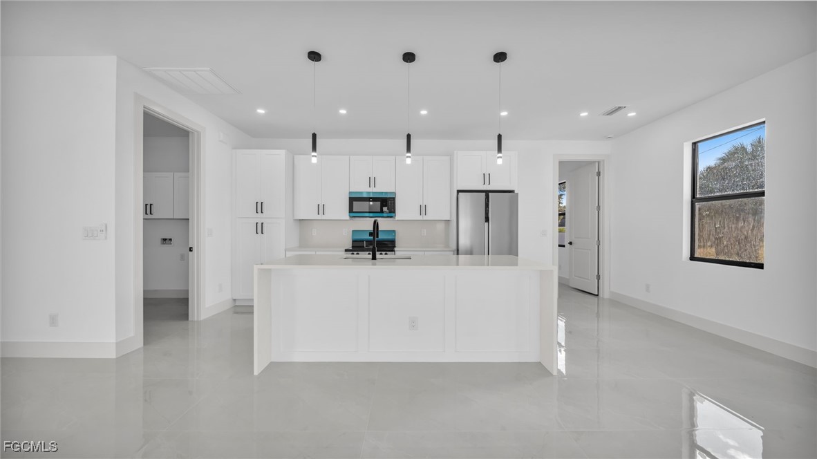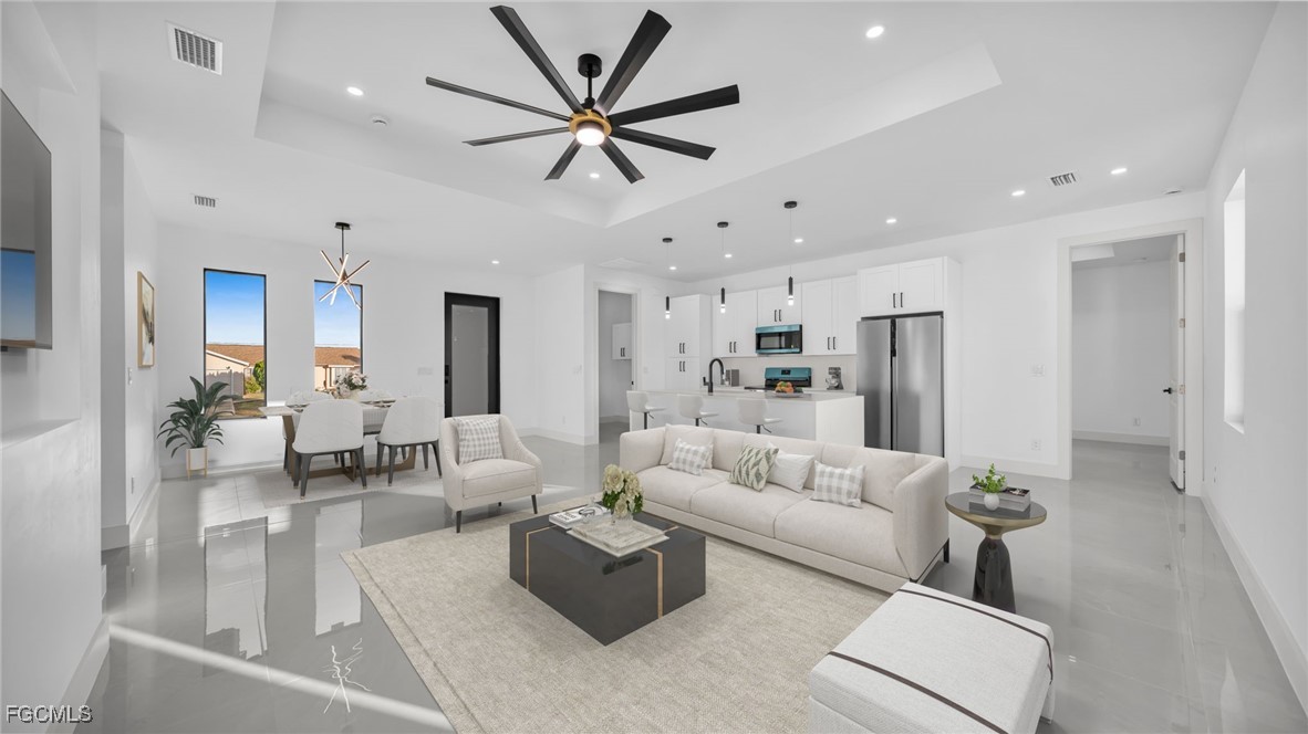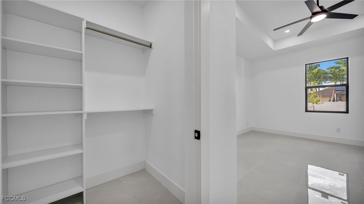 Welcome to this beautifully crafted New Construction Single-Family home located in the desirable Northeast area of Cape Coral. With 3 spacious bedrooms, 2 modern bathrooms, and a thoughtfully designed open floor plan, this home offers both style and functionality across 1,431 SqFt of living area. Step in through a front door into a bright and airy interior featuring tray ceilings, impact-resistant windows and doors, and premium finishes throughout. The kitchen features white wood modern cabinets, stainless steel appliances, and sleek quartz countertops-also featured in both bathrooms for a cohesive, upscale look. Enjoy the walk-in closets complete with custom wood dividers, and unwind in the master bathroom featuring a double sink vanity, a beautifully tiled glass-door shower, and plenty of natural light. Outdoor living is easy with an open lanai, perfect for relaxing or entertaining. The Property boasts a large backyard with plenty of space to add a pool, creating your very own outdoor oasis. Quiet and peaceful Neighborhood. Quick access to US-41 and nearby bridges. You're also just minutes away from shopping centers, restaurants and essential amenities. Whether you're looking to relax at home or explore the area, this property offers the ideal combination of privacy, spaces, and location. Don't miss your chance to own this elegant home in one of Cape Coral's growing neighborhoods!