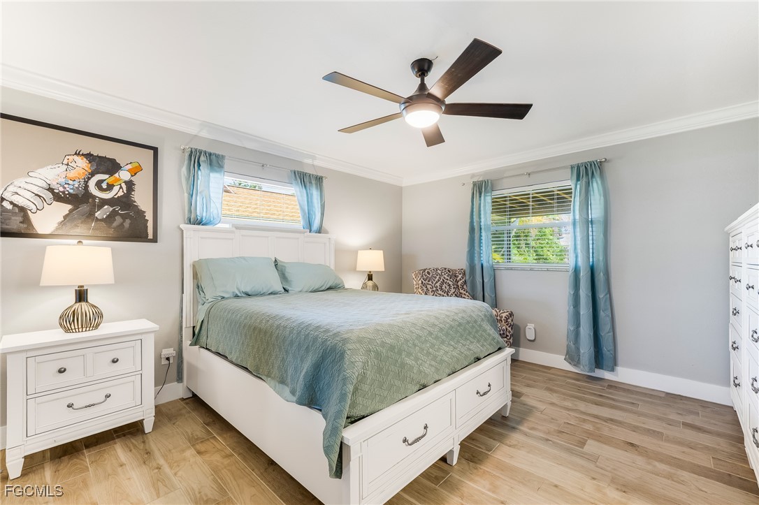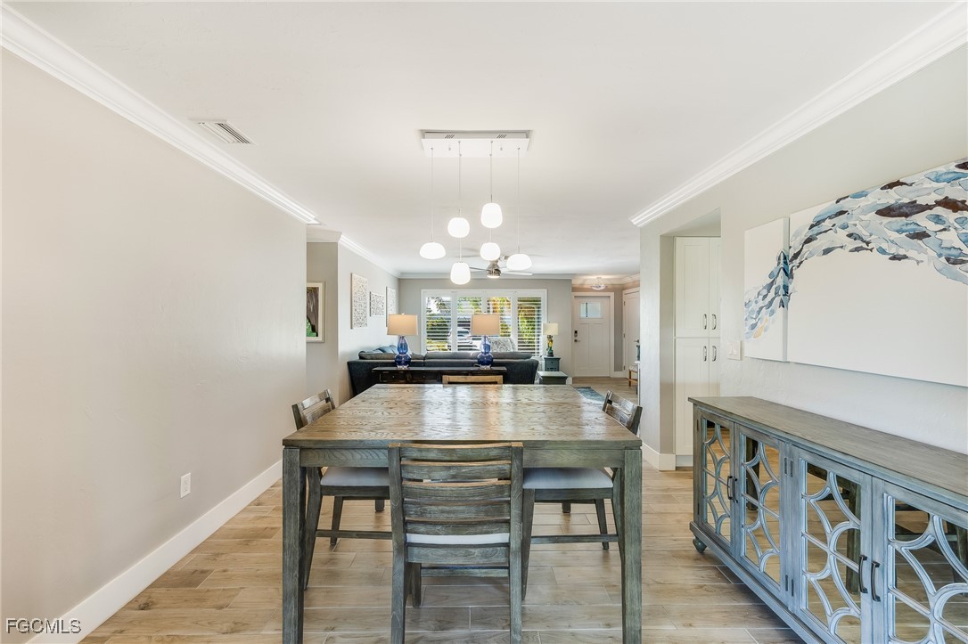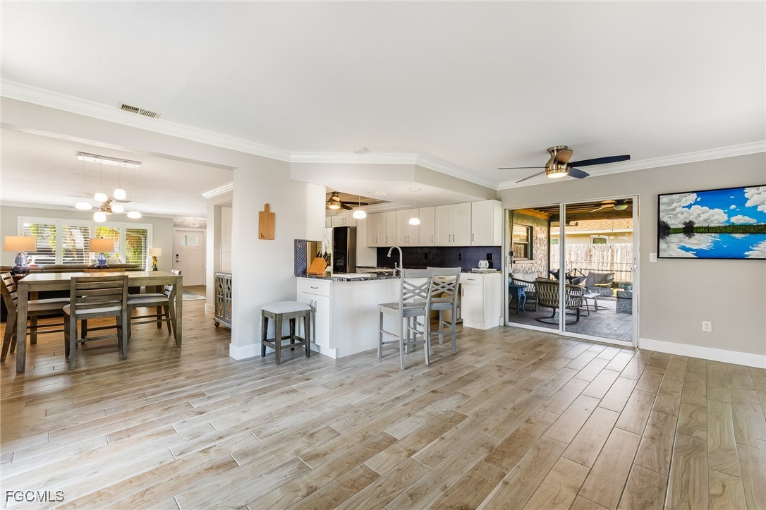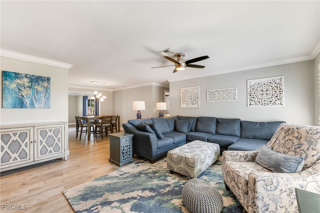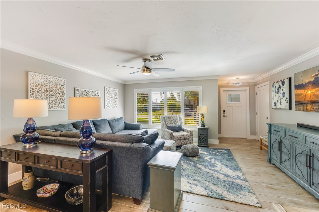 Experience The Best in Florida Living with this beautifully updated residence set in Cape Coral’s sought after Country Club section, close to everything. Thoughtful design and casual elegance define every space, beginning with the home’s impressive chef’s kitchen—expertly appointed with high-end finishes, expansive prep areas, and seamless flow for entertaining. Sunlight fills the open living areas, where contemporary upgrades blend effortlessly with warm, inviting style featuring wood-plank tile flooring, plantation shutters, and crown molding. Step through large sliders to the spacious screened lanai, an ideal retreat for morning coffee or evening gatherings. Beyond, the fully fenced backyard offers a private outdoor sanctuary complete with a paved patio and surrounded by lush, tropical landscaping that enhances both beauty and serenity. With its sophisticated updates, prime location, and indoor–outdoor lifestyle, this exceptional home captures the essence of elevated Gulf Coast living!